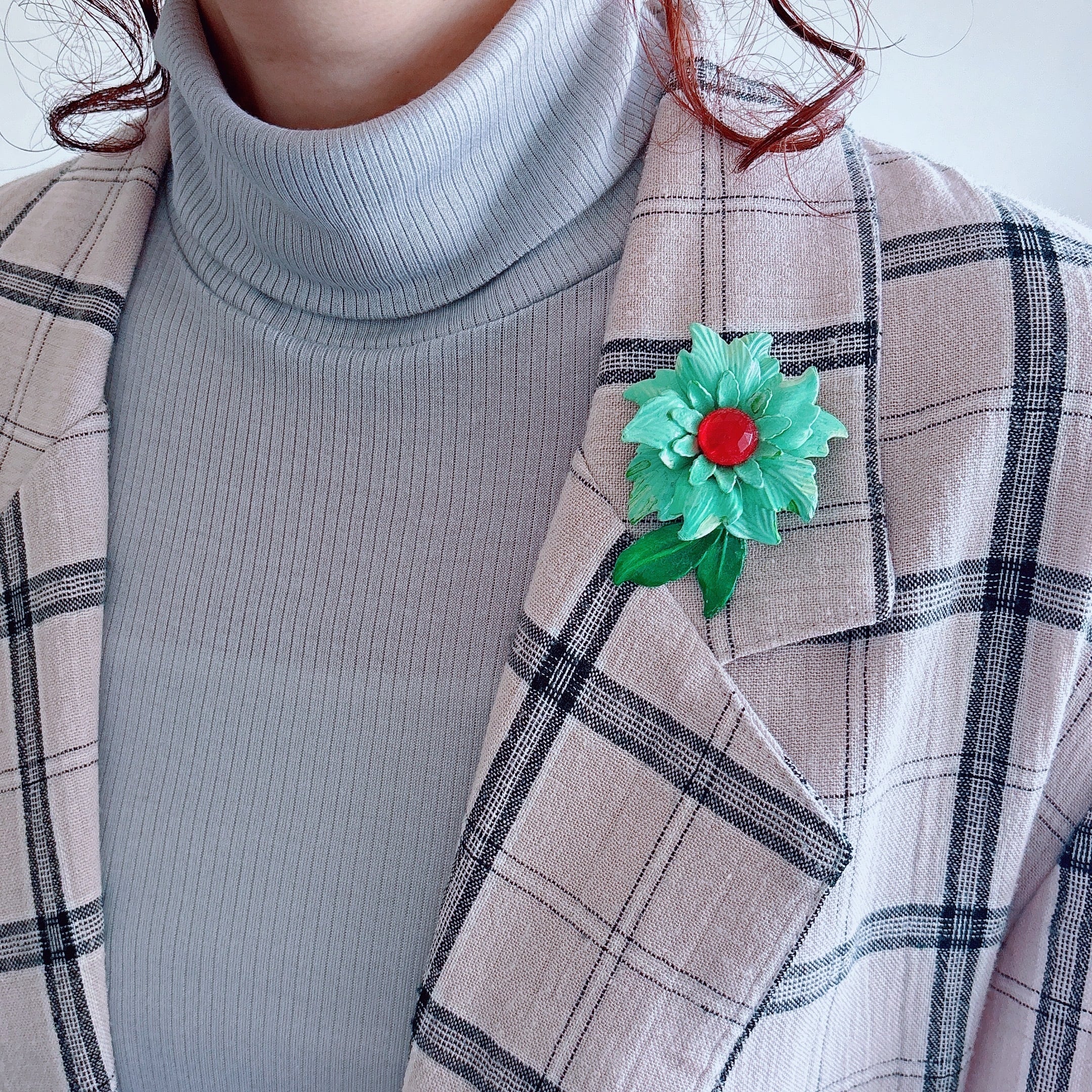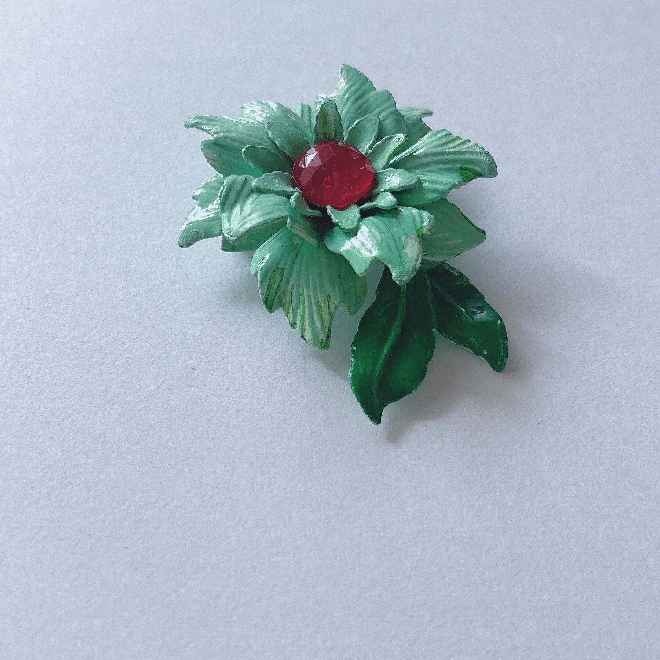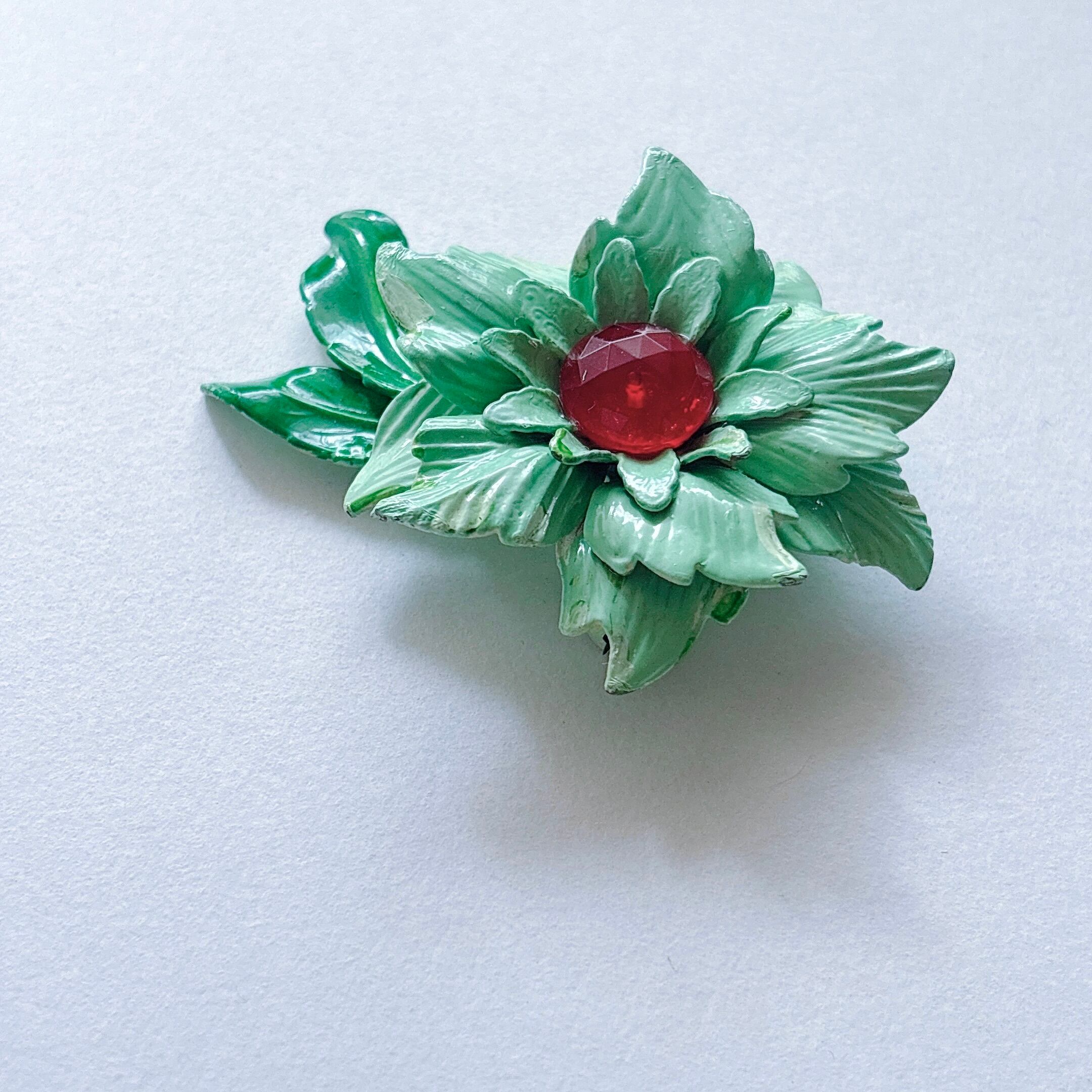 Vintage 60s - 70s green enamel red cabochon flower brooch ヴィンテージ 60年代 - 70年代 グリーン エナメル レッド カボション フラワー 花 ブローチ | OBAKEPEACH