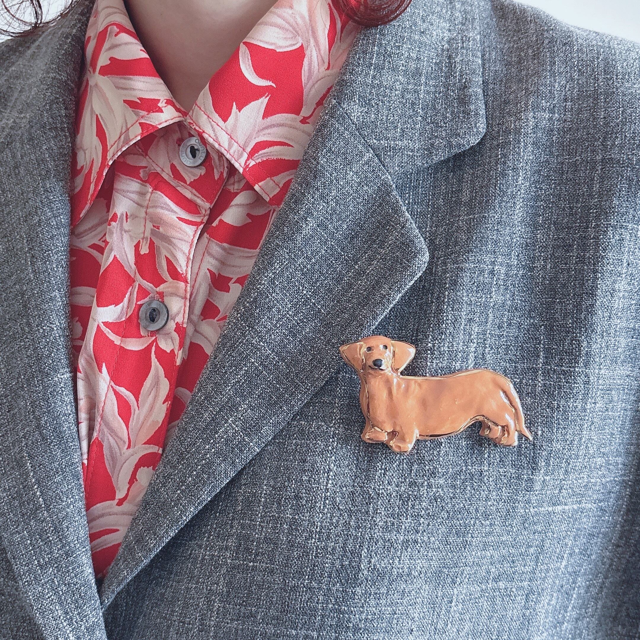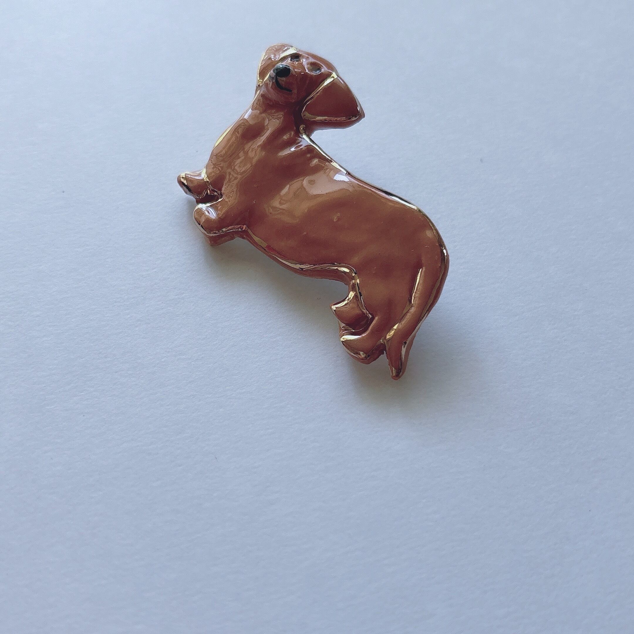 Vintage ceramic brown gold dachshund dog brooch ヴィンテージ セラミック 陶器 ブラウン ゴールド ダックスフンド 犬 ブローチ