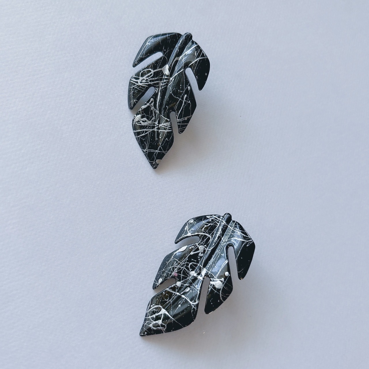Vintage 80s black enamel silver tone paint leaf earrings ヴィンテージ 80年代 ブラック エナメル シルバートーン ペイント リーフ 葉っぱ ピアス | OBAKEPEACH