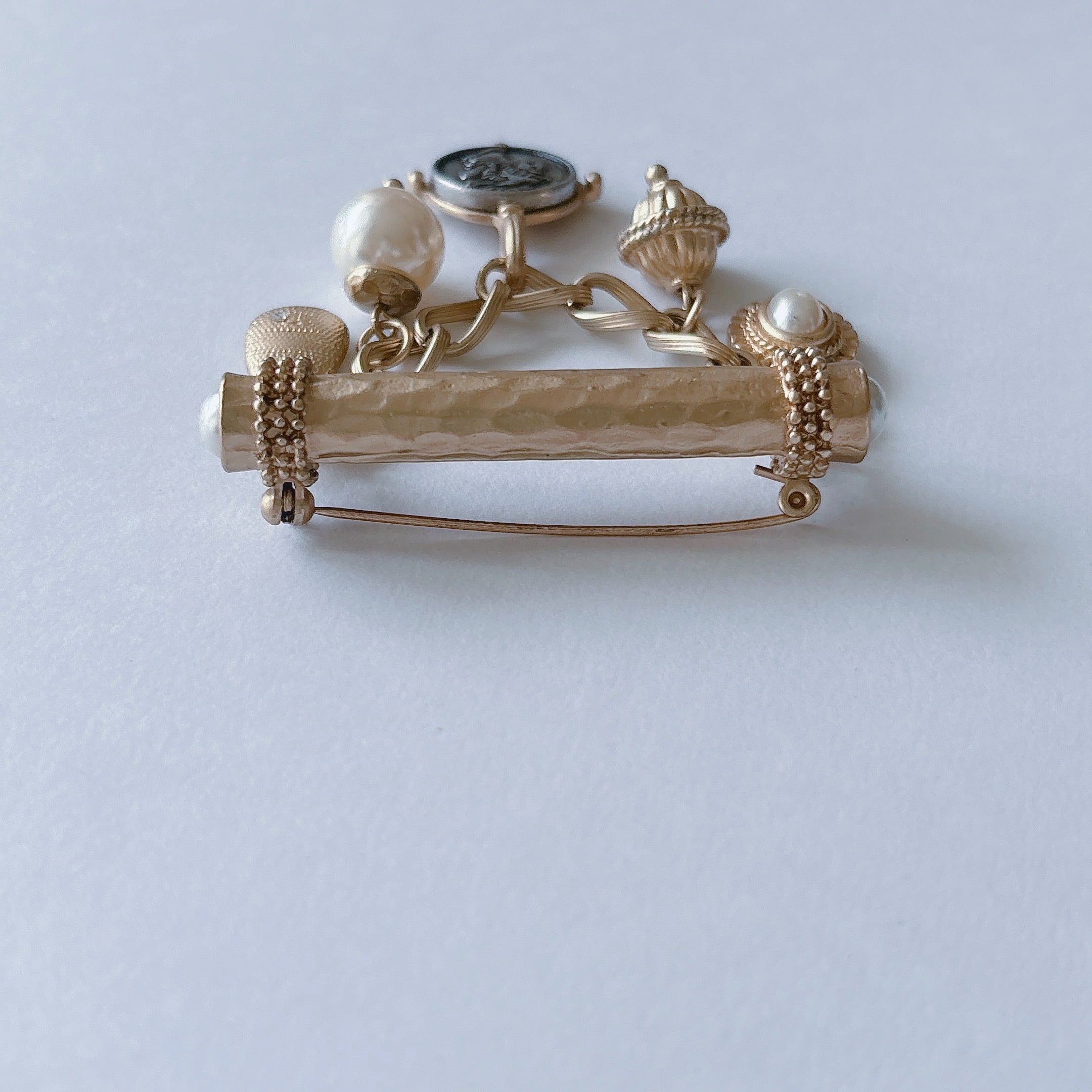 Vintage gold tone coin faux pearl charm dangle brooch ヴィンテージ ゴールドトーン フェイクパール コイン チャーム ダングル ブローチ