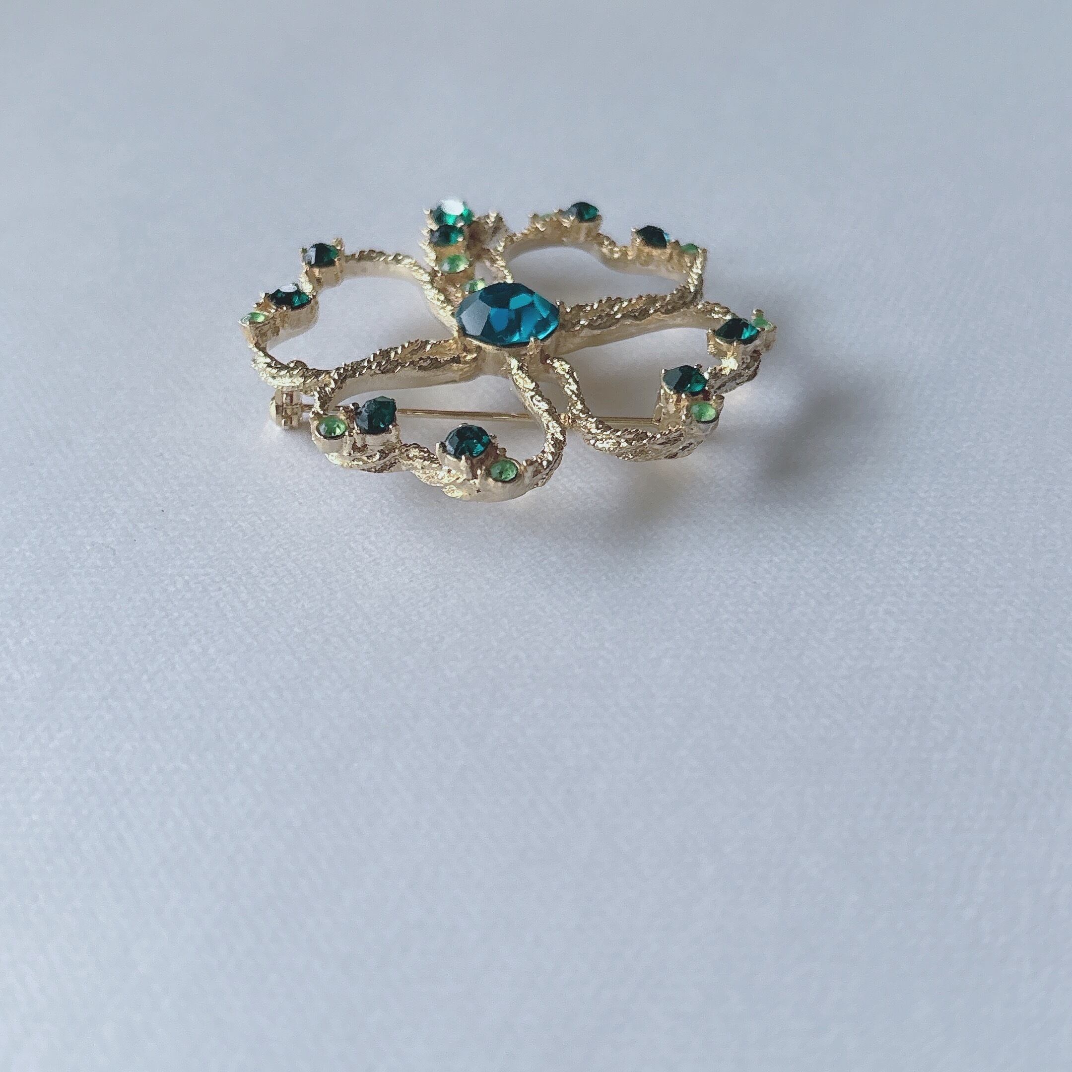 Vintage gold tone green rhinestone clover shamrock brooch ヴィンテージ ゴールドトーン グリーン ラインストーン シャムロック 四つ葉 クローバー ブローチ | OBAKEPEACH