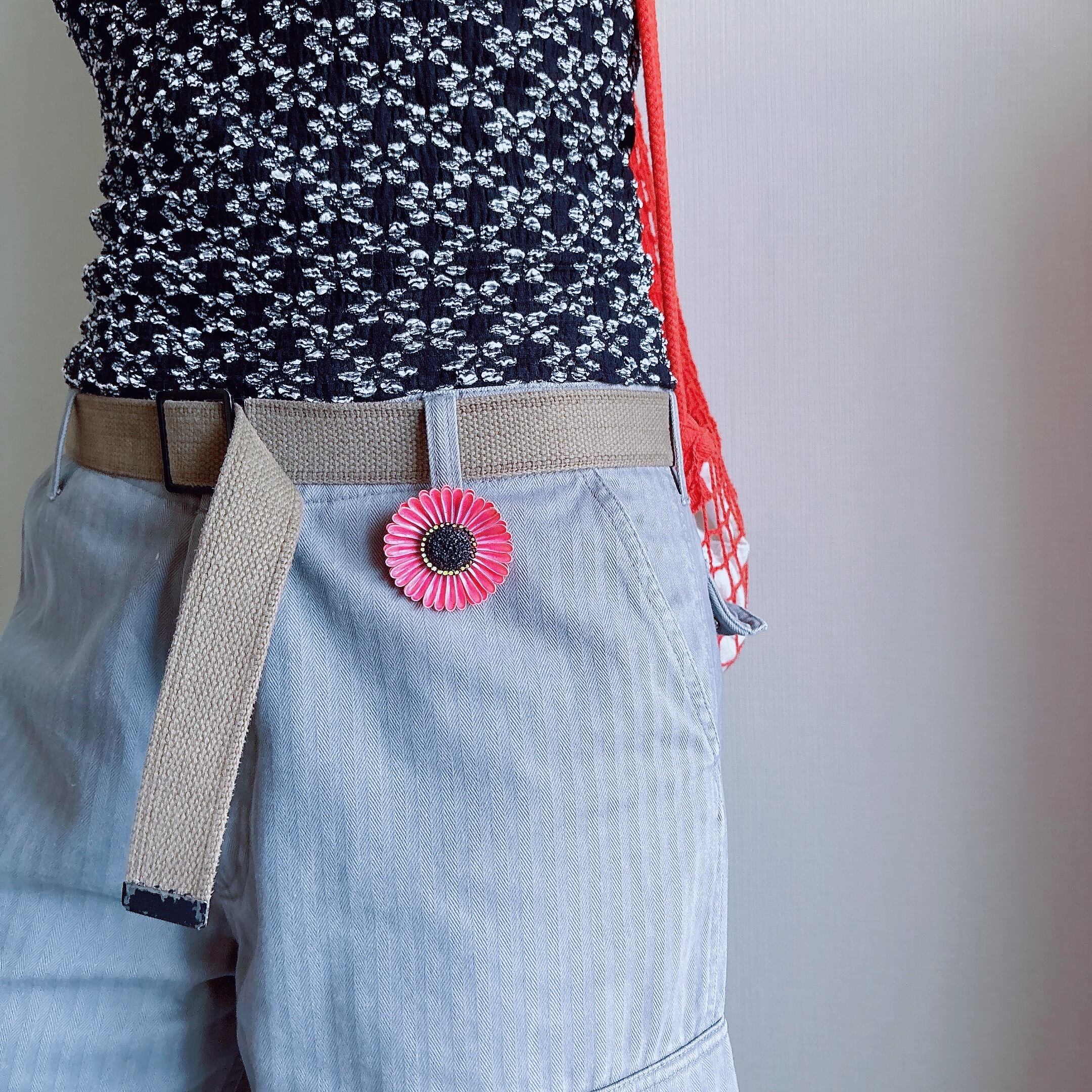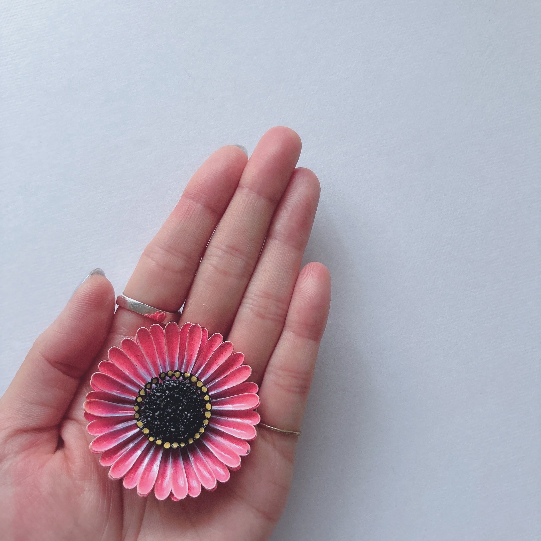メタル素材にピンクのエナメルで色付けした花のデザイン。