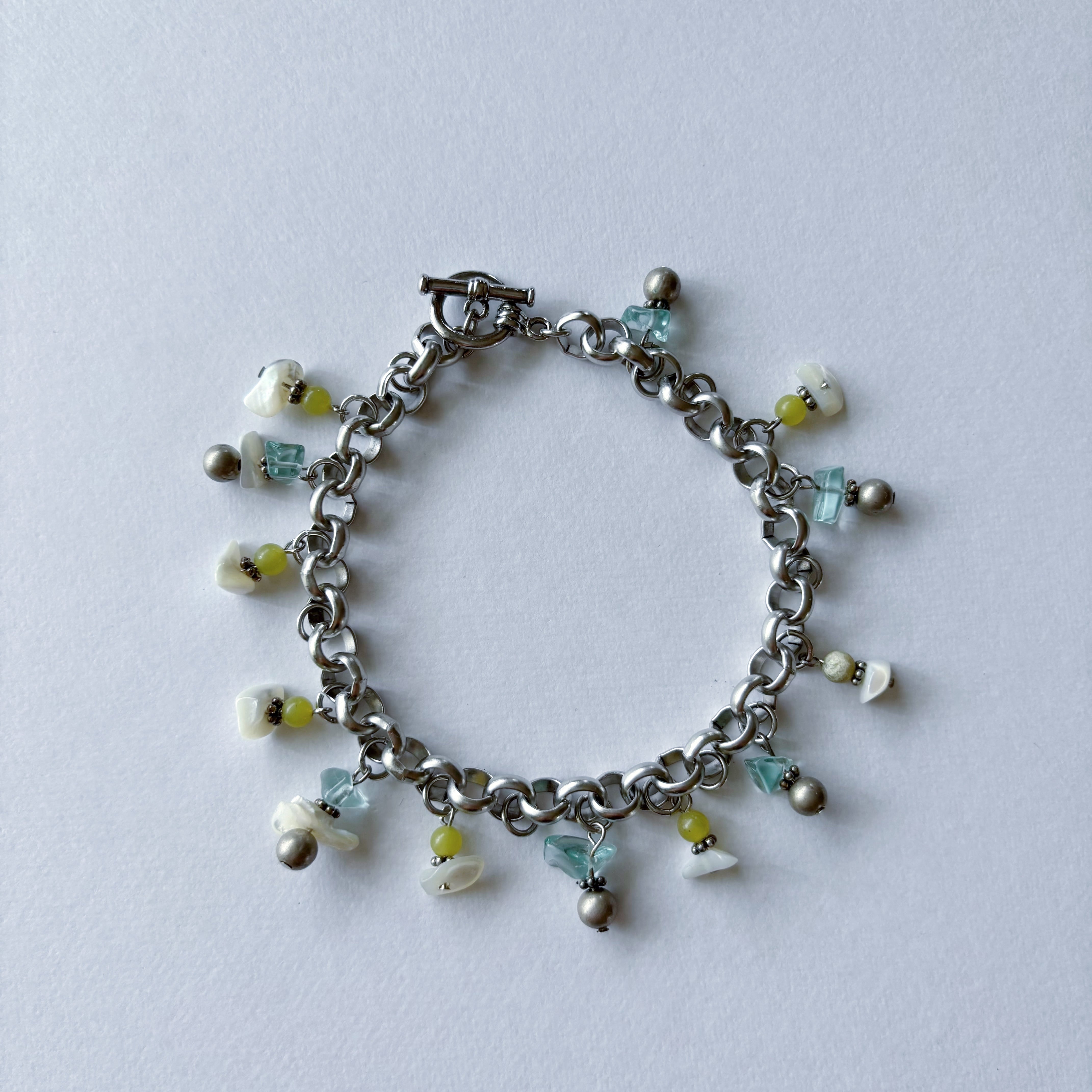 Vintage 80s - 90s silver tone mother of pearl blue yellow glass beads bracelet ヴィンテージ 80年代 - 90年代 シルバートーン マザーオブパール ブルー イエロー ガラスビーズ ブレスレット | OBAKEPEACH