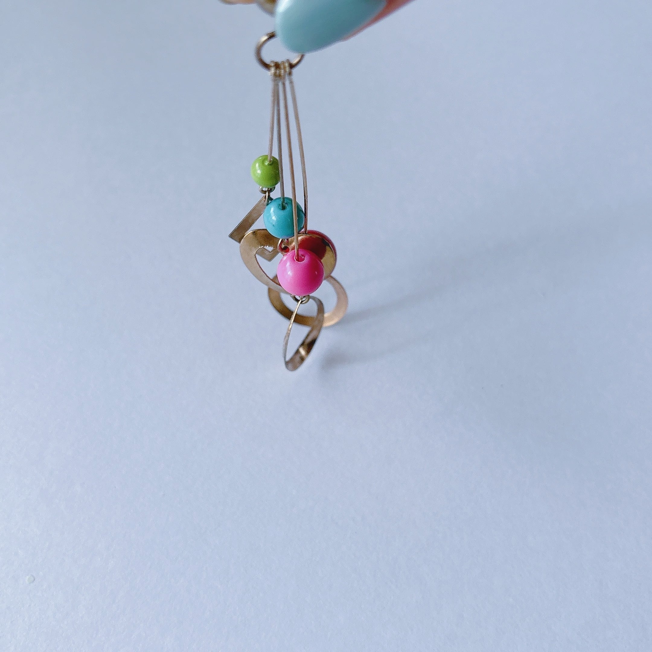 カラフルなビーズと、ゴールドメタルのハートやドロップなど異なる形のメタルパーツが連なったデザイン。
