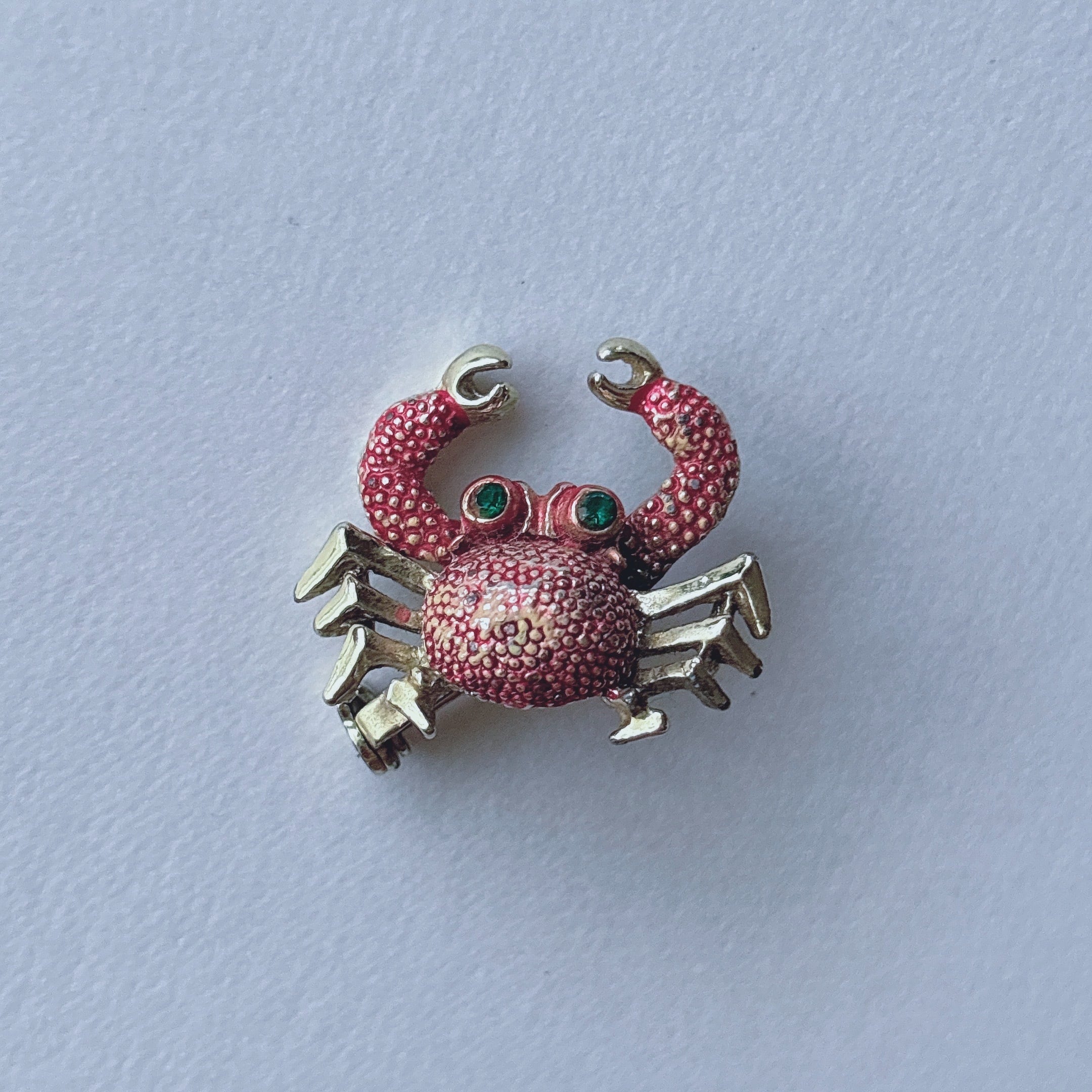 ゴールドメタルにレッドのエナメルとグリーンの目が愛らしいカニのデザイン。