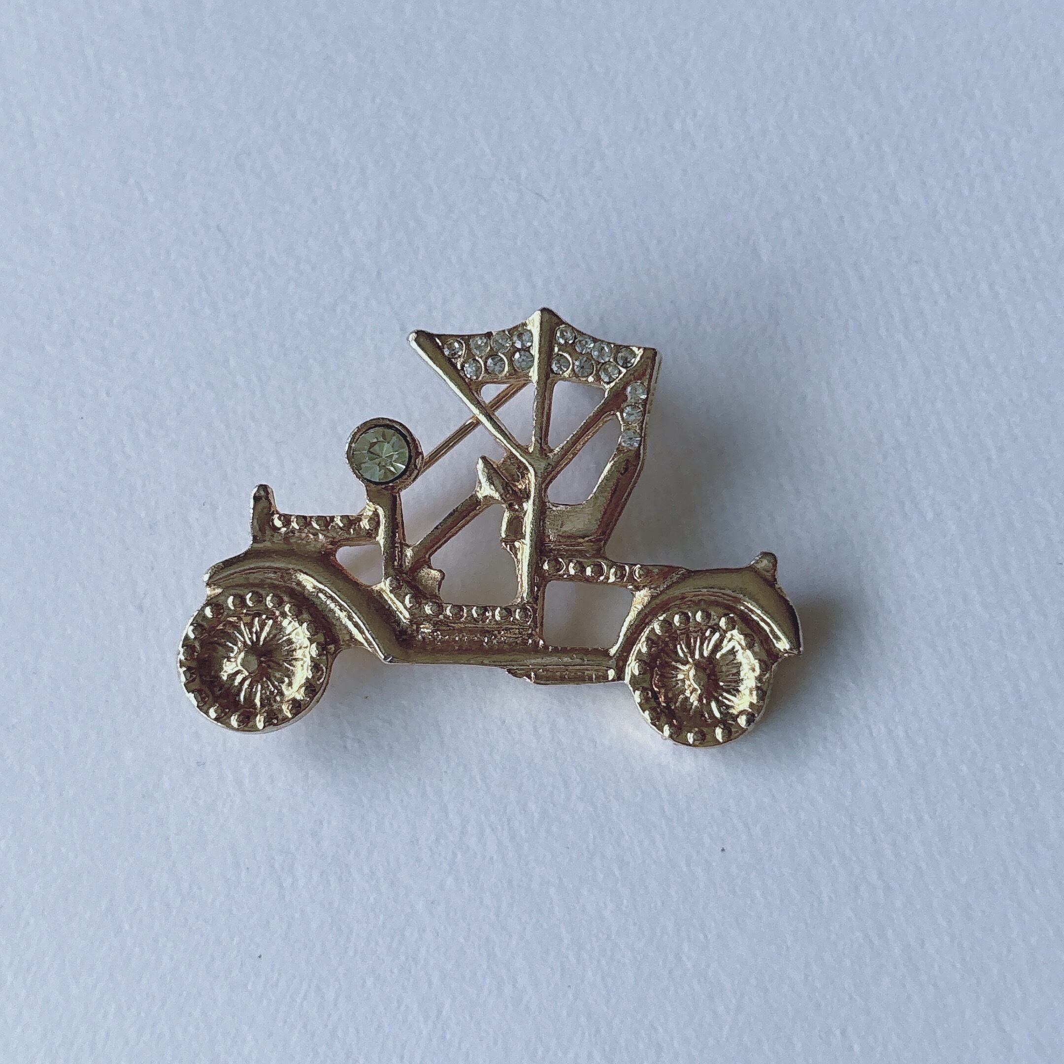 Vintage gold tone classic car automobile clear rhinestone brooch ヴィンテージ ゴールドトーン クラシックカー 車 ブローチ | OBAKEPEACH