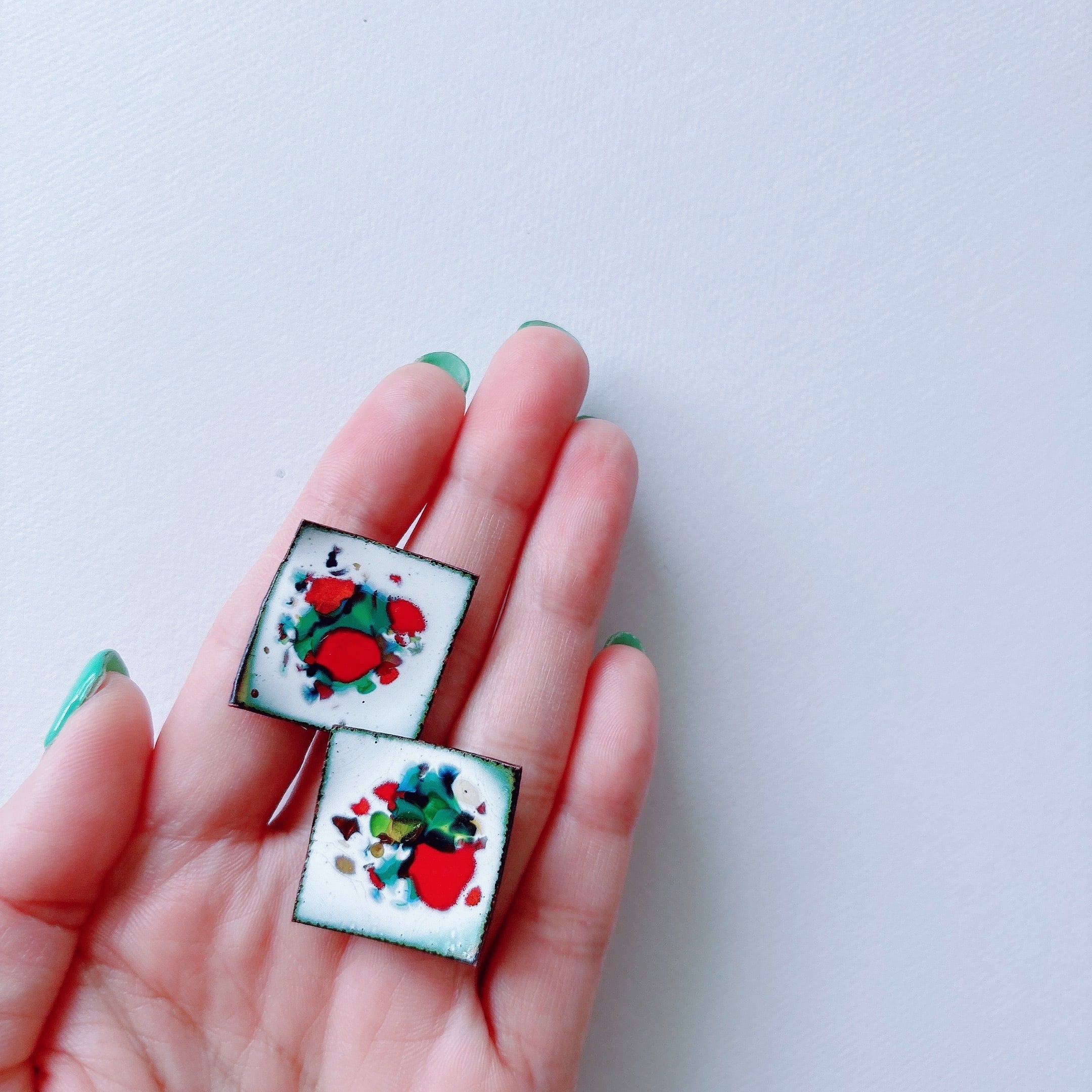 Vintage 50s - 60s copper white red green enamel paint square earrings ヴィンテージ 50年代 - 60年代 コッパー カッパー 銅 ホワイト レッド グリーン エナメル ペイント スクエア 四角 イヤリング | OBAKEPEACH