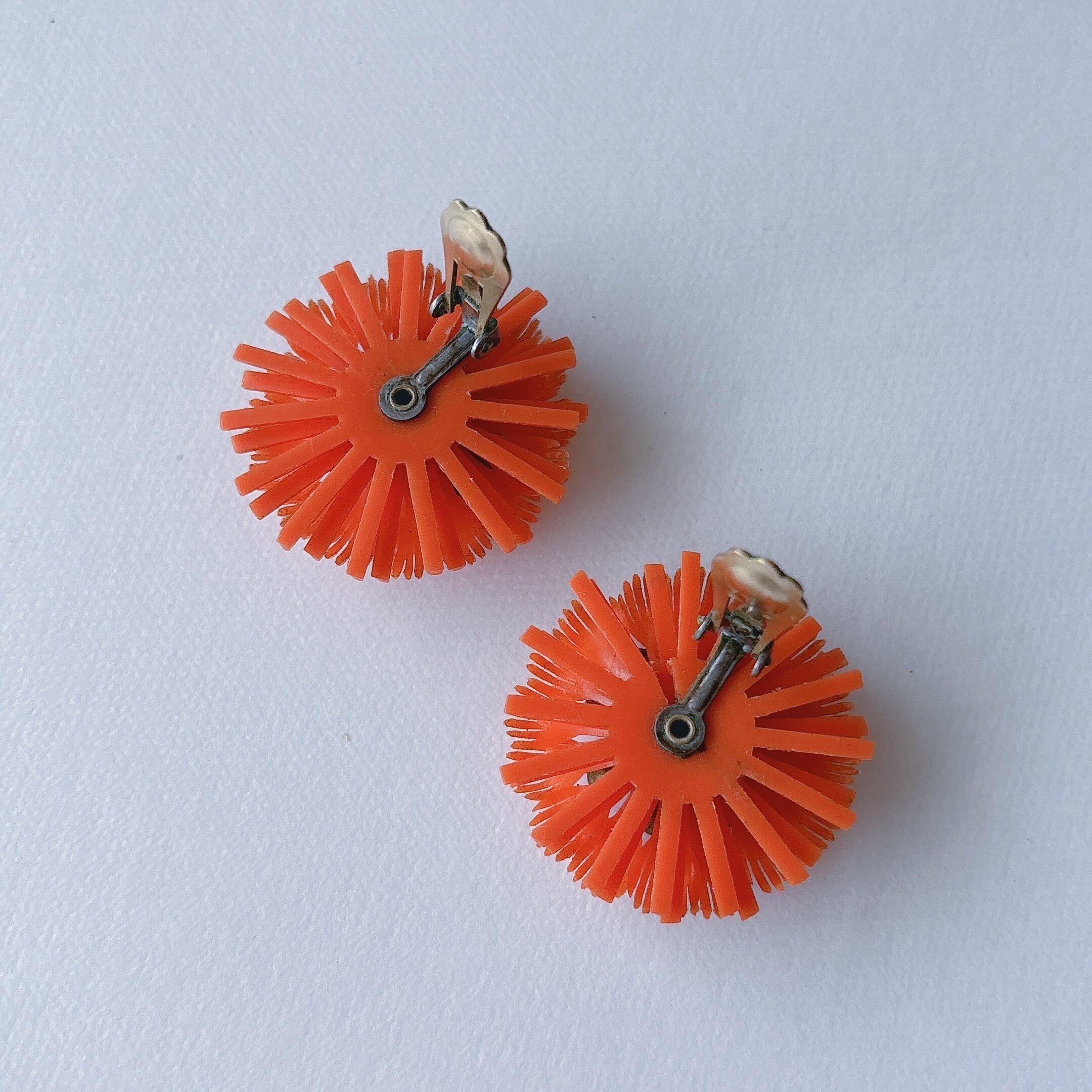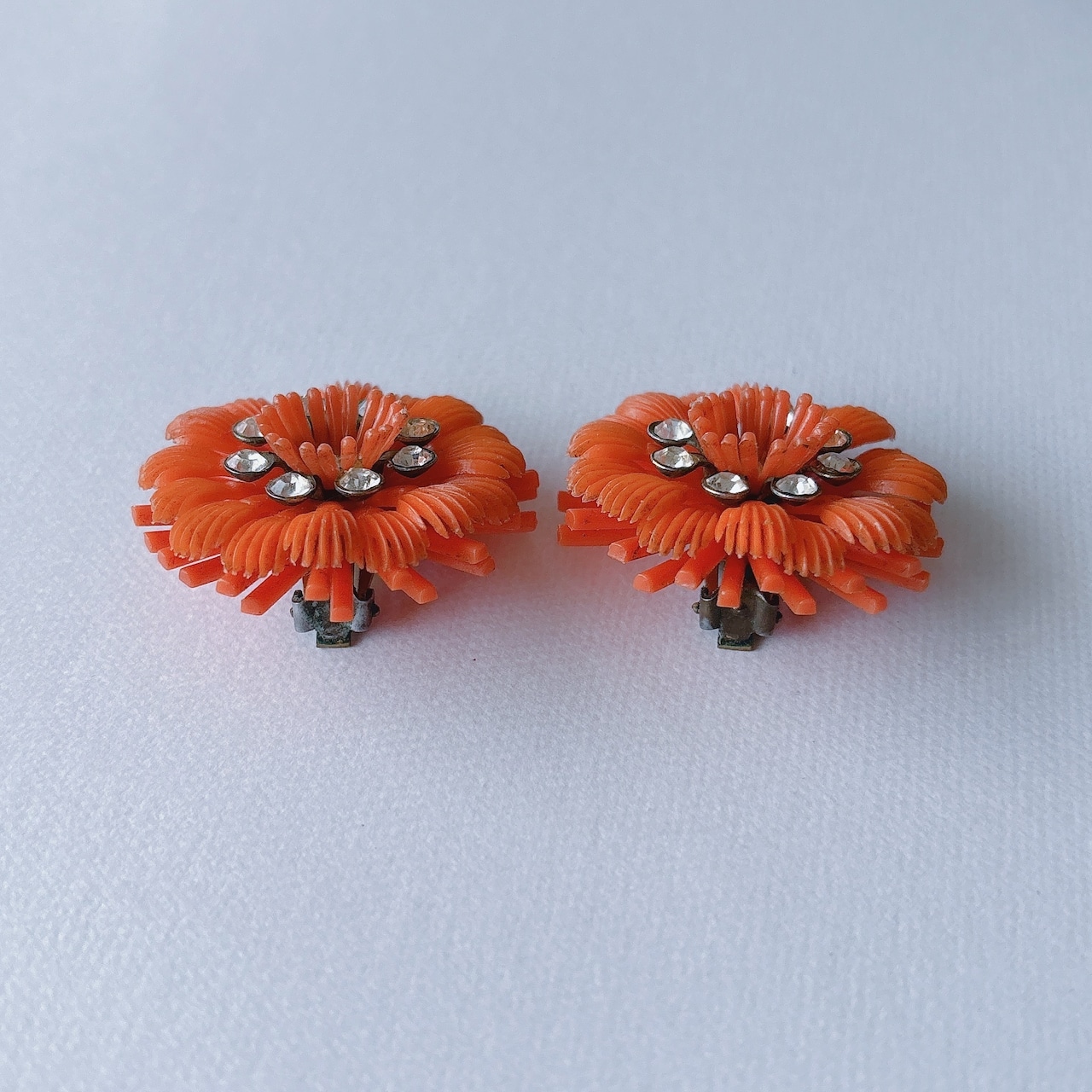 Vintage 50s - 60s orange soft plastic clear rhinestone flower earrings ヴィンテージ 50年代 - 60年代 オレンジ ソフト プラスチック クリア ラインストーン フラワー 花 イヤリング | OBAKEPEACH