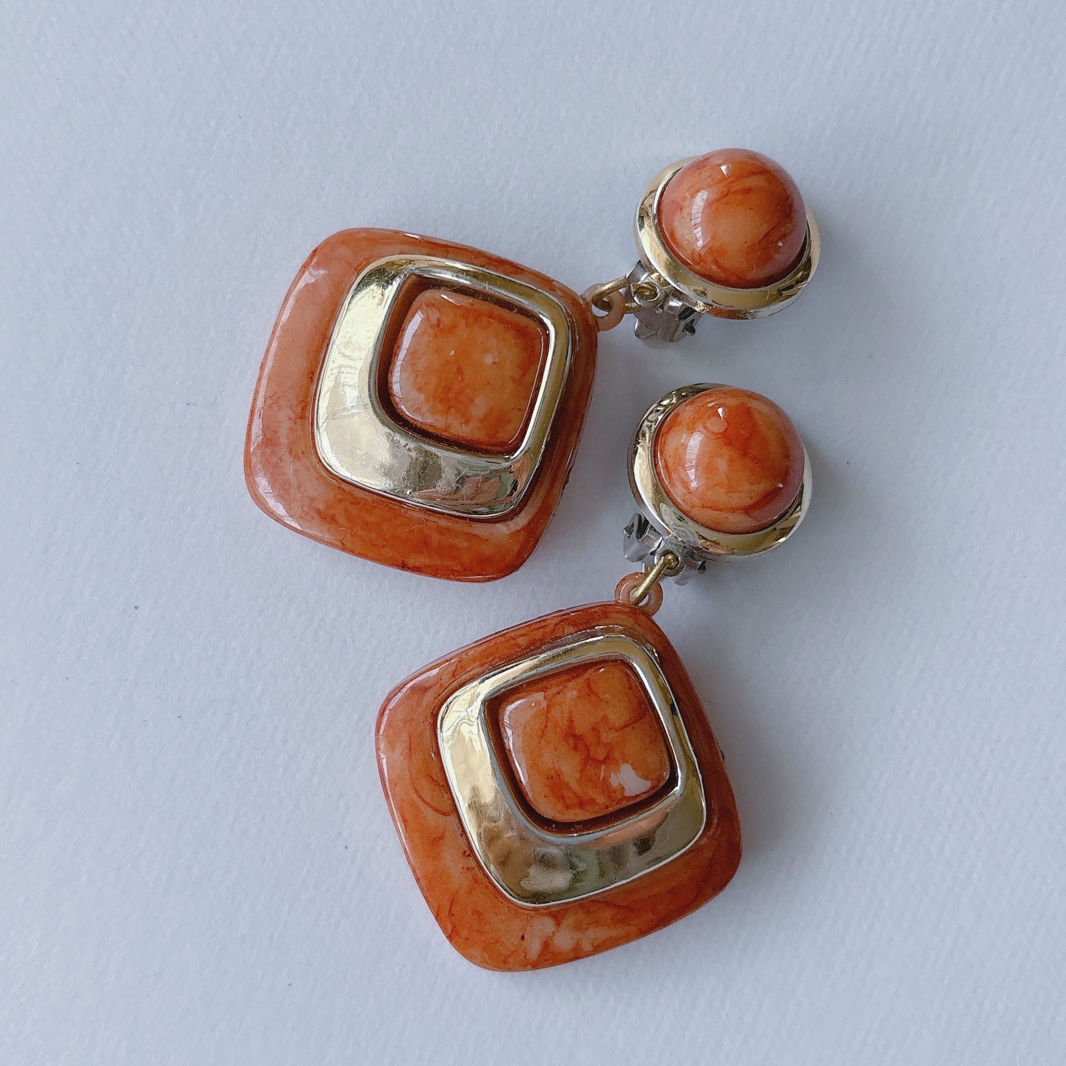 Vintage 80s orange marble gold plastic square dangle earrings ヴィンテージ 80年代 オレンジ マーブル模様 ゴールドトーン マーブル模様 スクエア 四角 ダングル イヤリング | OBAKEPEACH