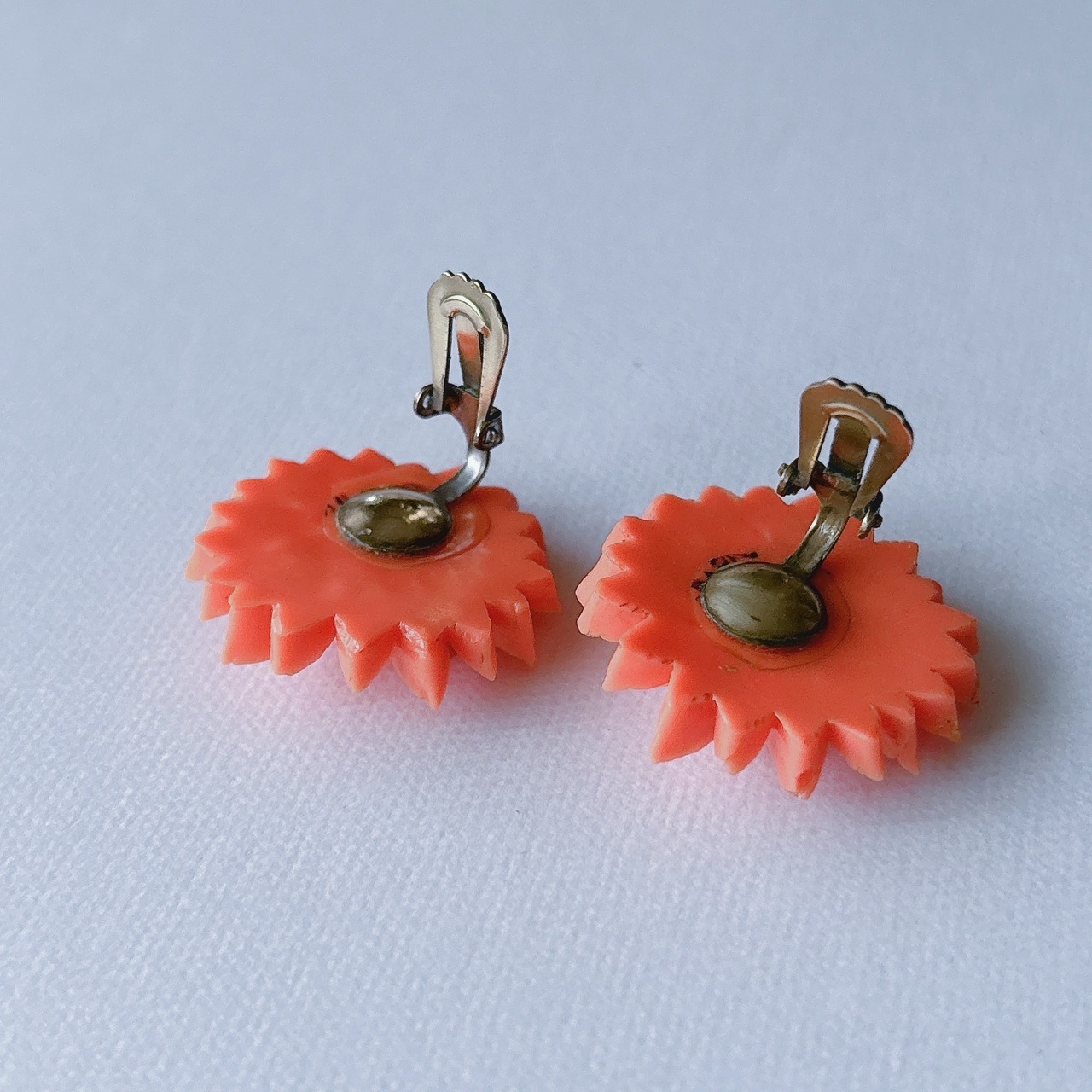 Vintage 50s - 60s orange coral celluloid clear rhinestone flower earrings ヴィンテージ 50年代 - 60年代 オレンジ セルロイド コーラル クリア ラインストーン フラワー 花 イヤリング | OBAKEPEACH