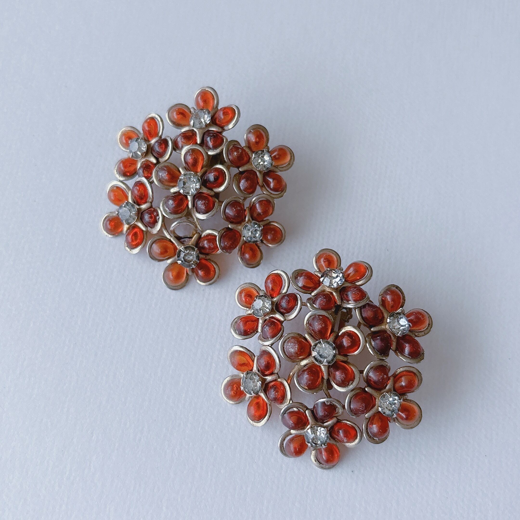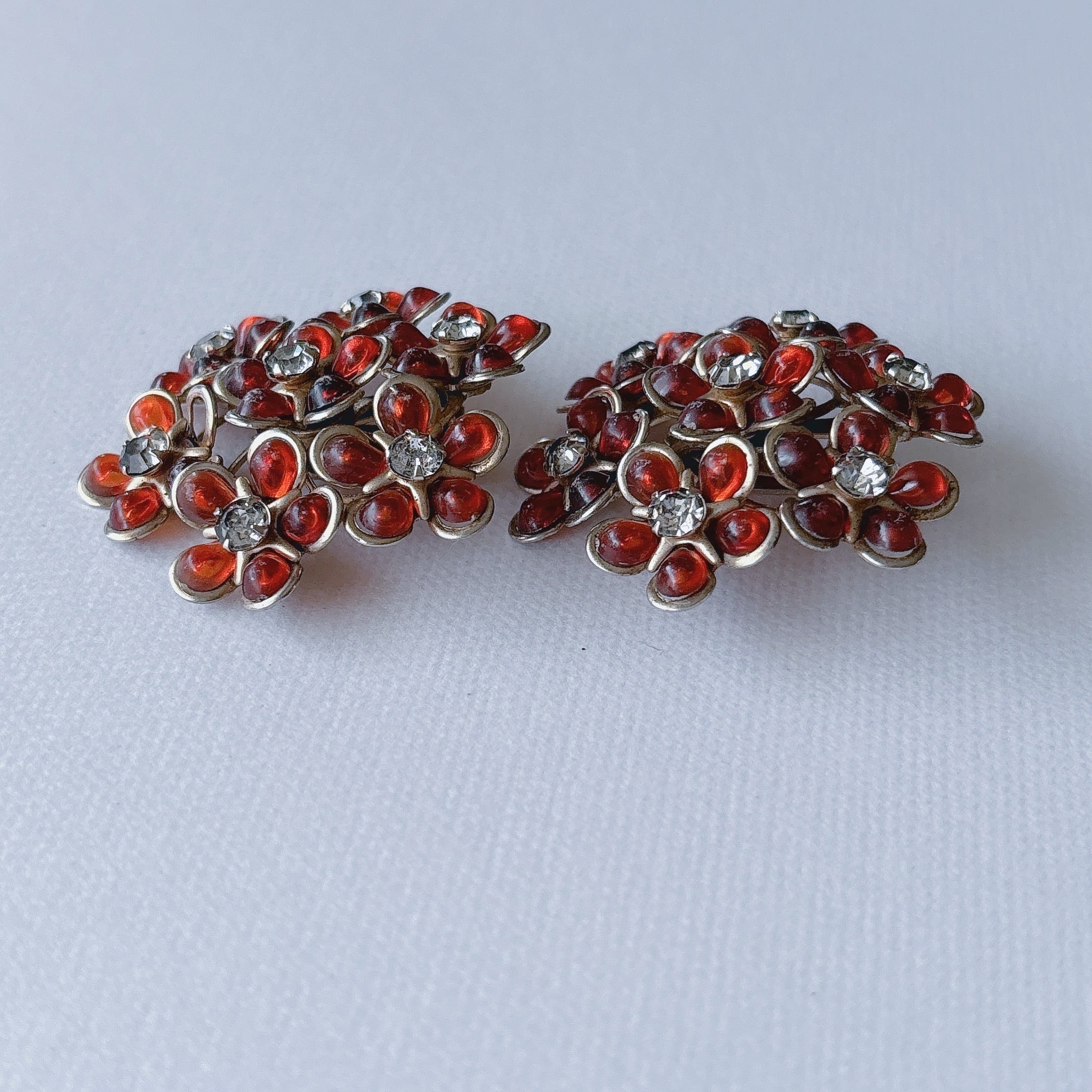 Vintage 50s - 60s gold tone orange plastic clear rhinestone flower earrings ヴィンテージ 50年代 - 60年代 ゴールドトーン オレンジ プラスチック クリア ラインストーン フラワー 花 イヤリング | OBAKEPEACH