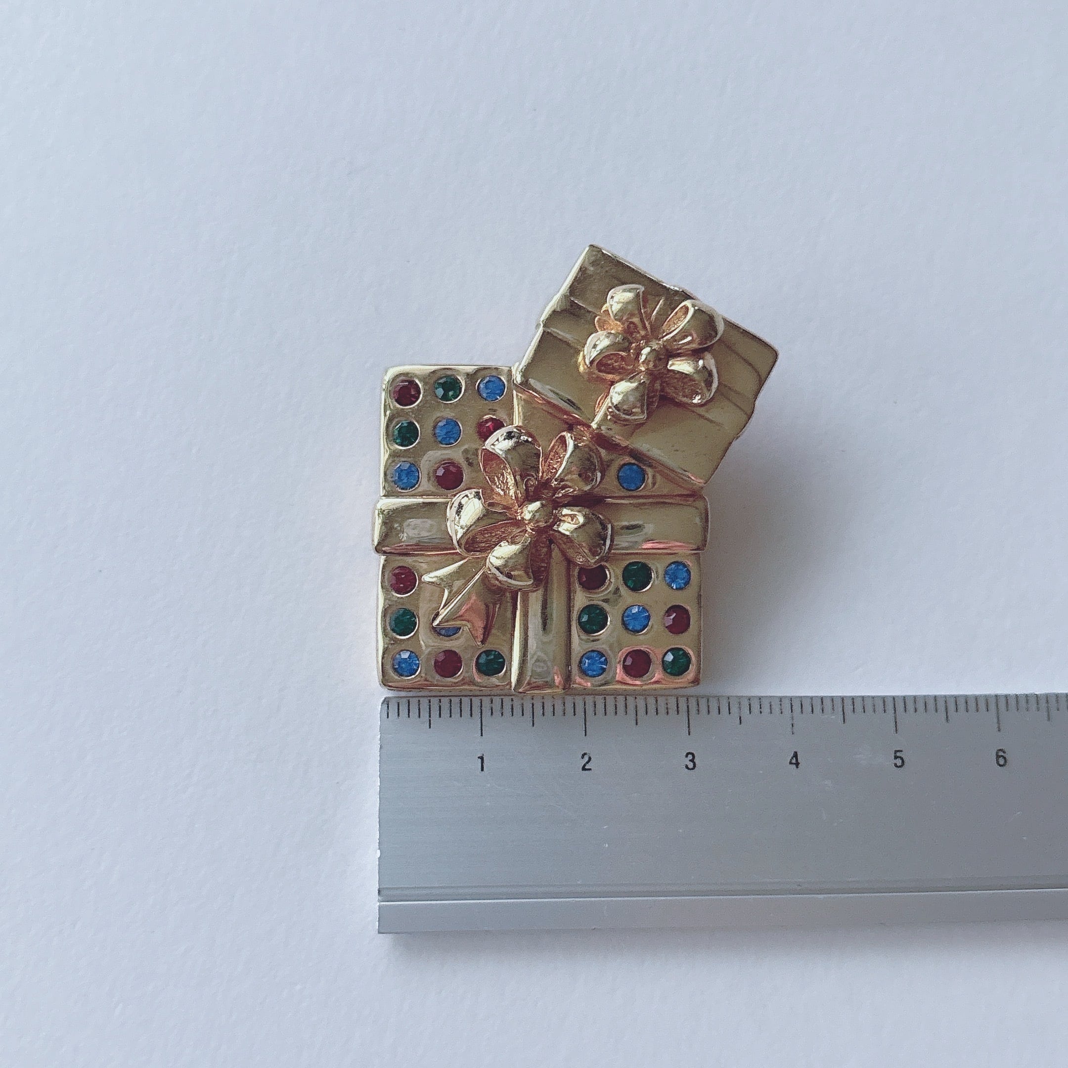 SAVVY Vintage 80s - 90s ENGLAND gold tone swarovski red blue green Christmas present gift box brooch ヴィンテージ 80年代 - 90年代 英国製 ゴールドトーン スワロフスキー レッド グリーン ブルー クリスマス プレゼント ギフト ボックス ブローチ