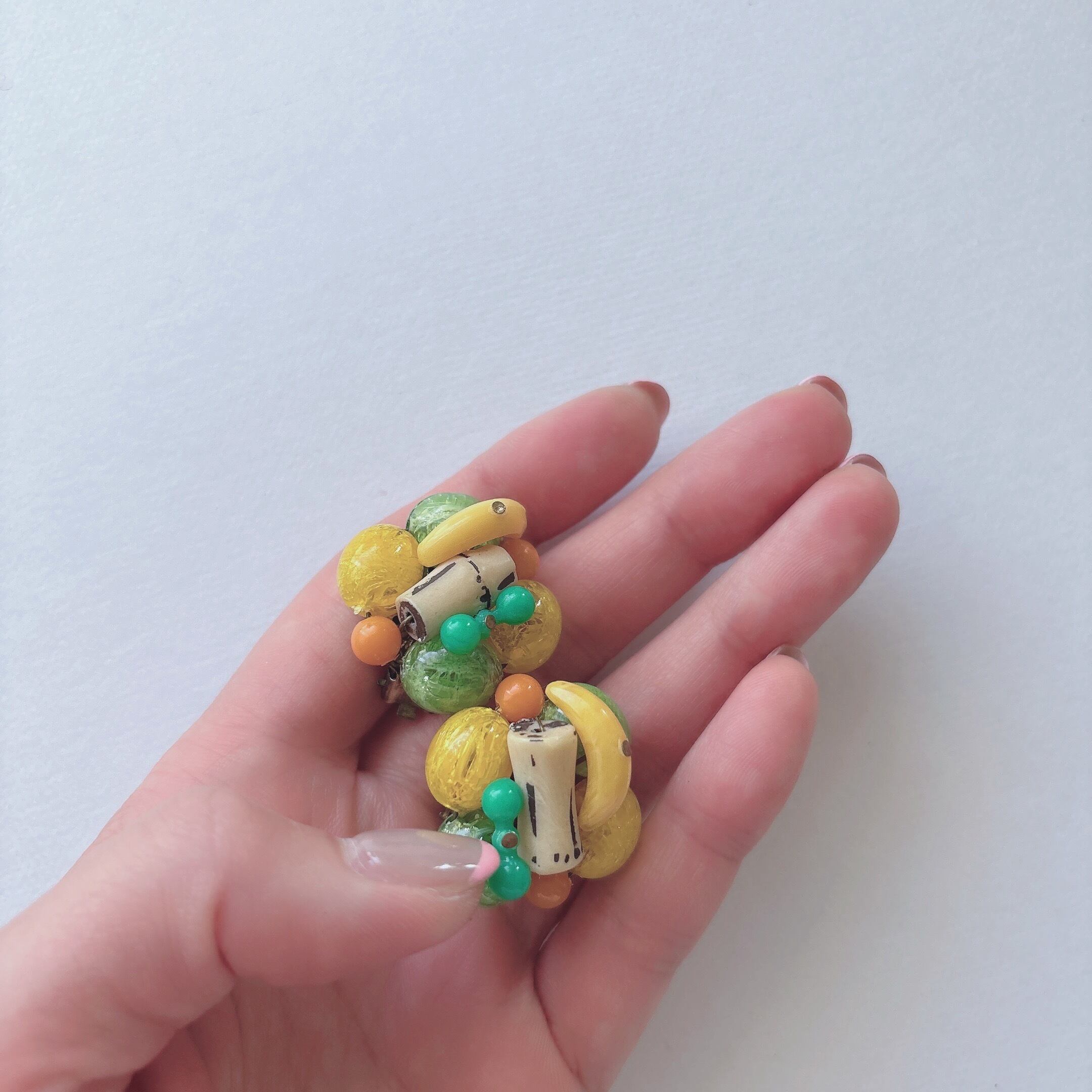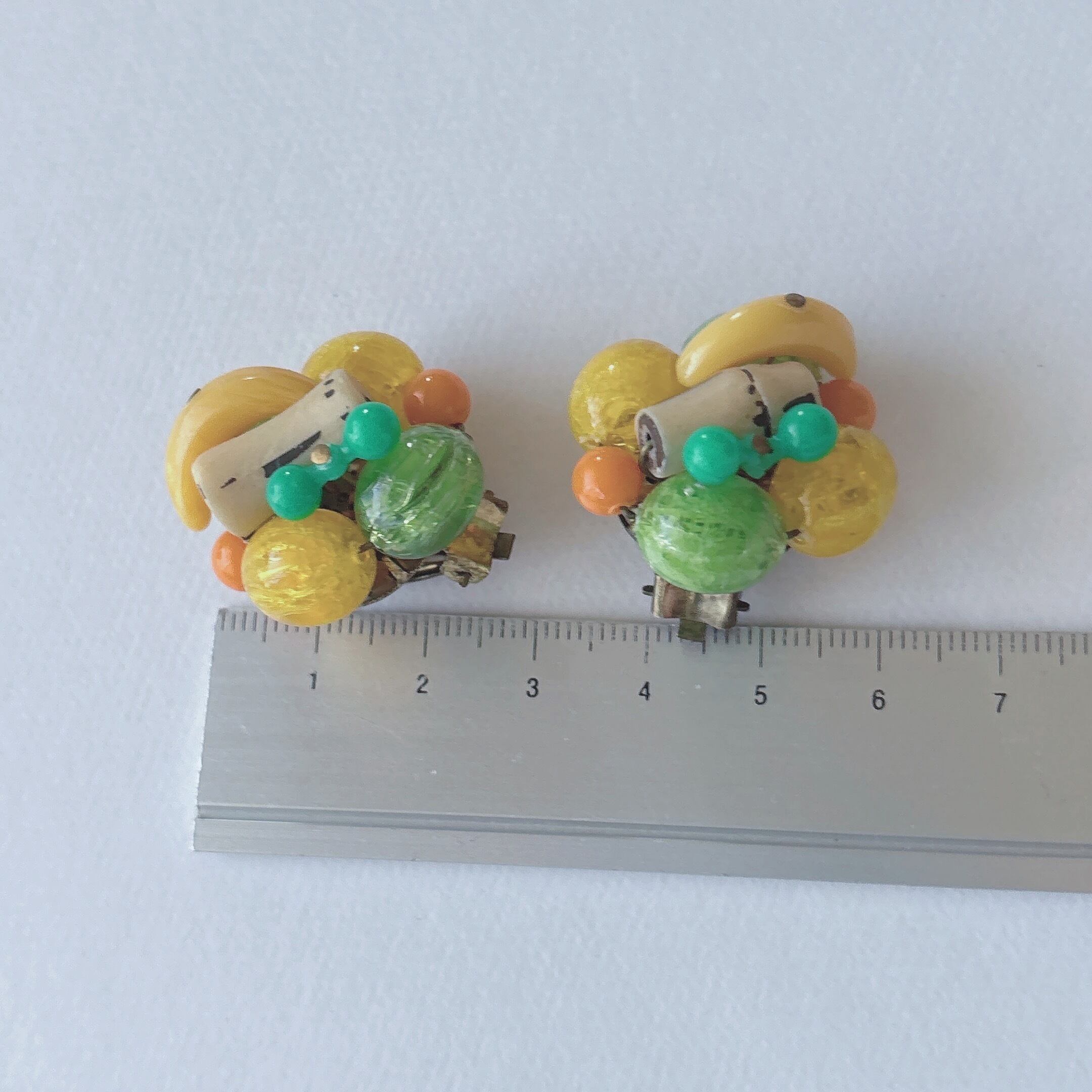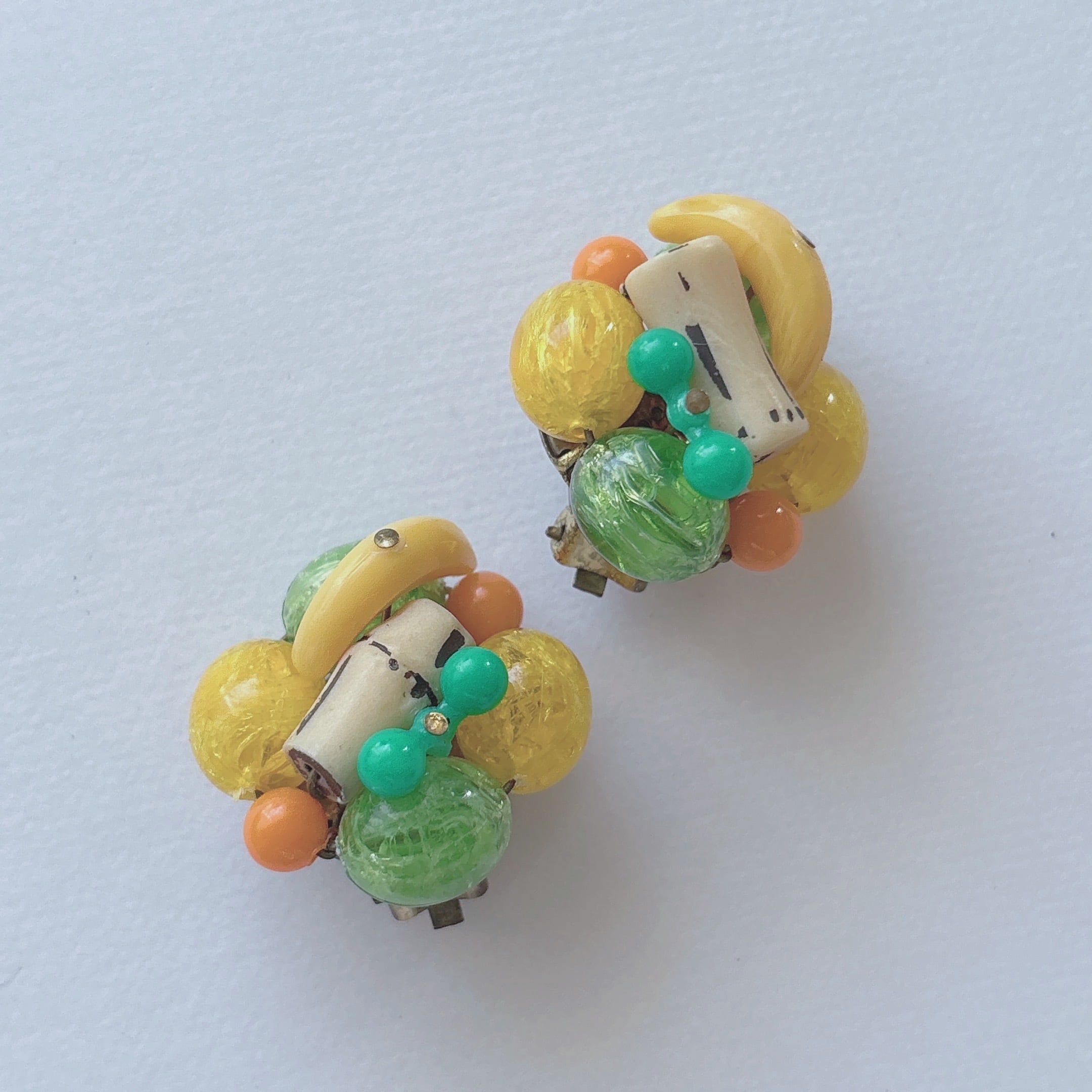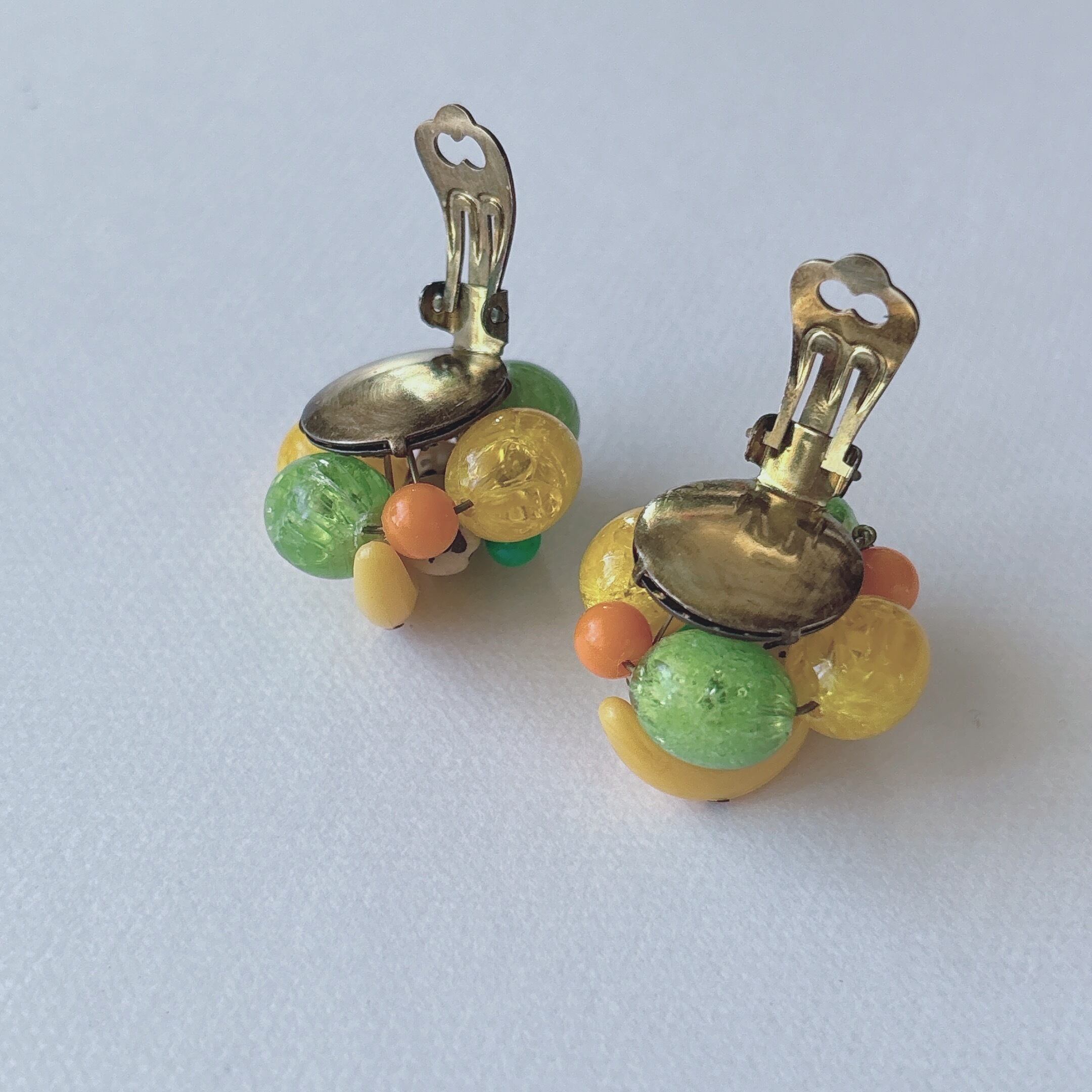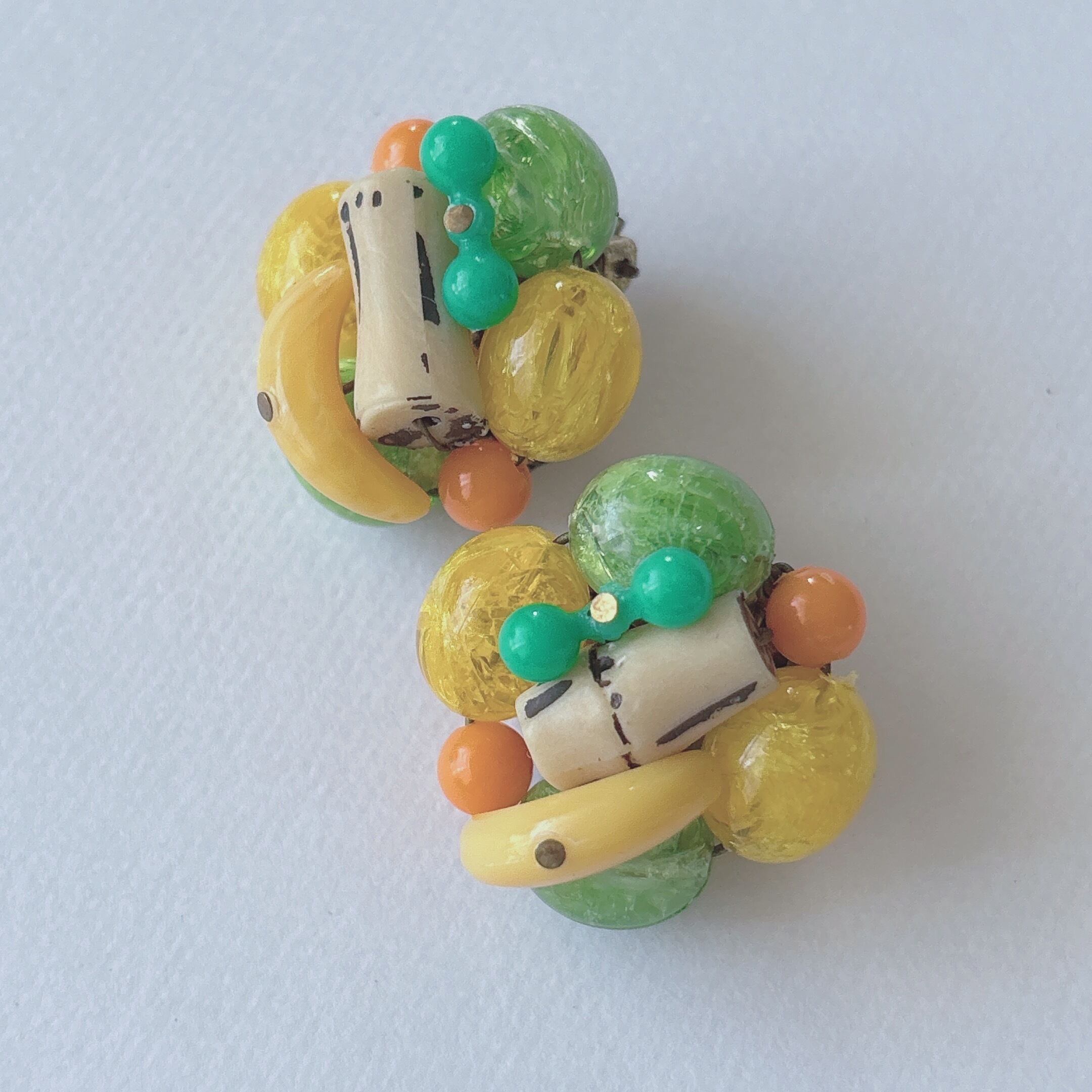 Vintage 50s - 60s WEST GERMANY yellow green orange plastic beads cluster fruits earrings ヴィンテージ 50年代 - 60年代 西ドイツ製 イエロー グリーン オレンジ プラスチック ビーズ クラスター イヤリング