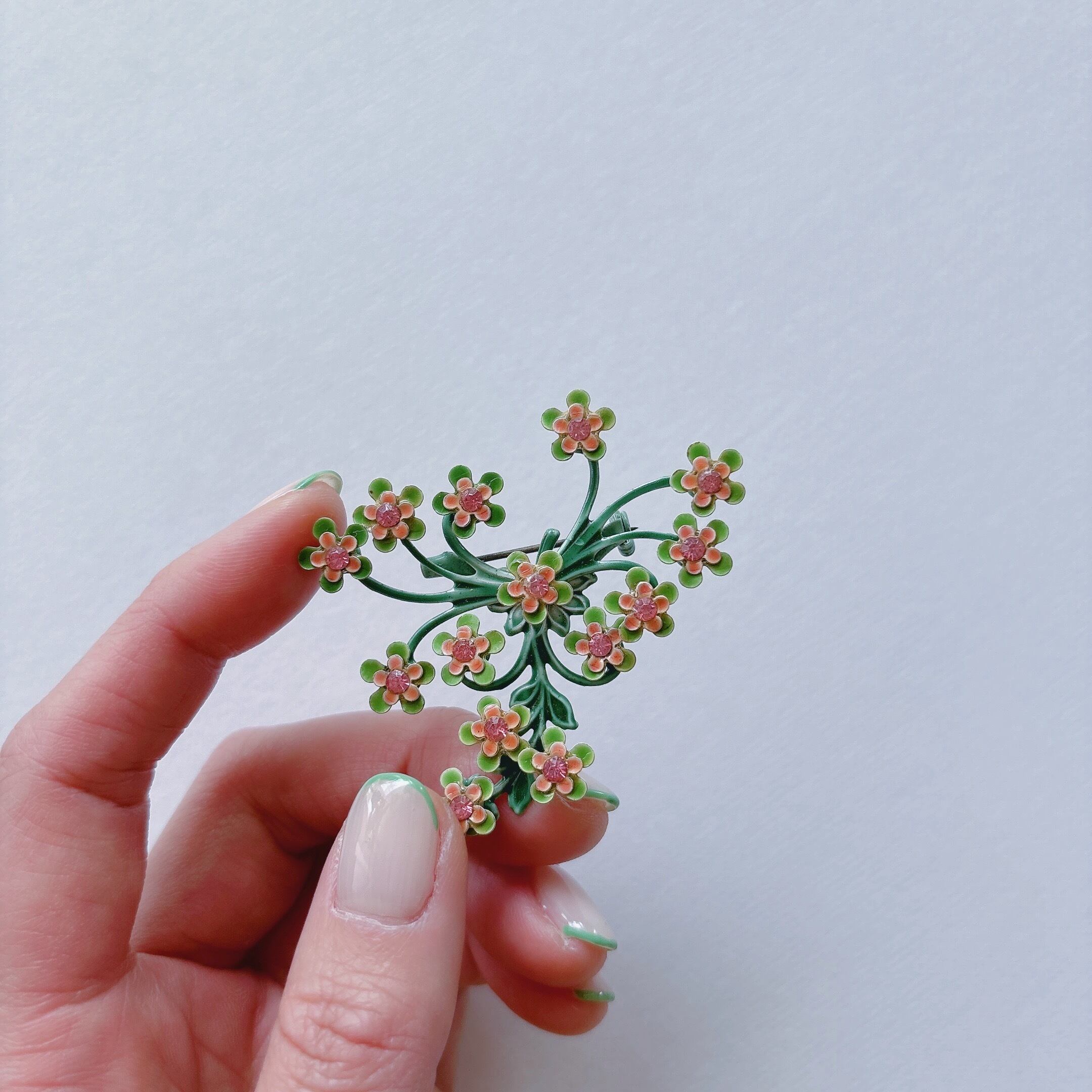 グリーン×ピンクのエナメルの配色がとてもラブリーで、花の中心にはピンクのラインストーンがさりげなく光を反射します。
