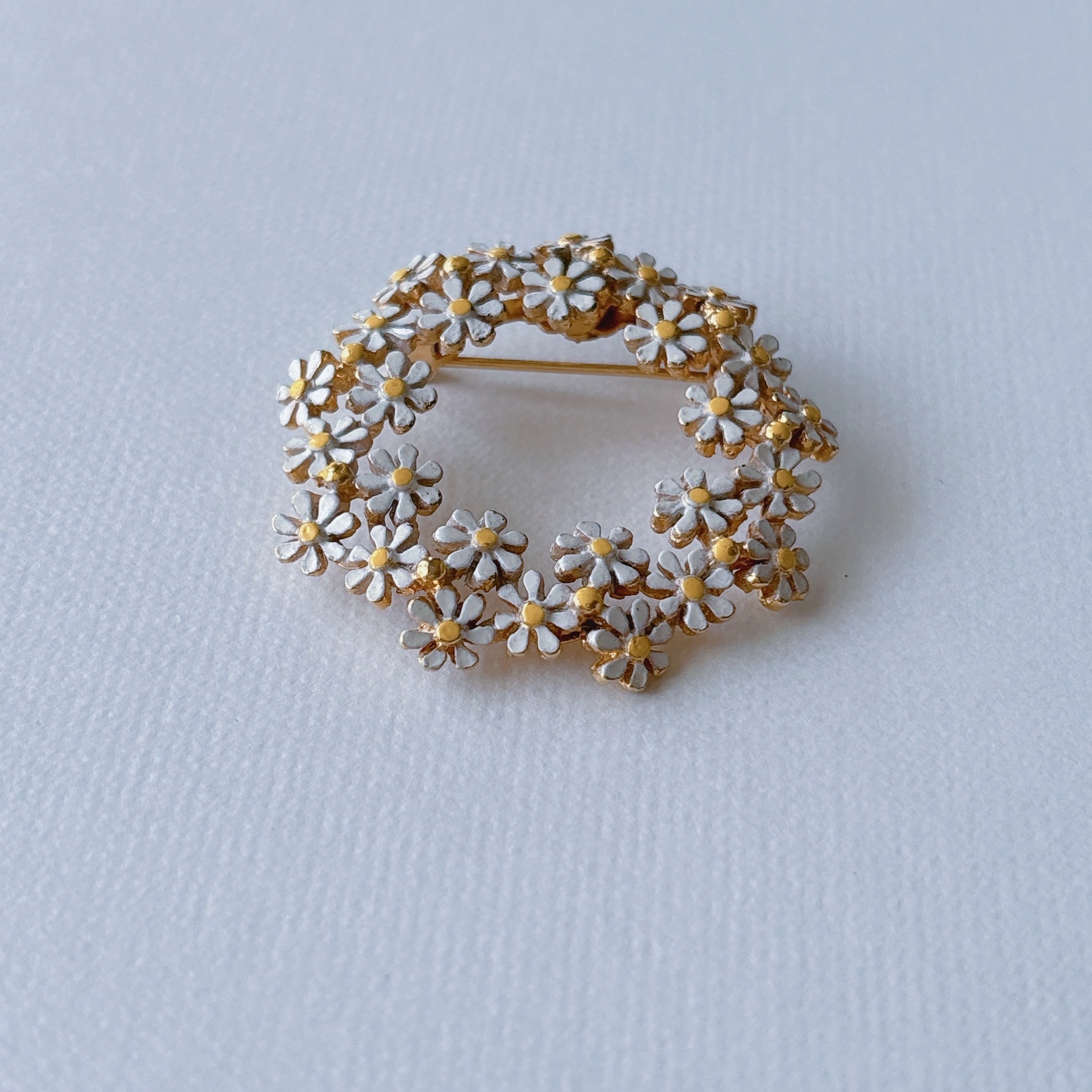WEISS Vintage 60s gold tone white yellow enamel daisy flower wreath brooch ヴィンテージ 60年代 ゴールドトーン ホワイト イエロー エナメル デイジー ひなぎく フラワー 花 リース ブローチ