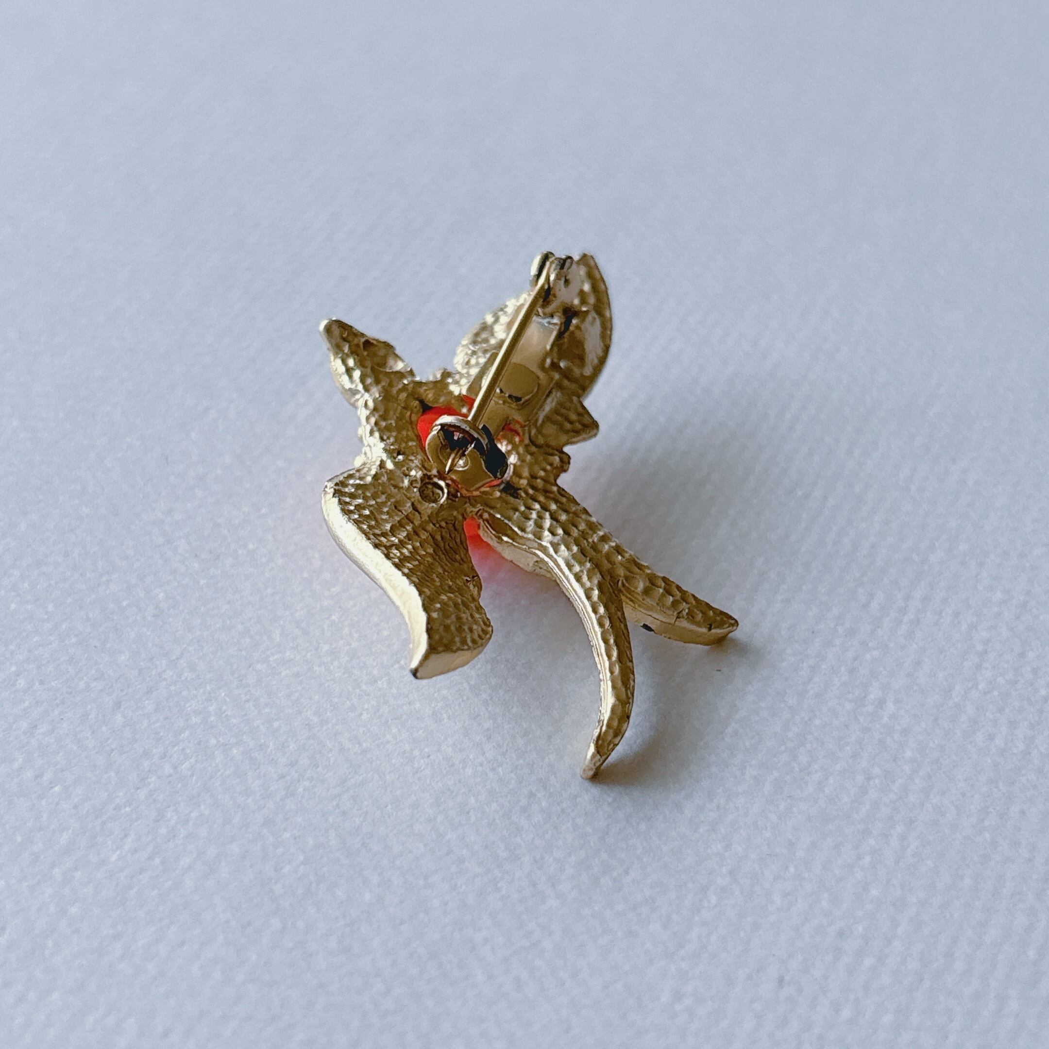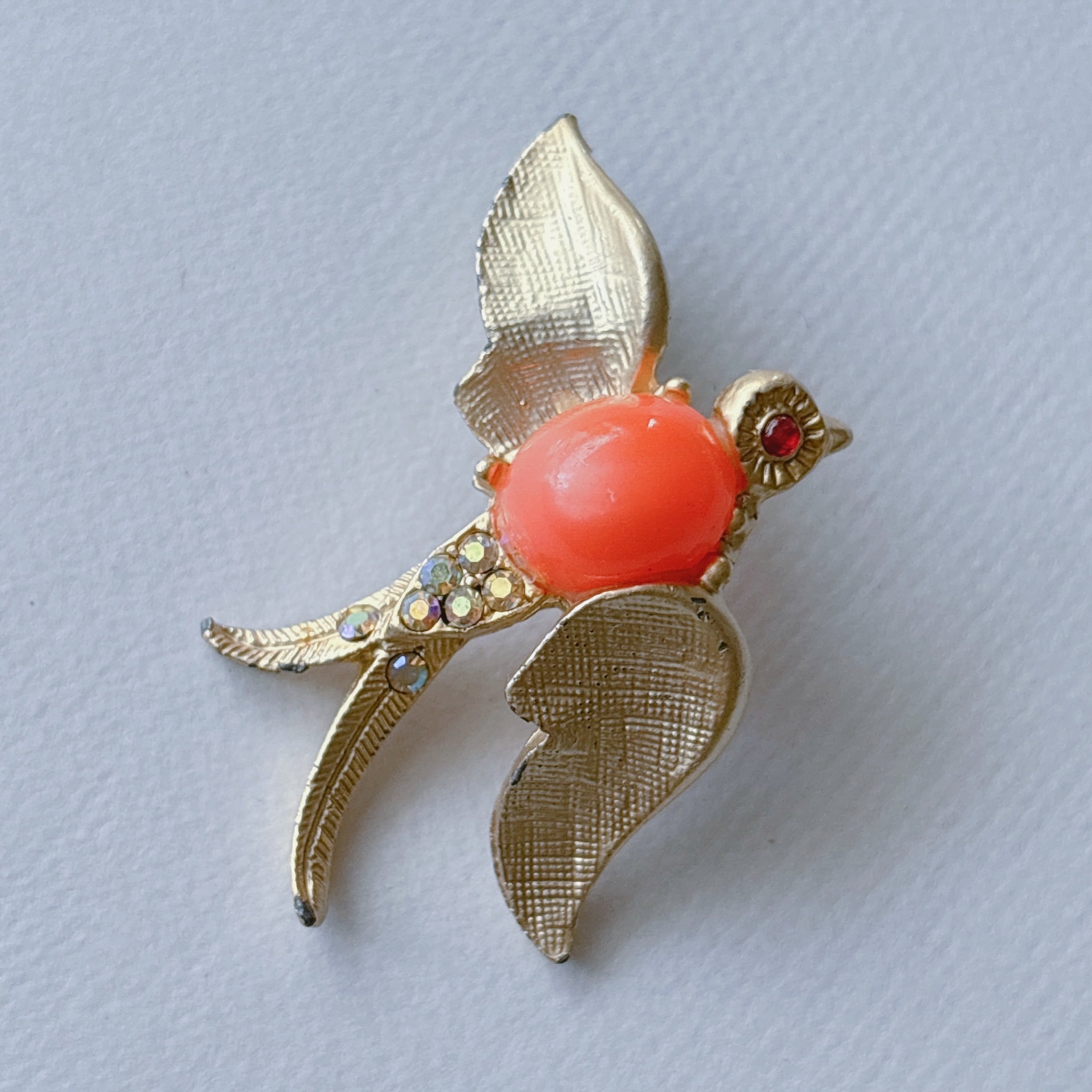 Vintage 60s - 70s gold tone orange plastic cabochon jelly belly clear red rhinestone swallow bird brooch ヴィンテージ 60年代 - 70年代 ゴールドトーン オレンジ プラスチック カボション クリア レッド ラインストーン ツバメ 鳥 ブローチ