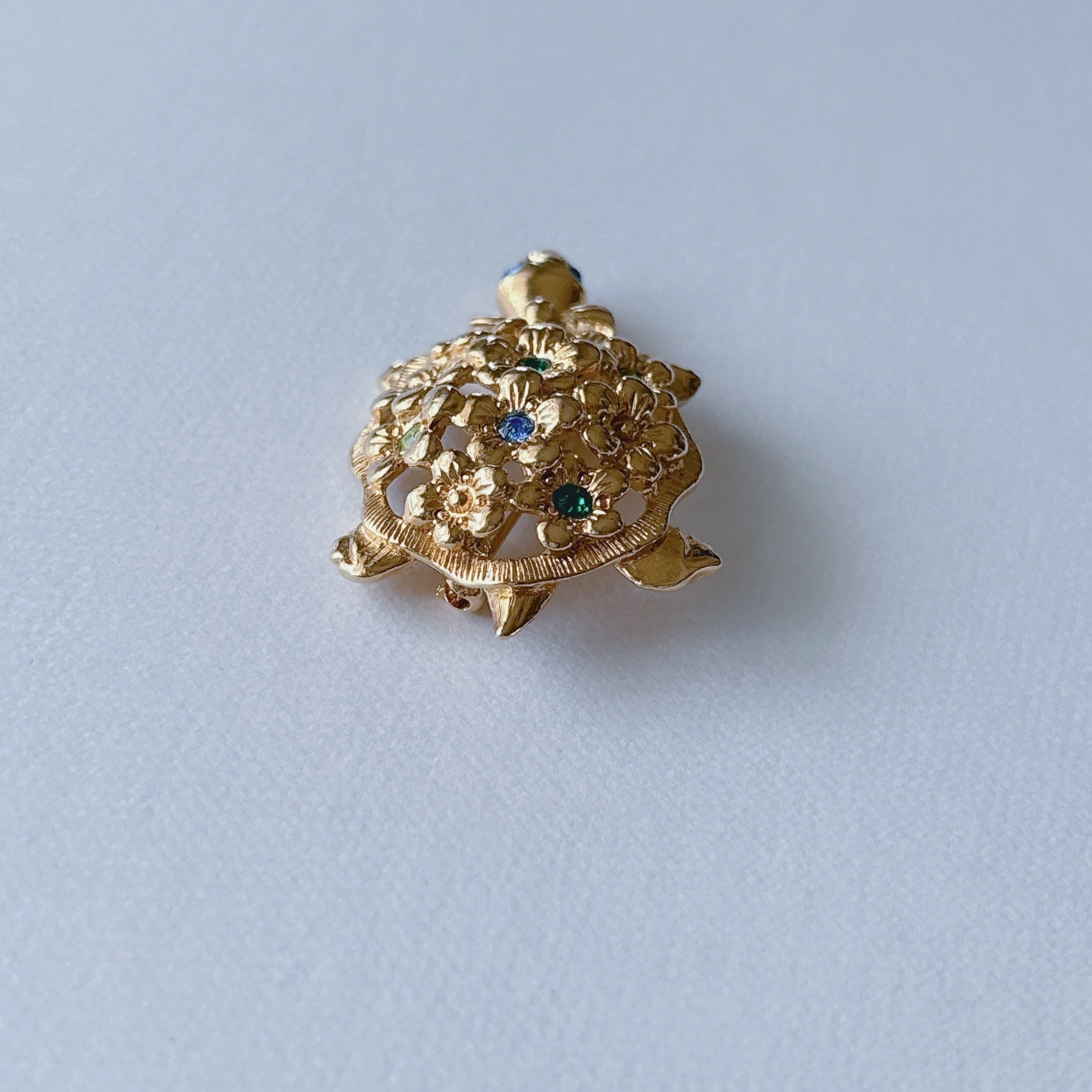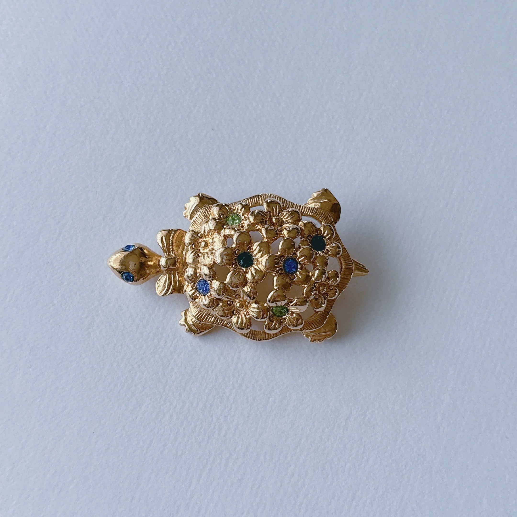 AVON Vintage 90s gold tone green blue rhinestone turtle flower brooch ヴィンテージ 90年代 ゴールドトーン グリーン ブルー ラインストーン 亀 タートル フラワー 花 ブローチ