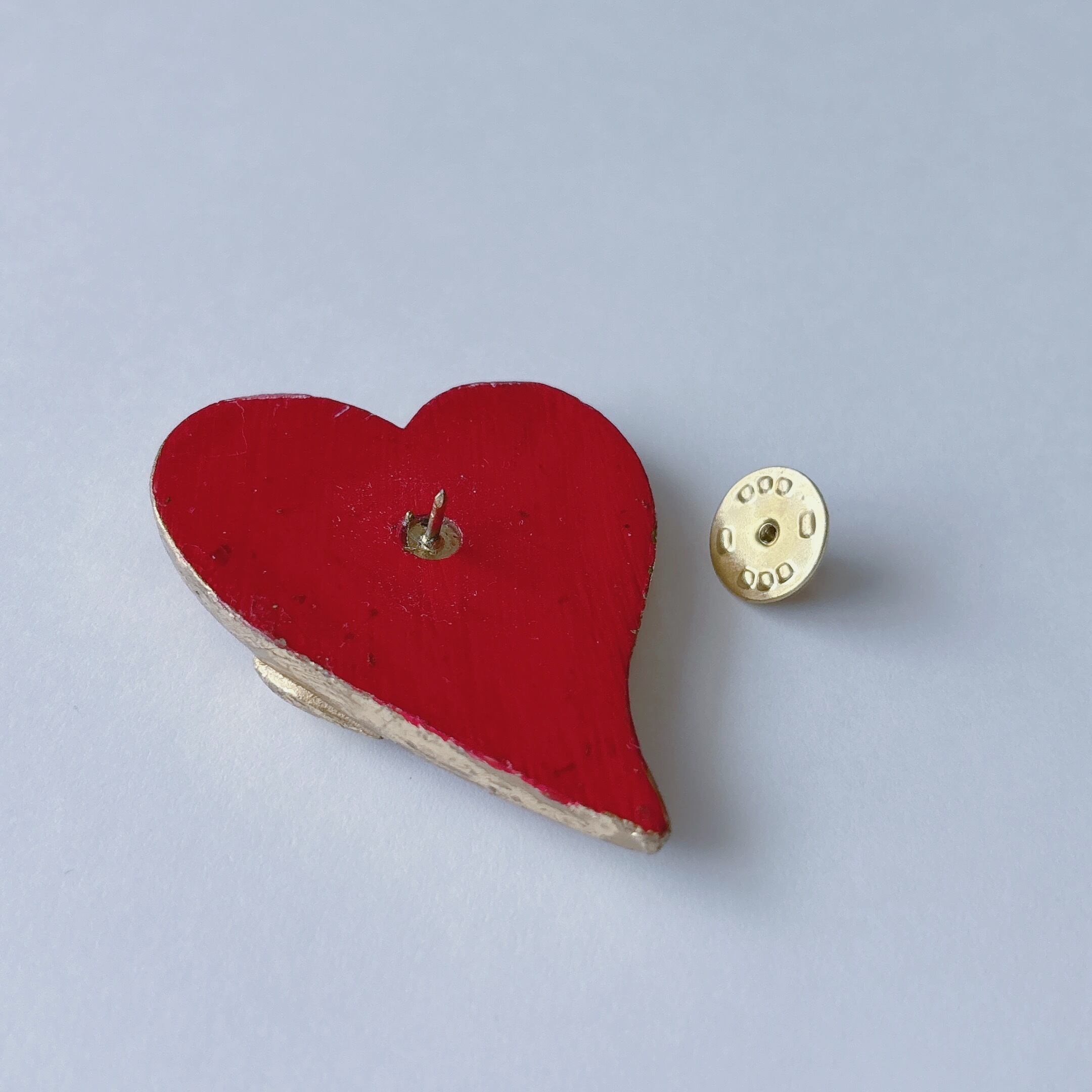 Vintage 80s gold tone red wood double heart brooch pin ヴィンテージ 80年代 ゴールドトーン レッド ウッド 木製 ダブル ハート ブローチ ピンズ ピンバッジ