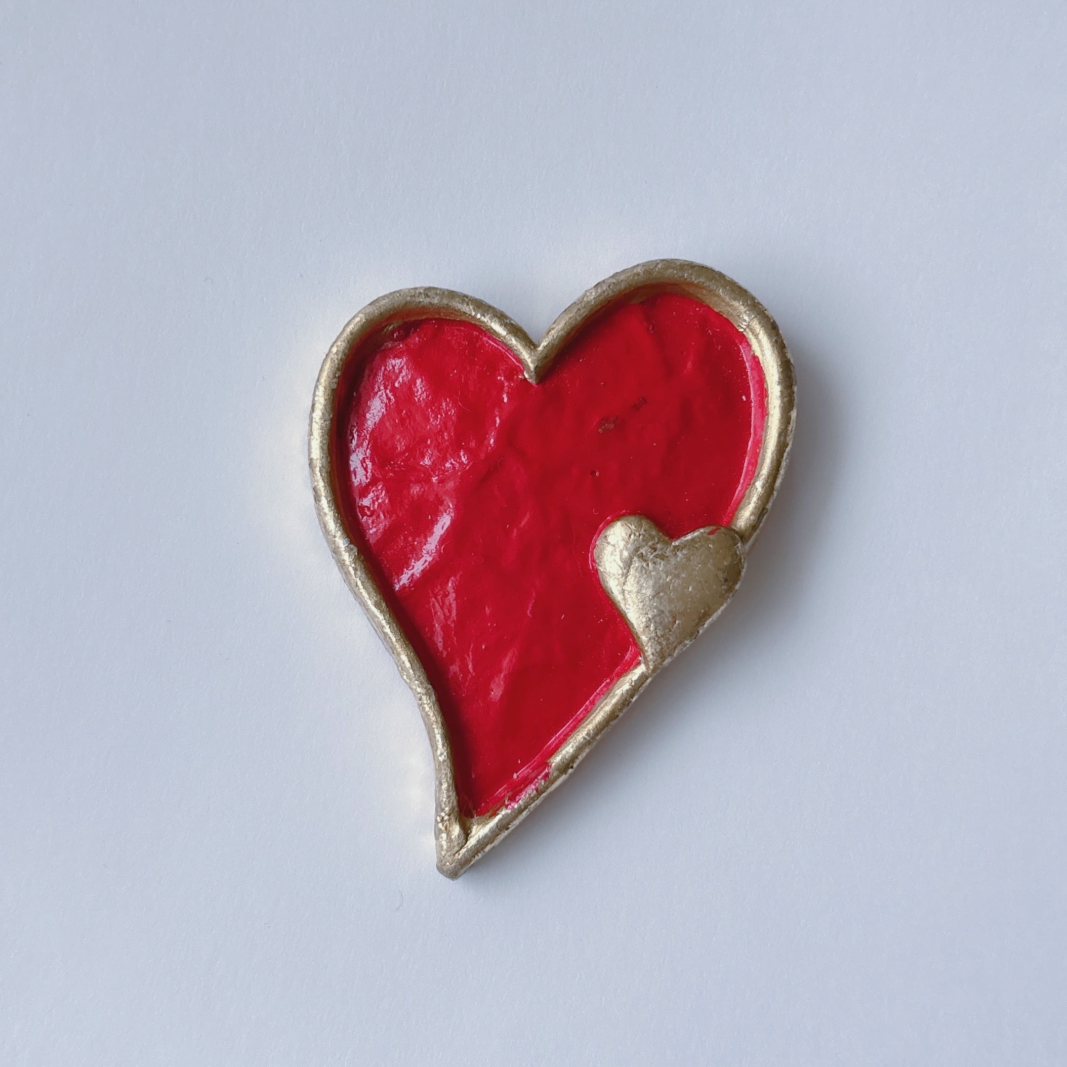 鮮やかな赤にダメージ感のあるゴールドのフレームが際立ち、ちょこんと添えられた小さなハートも可愛らしいです。