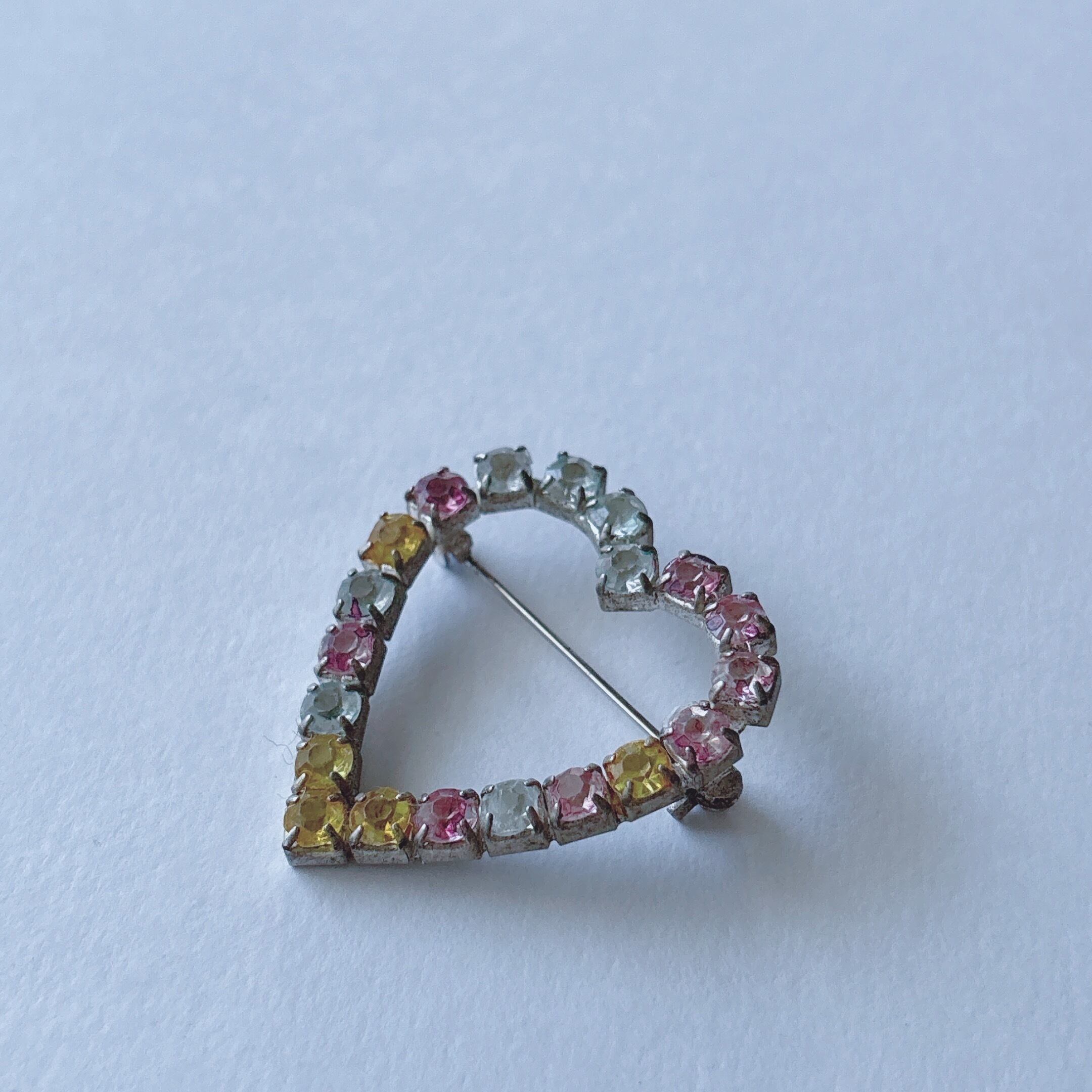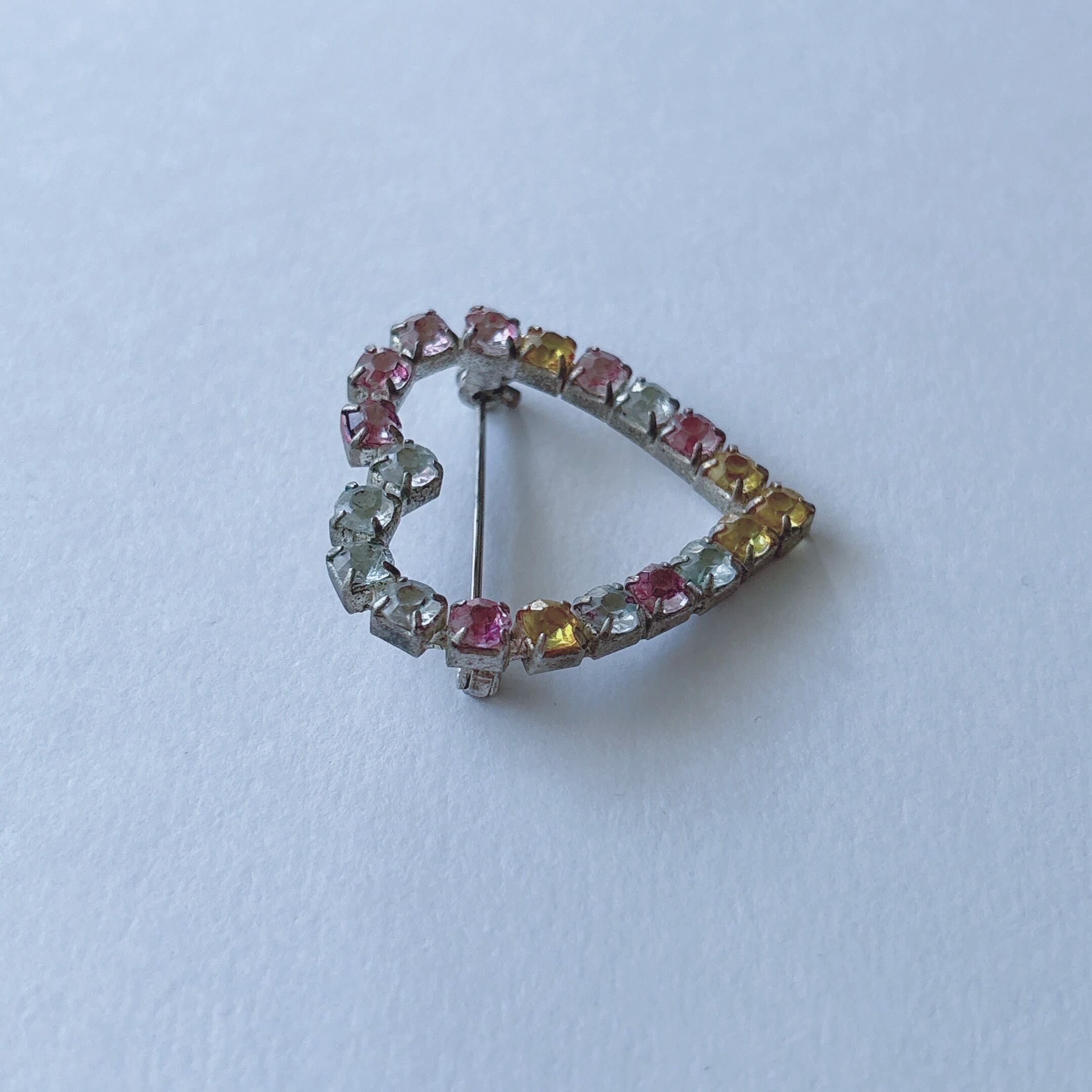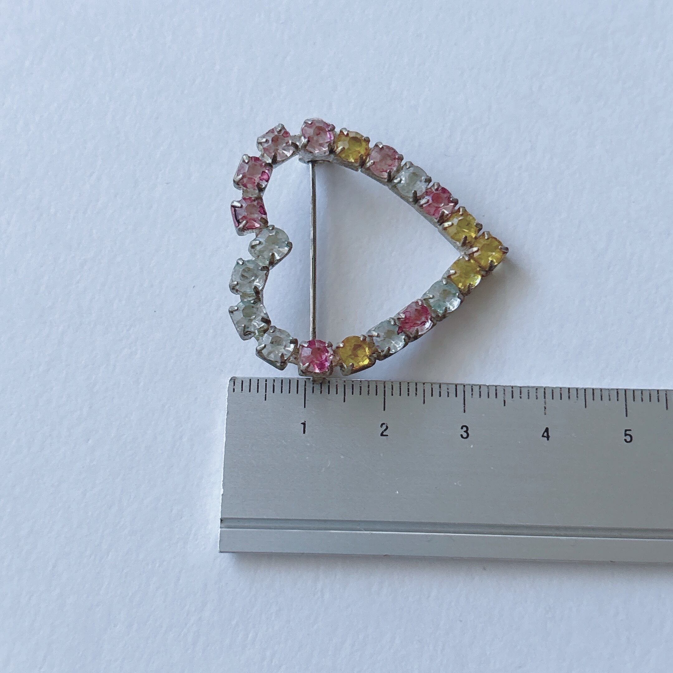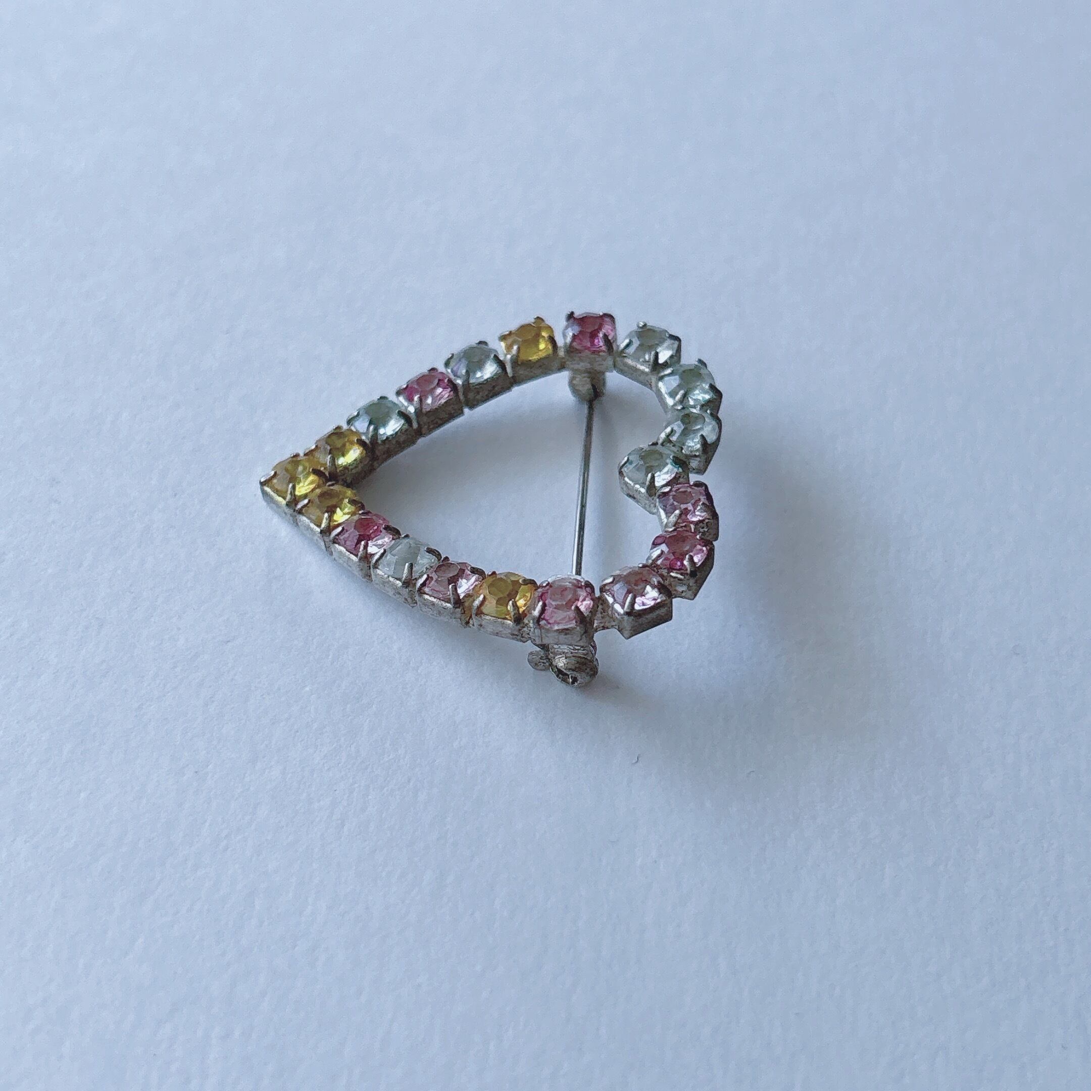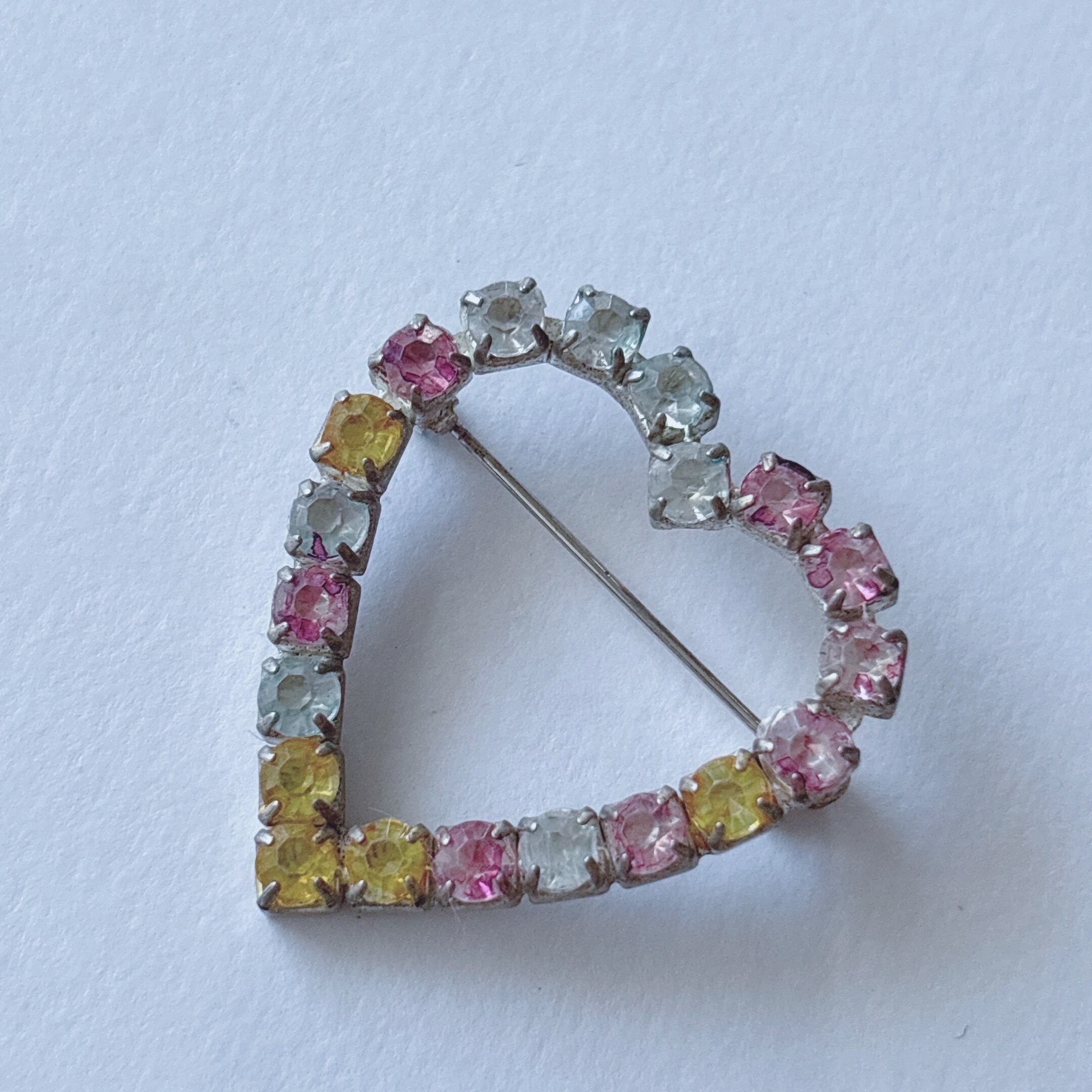 Vintage 50s - 60s silver tone clear yellow pink rhinestone heart brooch