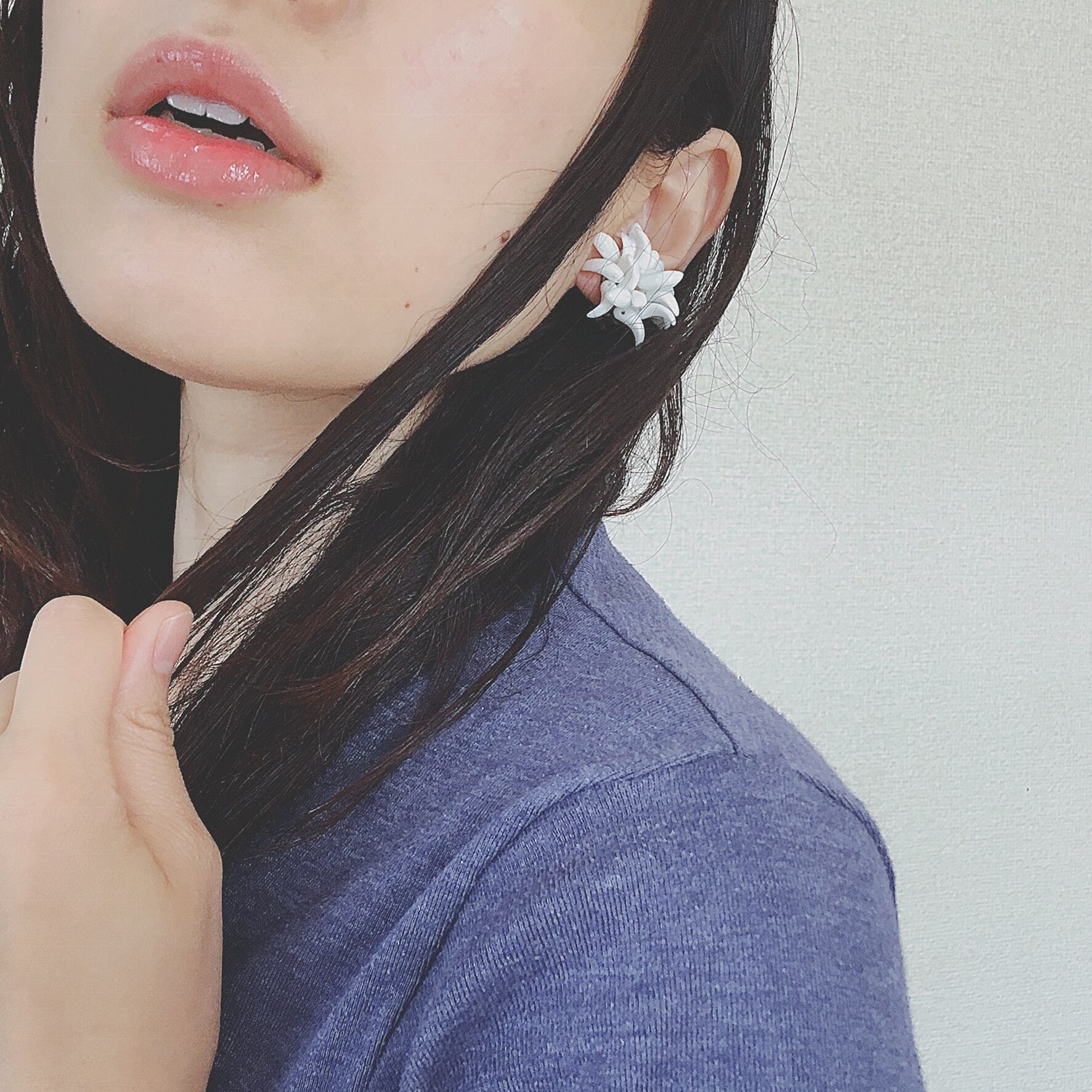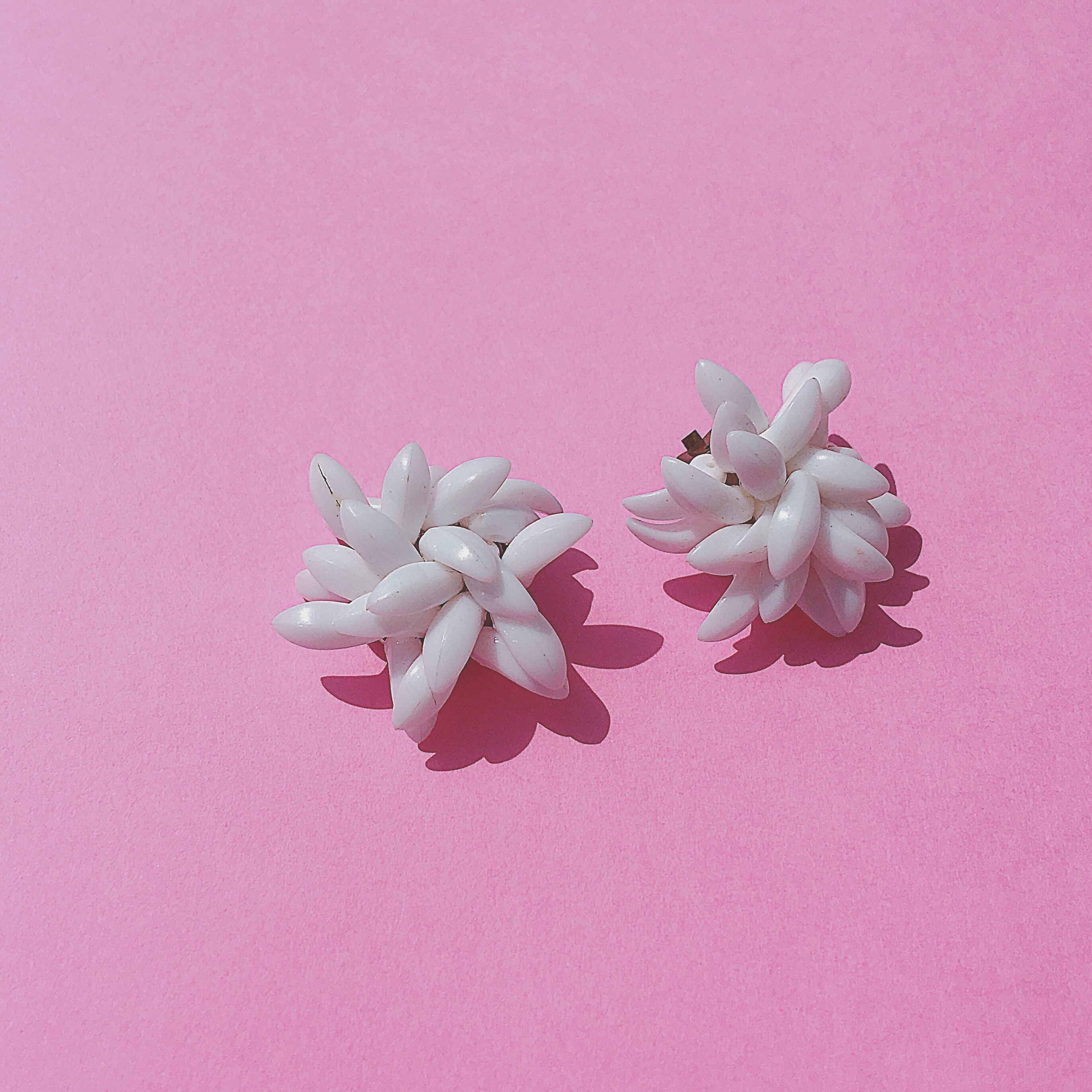あっちこっち向いた白い花びらビーズのヴィンテージイヤリング。