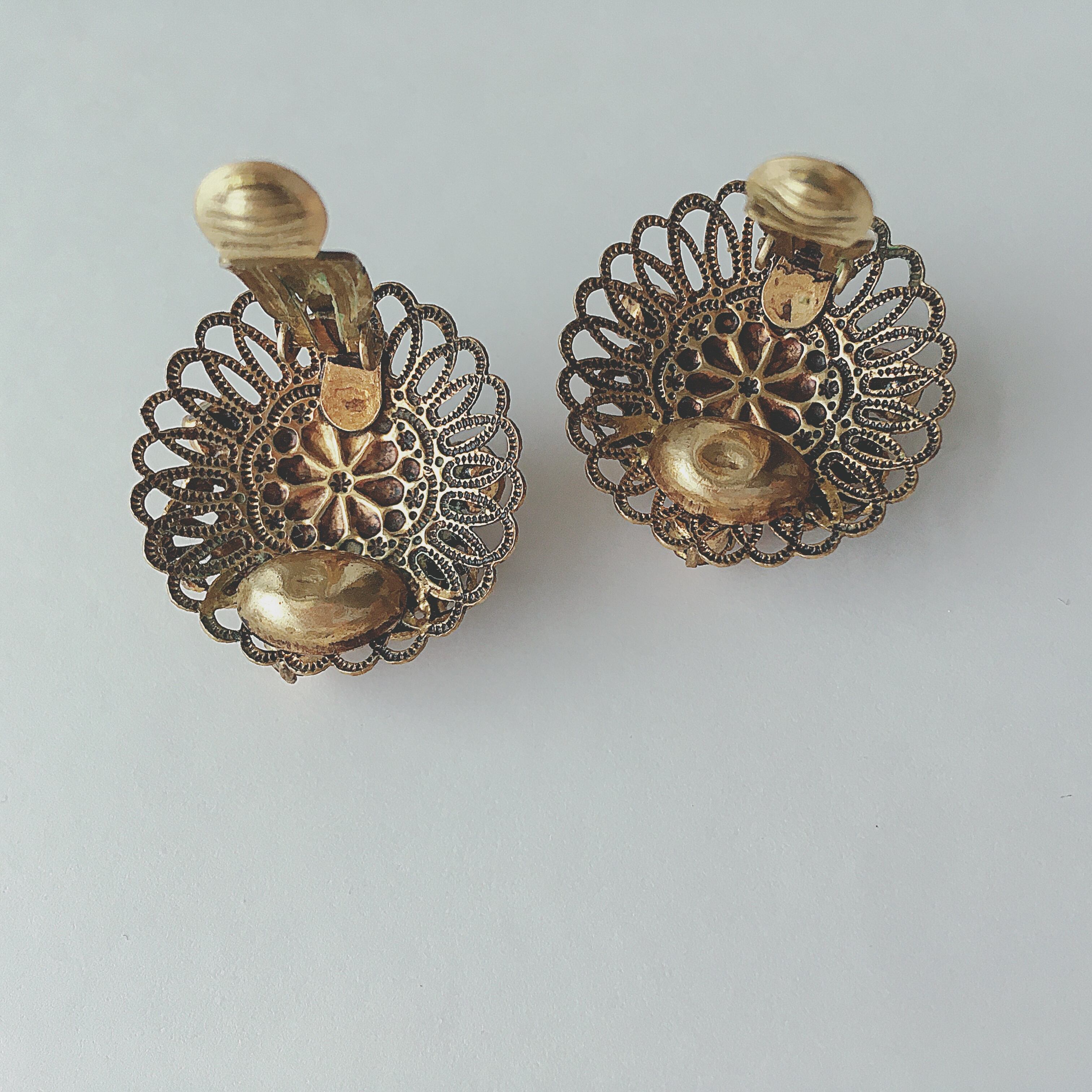 Vintage 50s - 60s Germany gold tone clear orange rhinestone flower earrings ヴィンテージ 50年代 - 60年代 ドイツ製 ゴールドトーン クリア オレンジ ラインストーン フラワー 花 イヤリング b277 | OBAKEPEACH