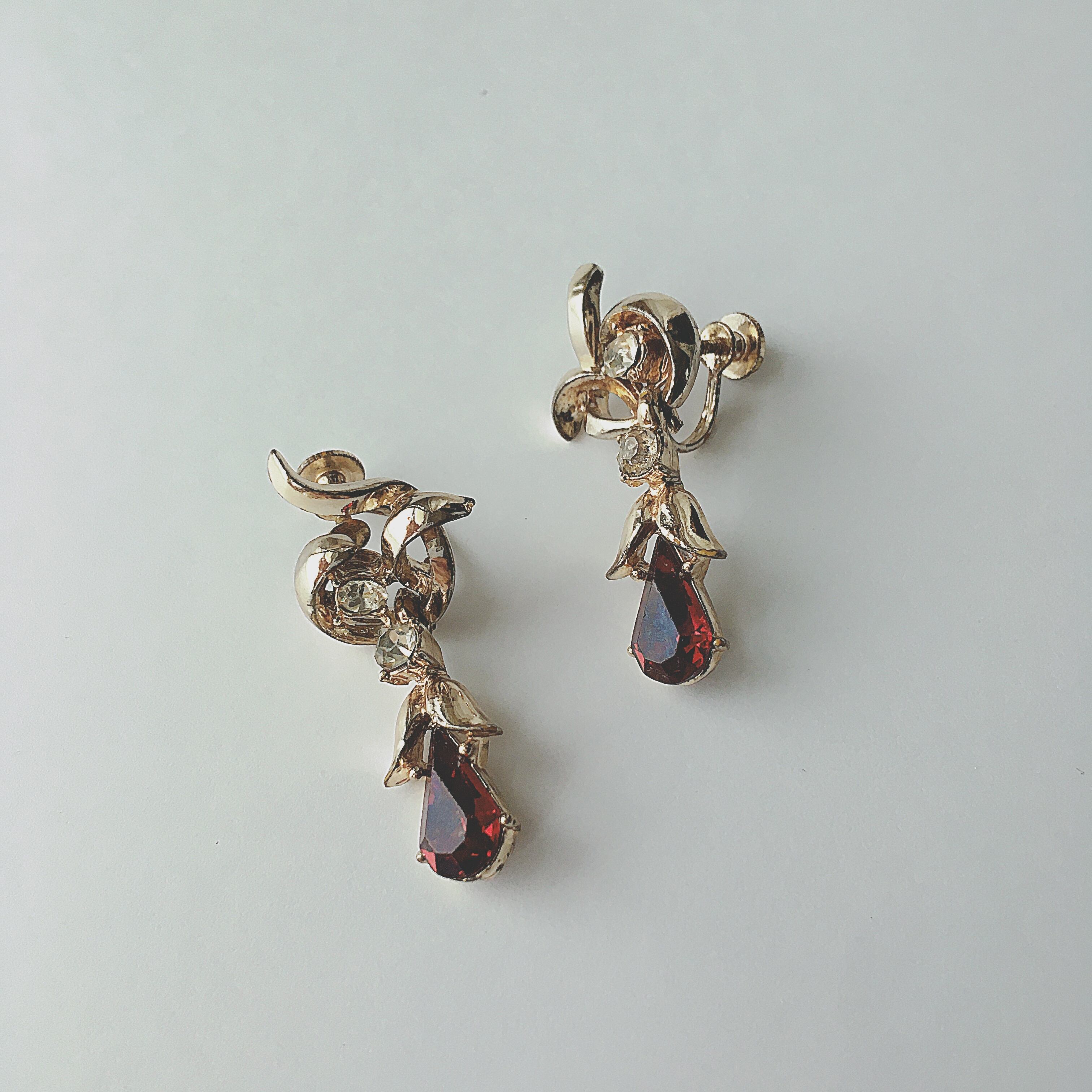 Vintage 50s - 60s Coro gold tone red tear drop rhinestoneヴィンテージ 50年代 - 60年代 コロ ゴールドトーン レッド ディアドロップ 雫 ラインストーン イヤリング b232 | OBAKEPEACH