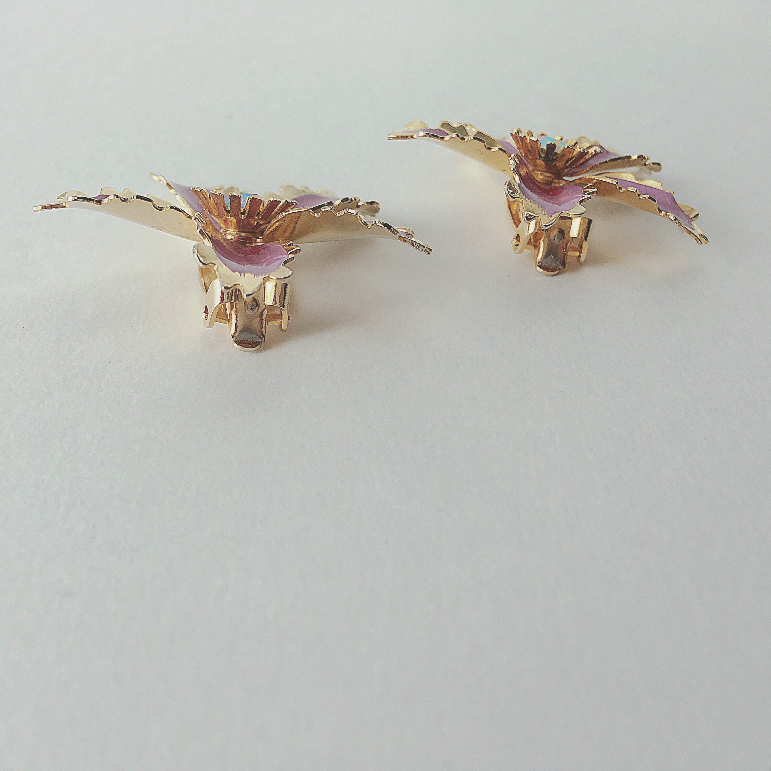 ゴールドメッキにパープルがかったピンクで色付けした花のデザイン。