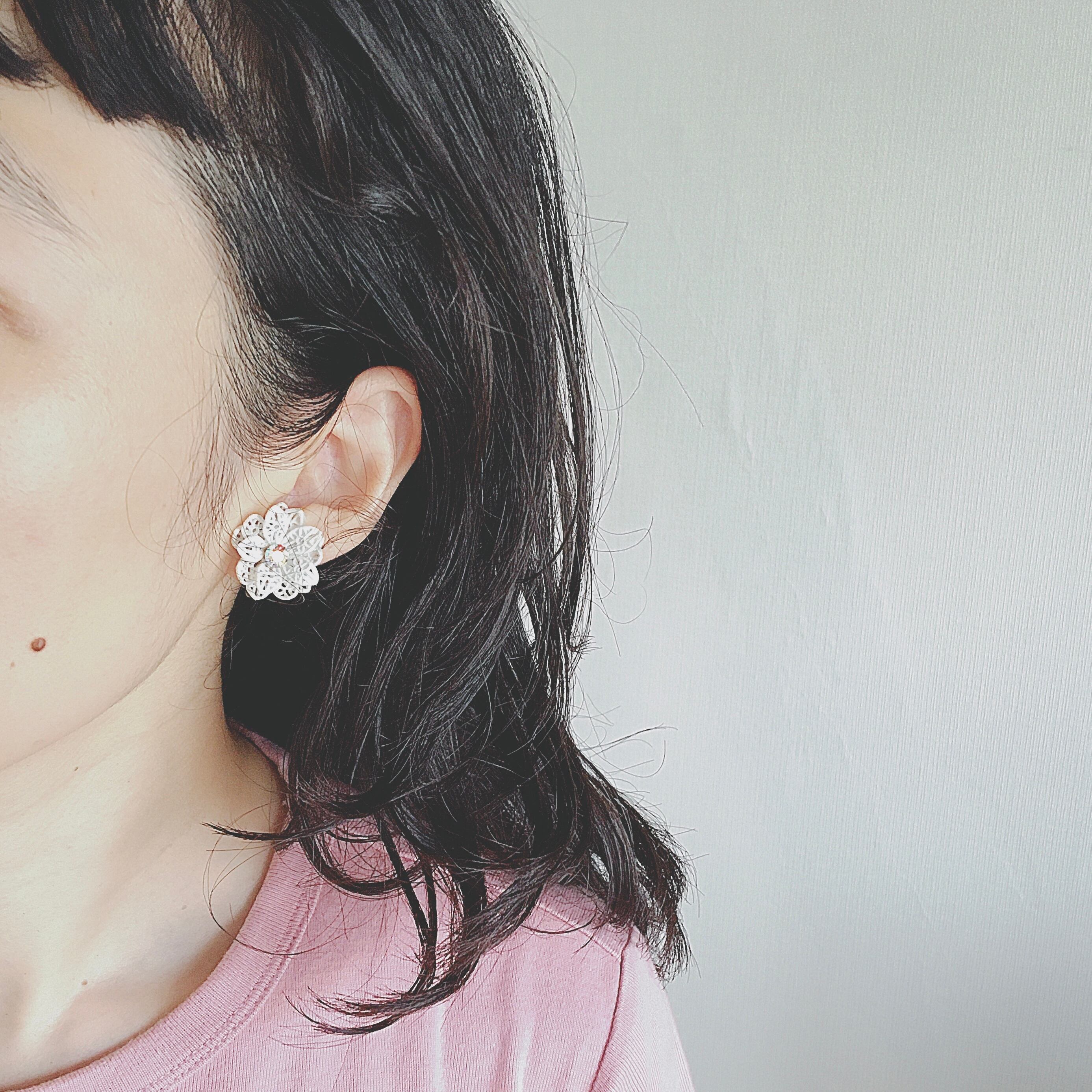 Vintage 50s white softplastic clear rhinestone flower earrings ヴィンテージ 50年代 ホワイト 白 ソフトプラスチック クリア ラインストーン フラワー 花 イヤリング b255 | OBAKEPEACH