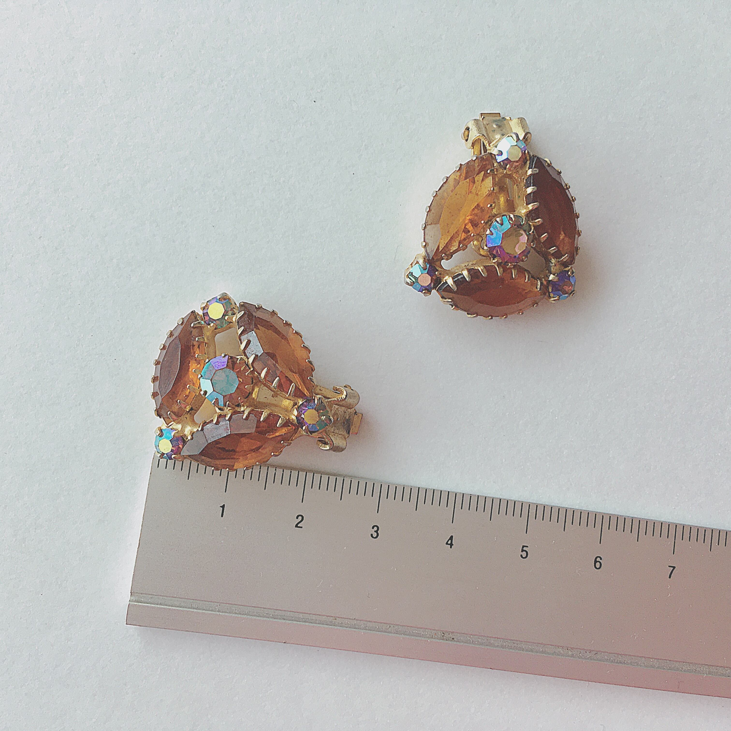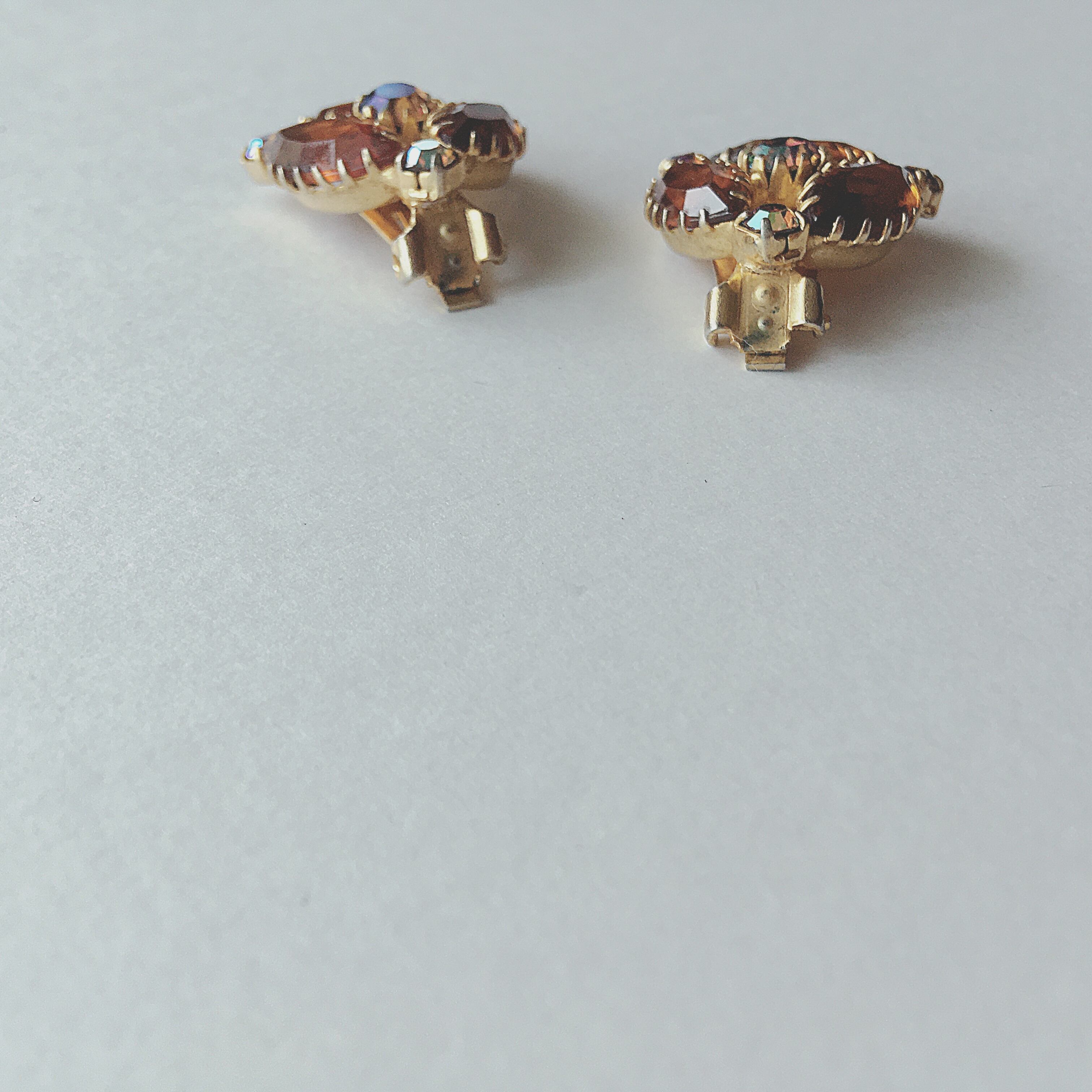 Vintage 60s - 70s gold tone amber glass stone flower earrings ヴィンテージ 60年代 - 70年代 ゴールドトーン アンバーカラー ガラスストーン ラインストーン フラワー 花 イヤリング b165 | OBAKEPEACH
