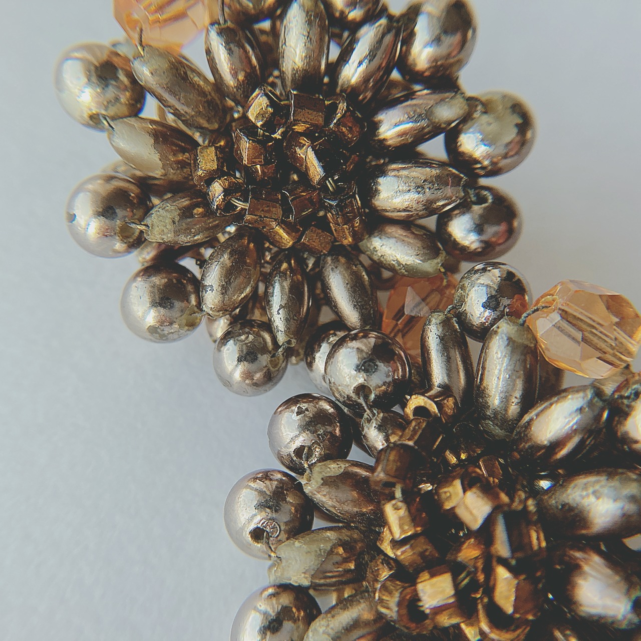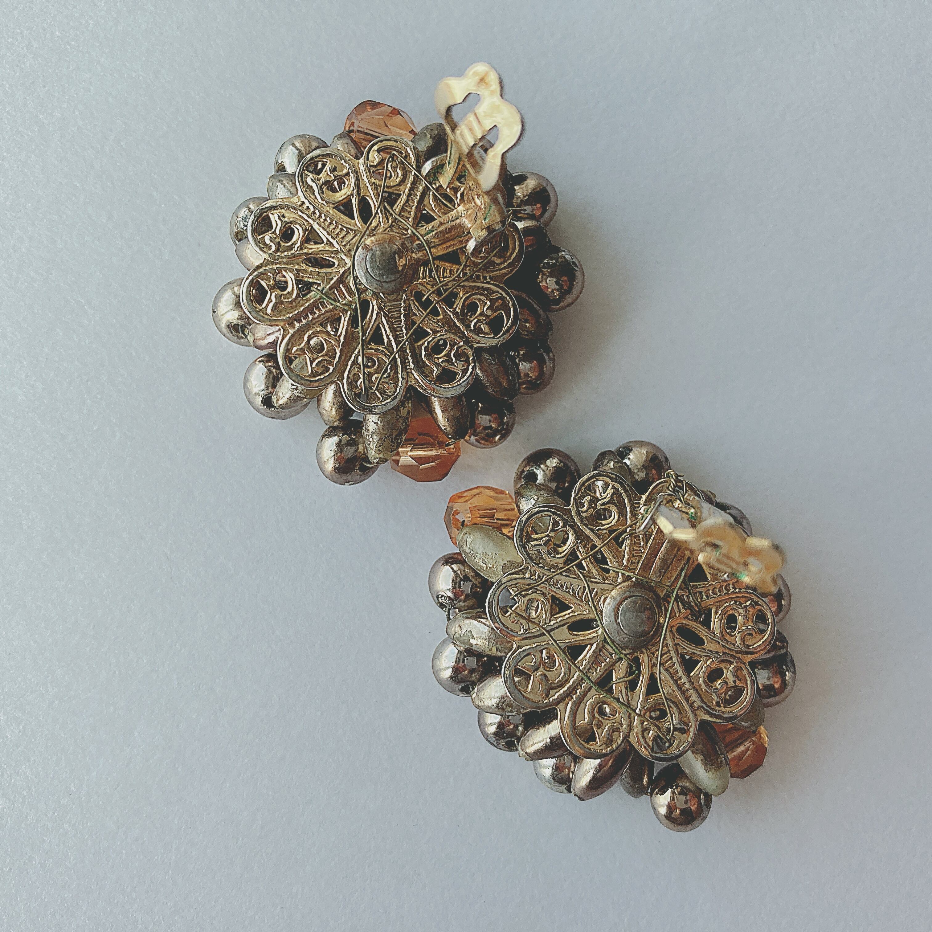 Vintage 50s - 60s Japan gold tone amber clear beads flower earrings ヴィンテージ 50年代 - 60年代 日本製 ゴールドトーン アンバー クリアビーズ フラワー 花 イヤリング b927 | OBAKEPEACH