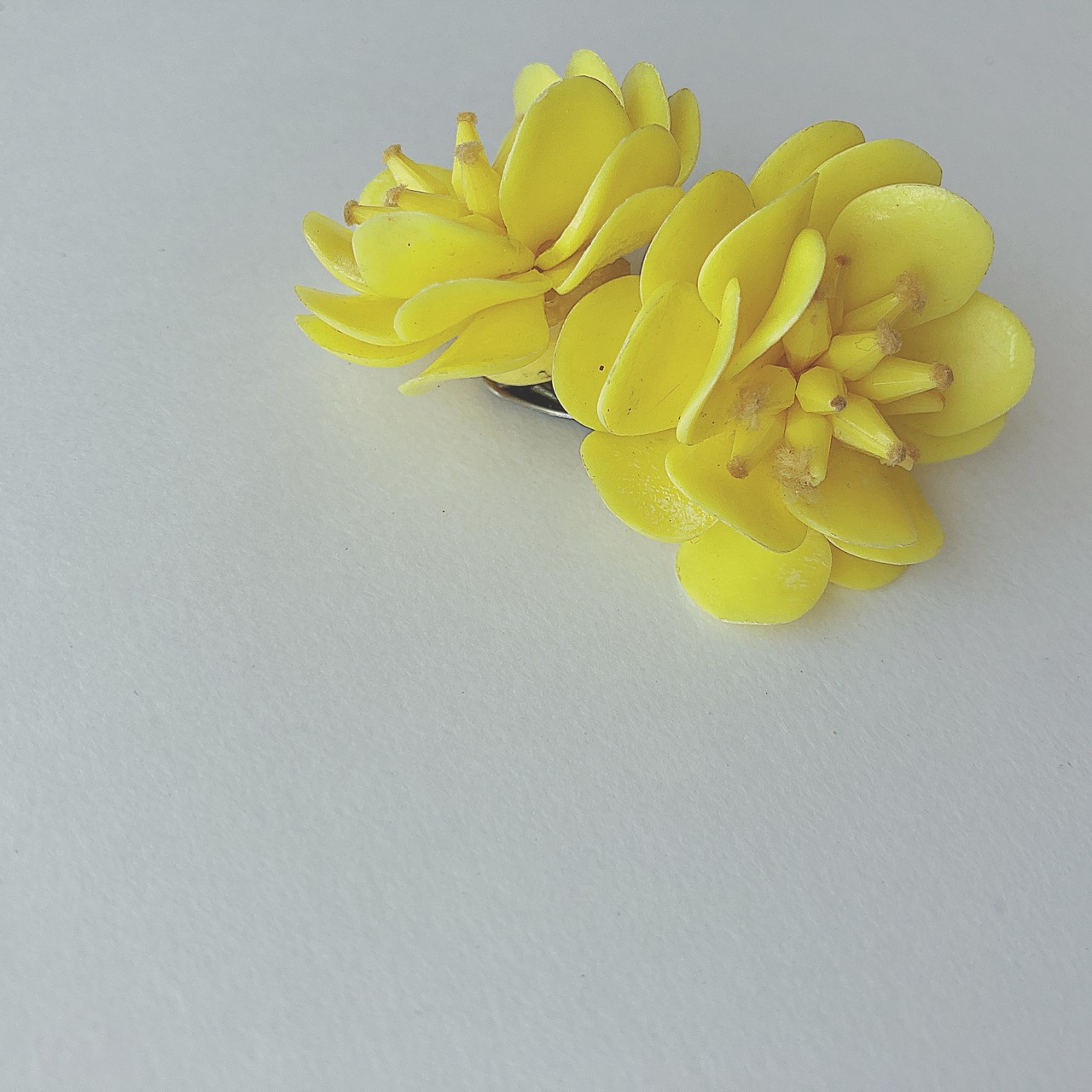 イエロー一色でシンプルな色使いですが、花びらが何層かになっていたり、中心に細長いビーズがいたり、ディテールが全体を盛り上げているように感じます。