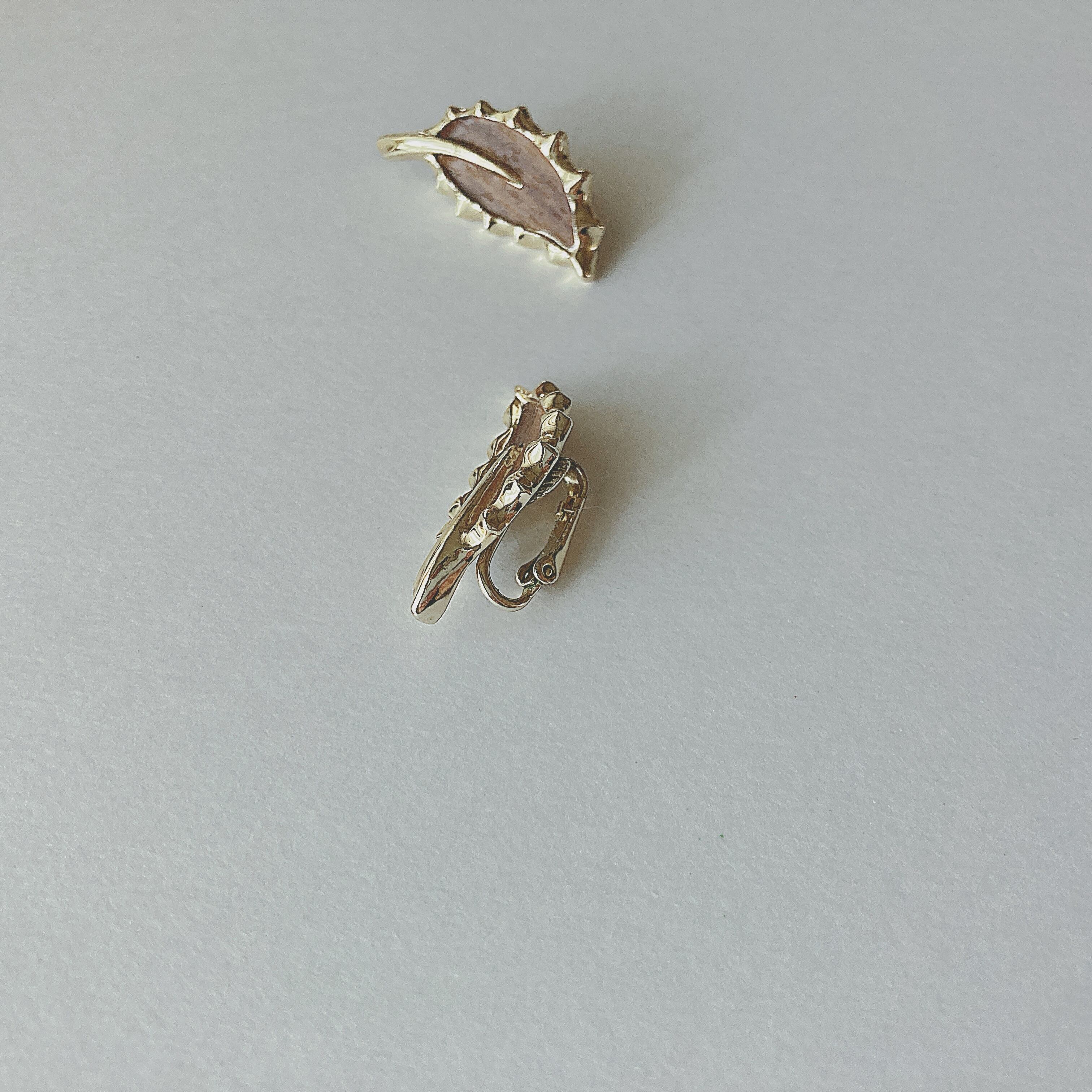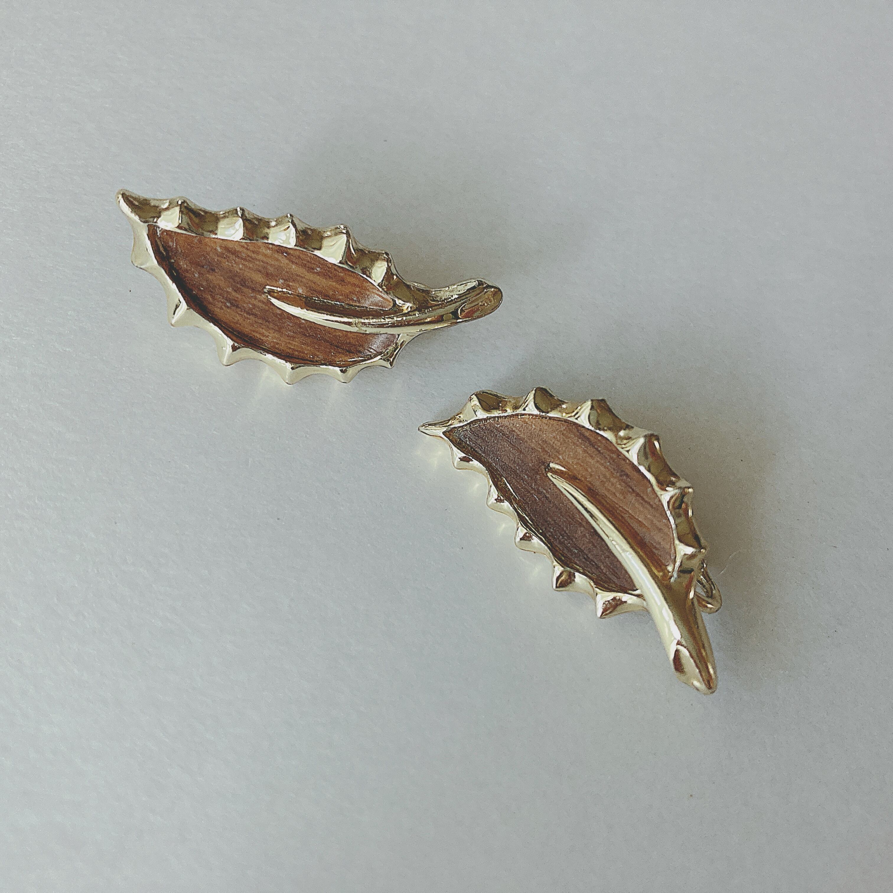 SARAH COVENTRY Vintage 60s gold tone brown wood leaf earrings ヴィンテージ 60年代 サラコベントリー ゴールドトーン ブラウン 葉っぱ リーフ イヤリング b1129 | OBAKEPEACH