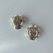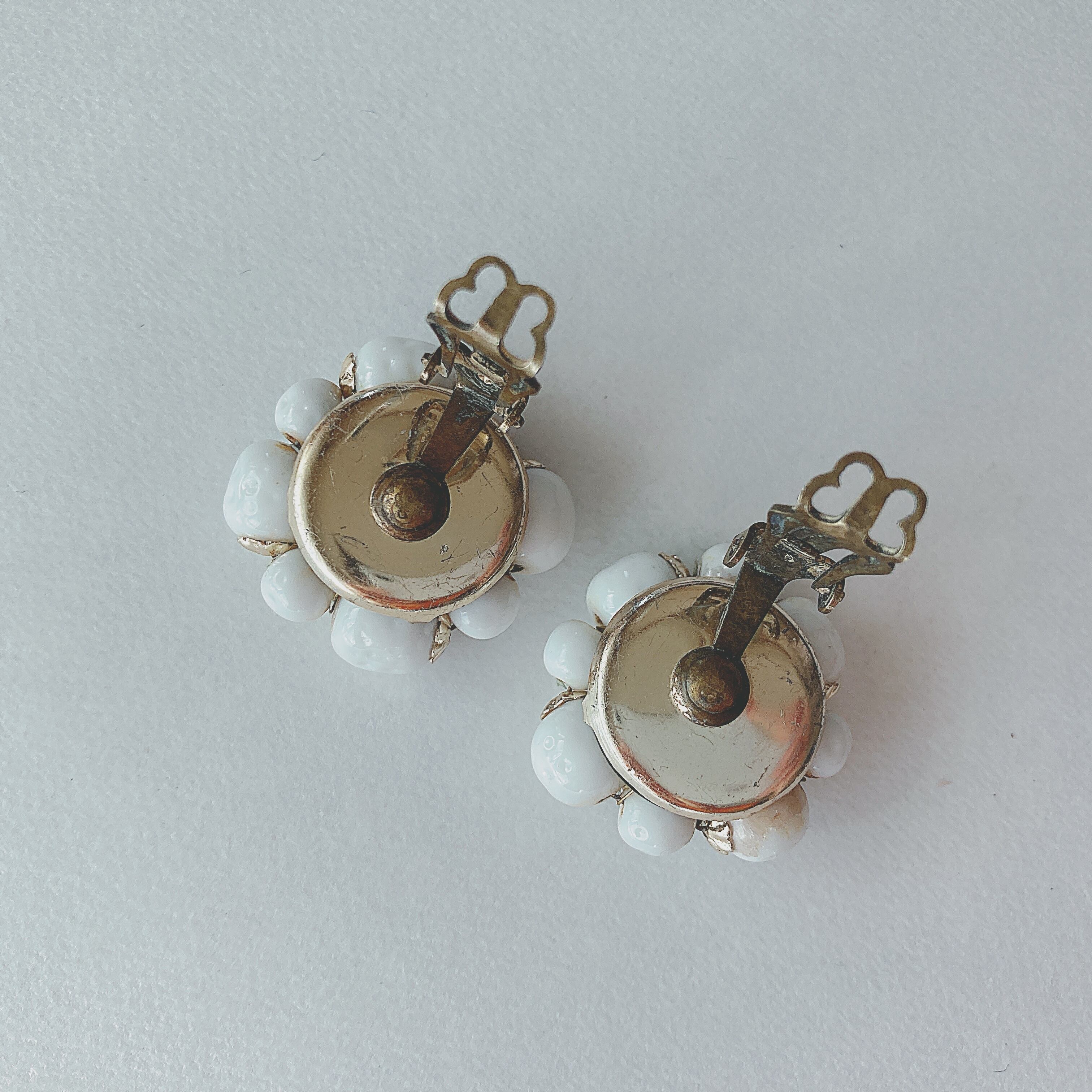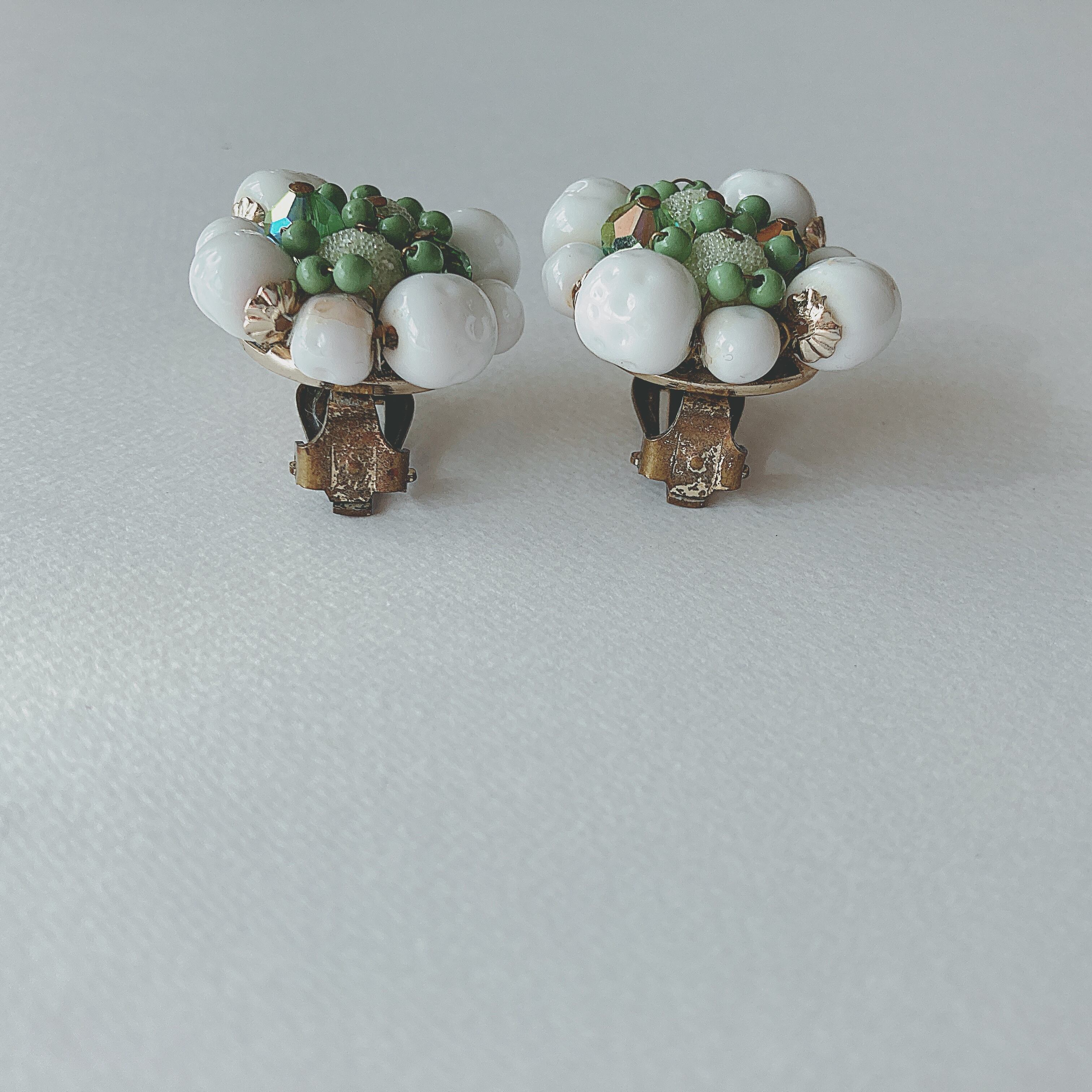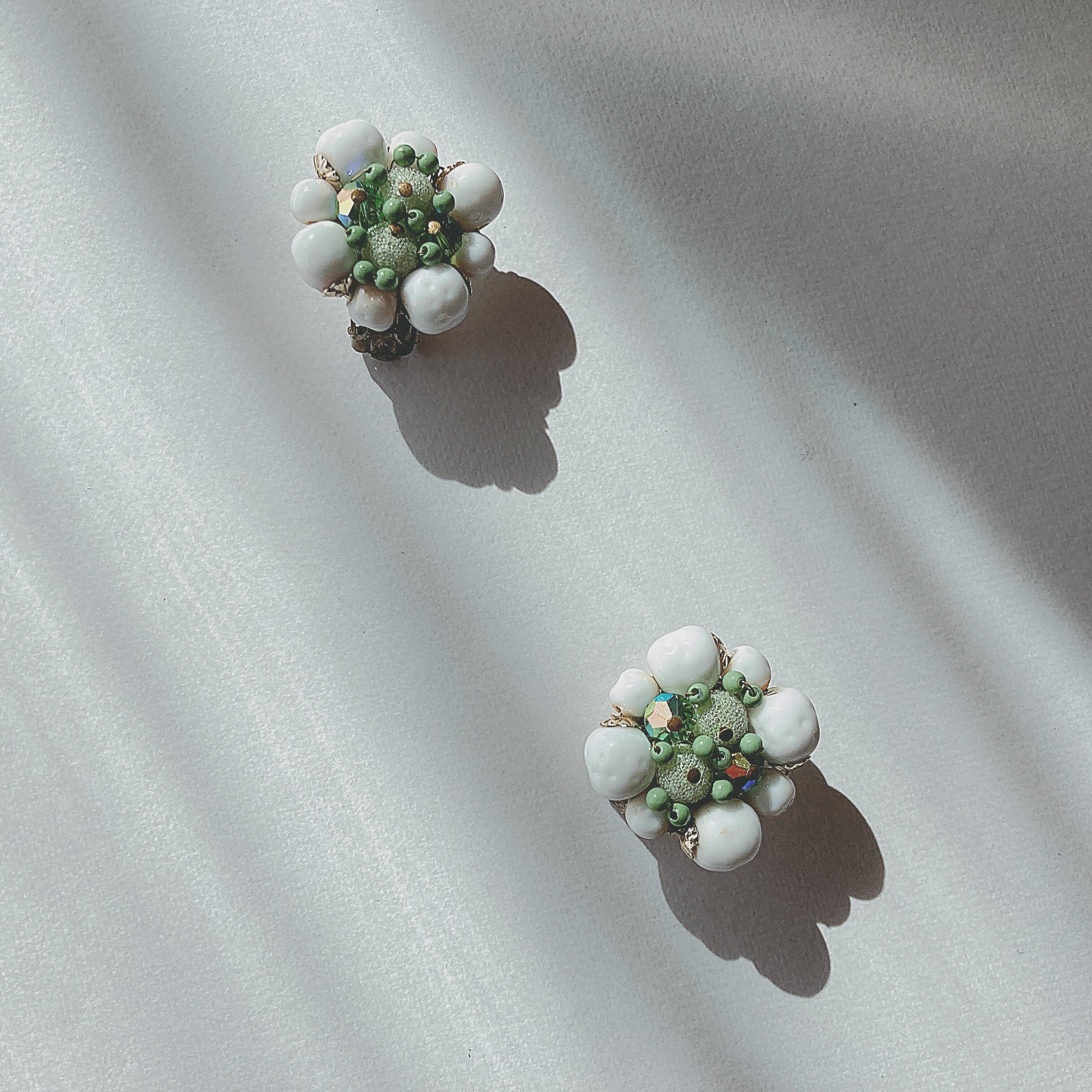 Vintage 50s - 60s JAPAN white green glass beads flower cluster earrings ヴィンテージ 50年代 - 60年代 日本製 ホワイト グリーン ガラスビーズ フラワー 花 クラスター イヤリング b1757 | OBAKEPEACH