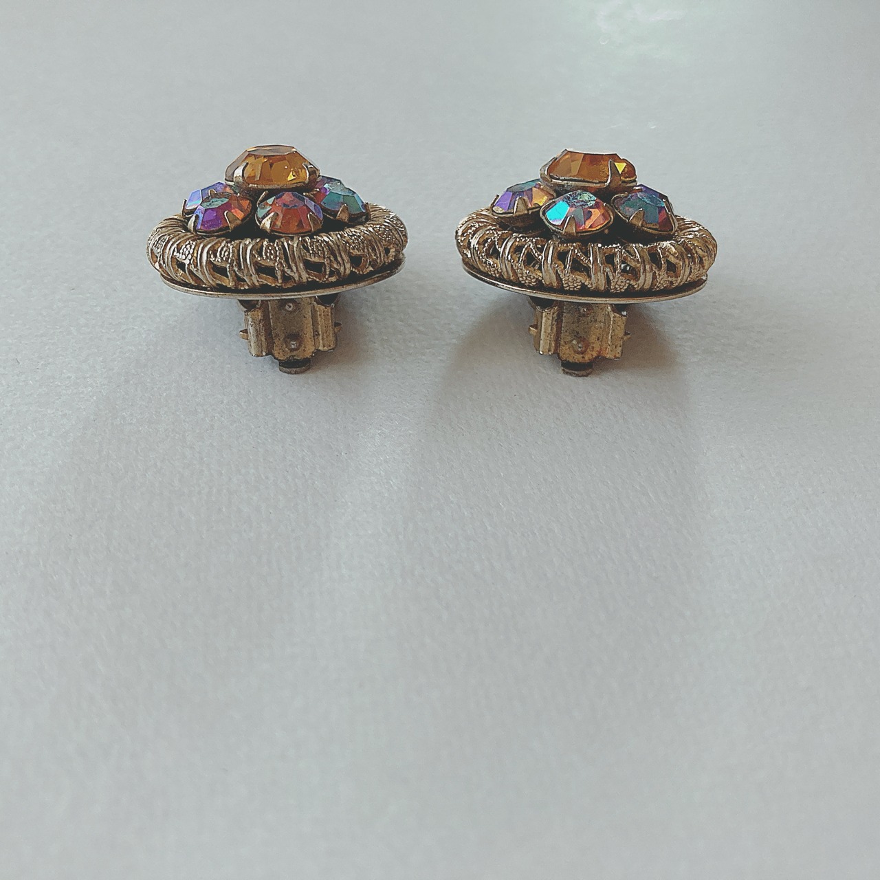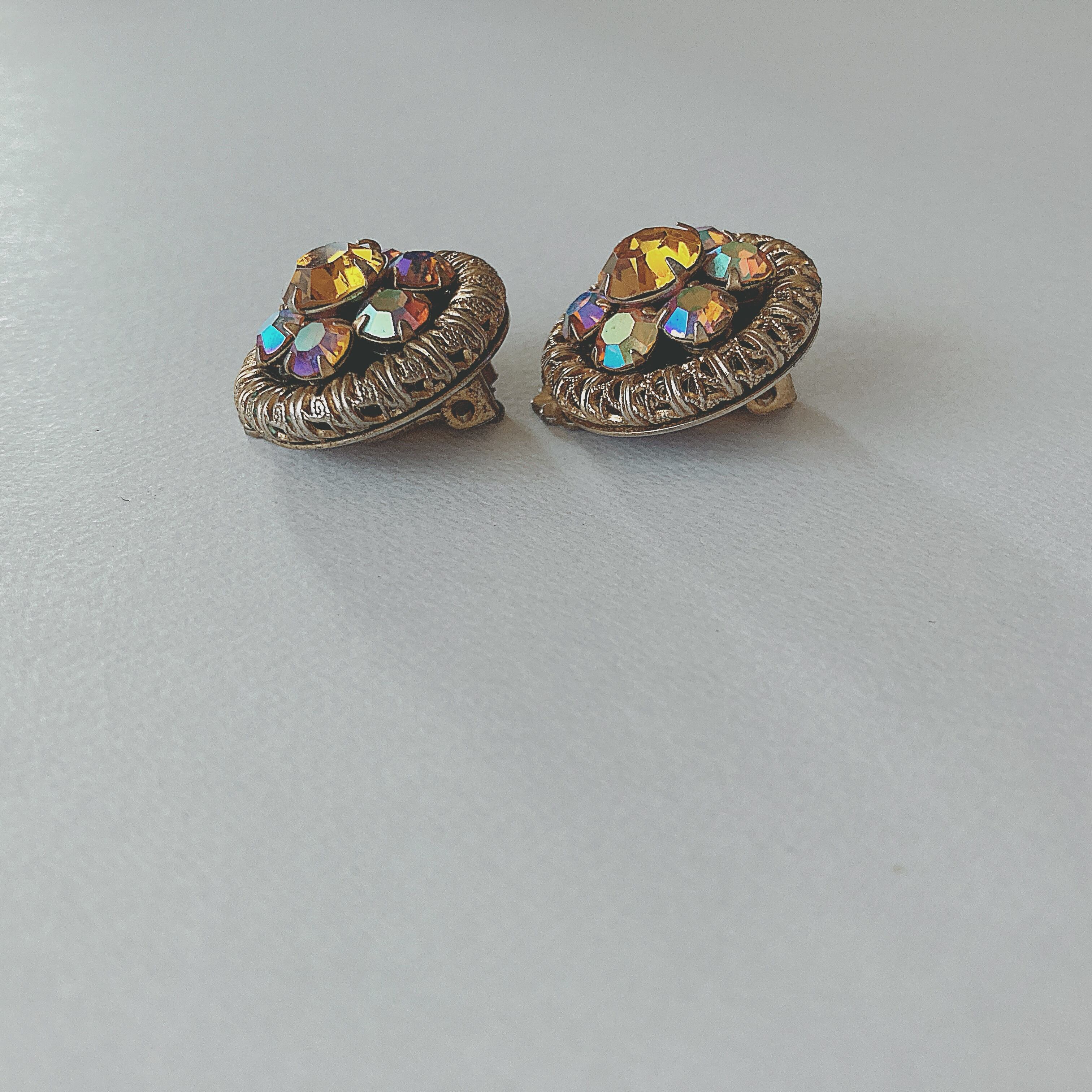 Vintage gold tone pink orange glass rhinestone flower earrings ヴィンテージ ゴールドトーン ピンク オレンジ ガラスストーン フラワー 花 イヤリング b1734 | OBAKEPEACH
