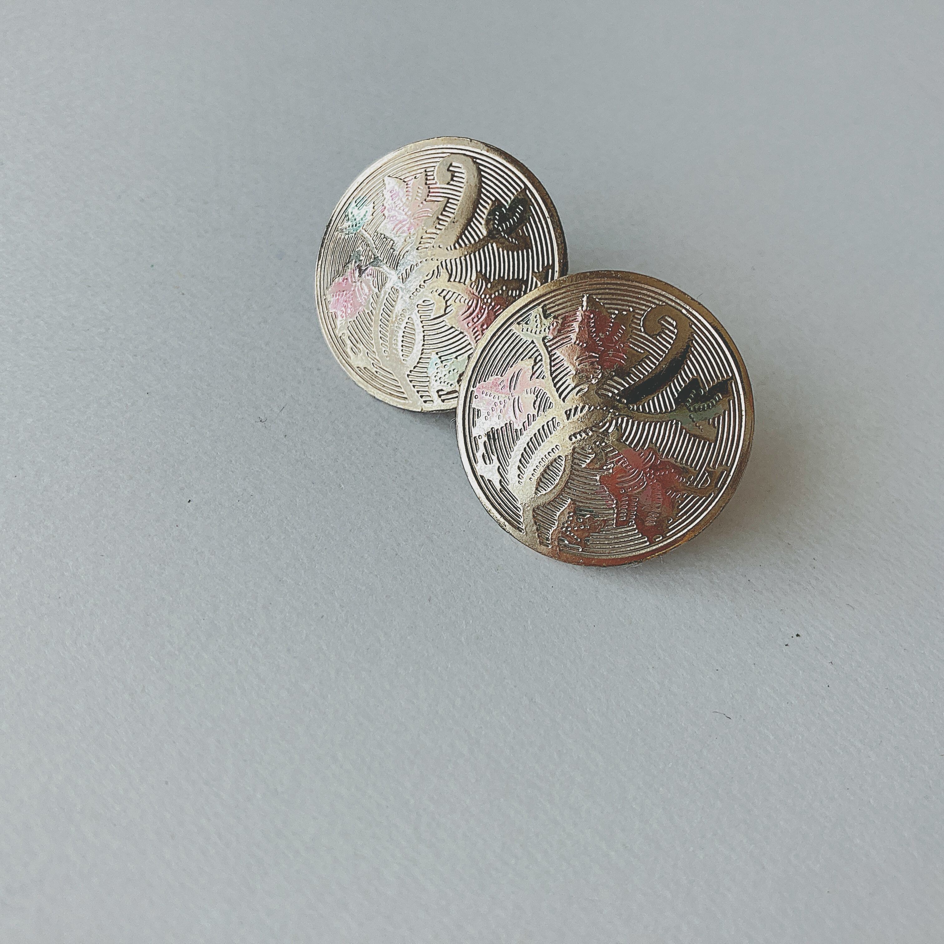プレス加工されたエレガントな花の絵柄、細かなラインの背景、どこか硬貨やメダルと似ています。