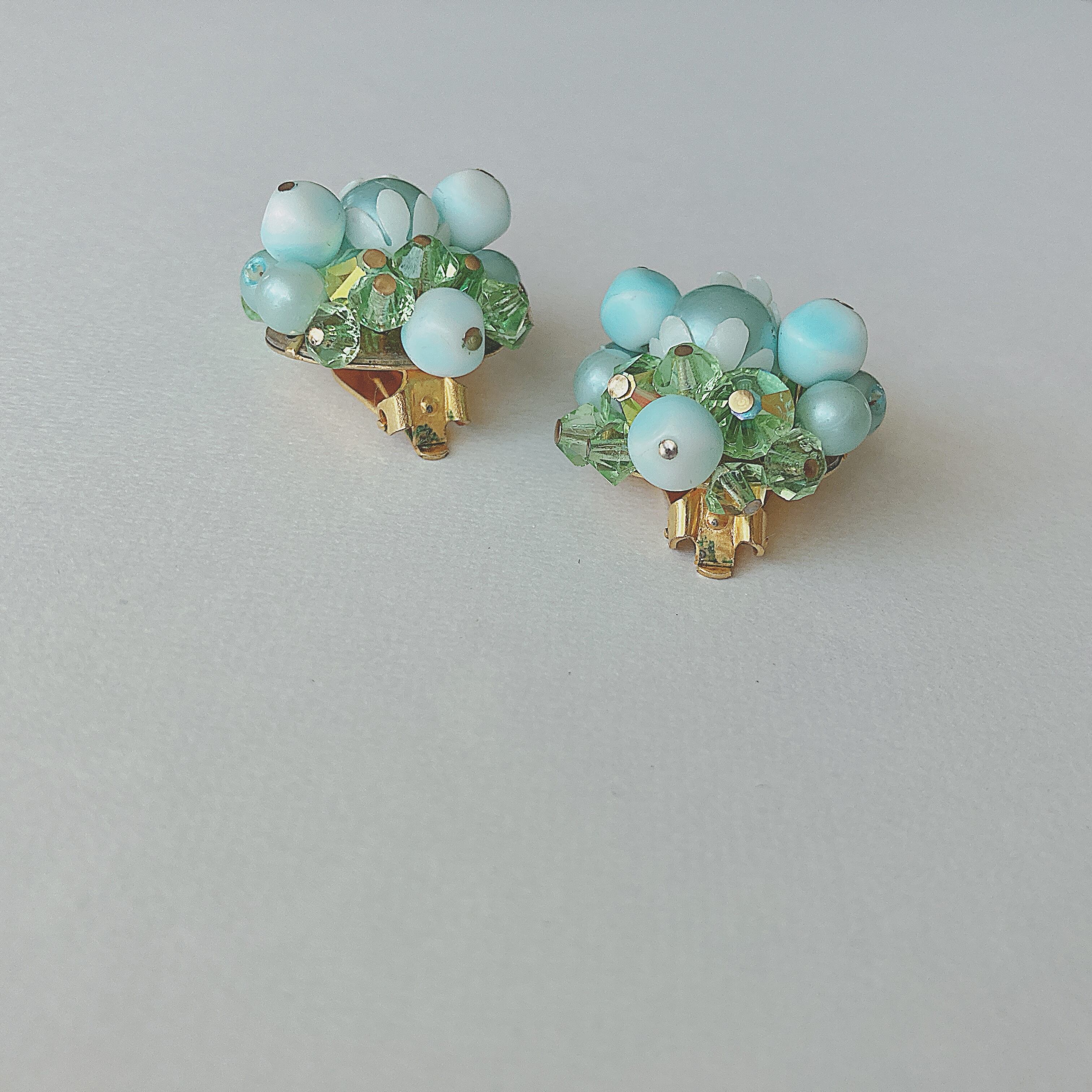 Vintage 50s - 60s blue green beads cluster earrings ヴィンテージ 50年代 - 60年代 ブルー グリーン ビーズ クラスター イヤリング b1633 | OBAKEPEACH