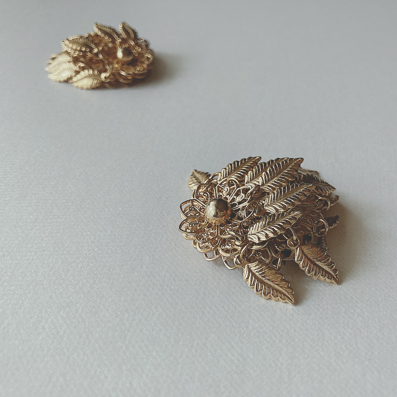 ゴールドメッキの葉っぱモチーフのビーズをぶら下げたデザイン。