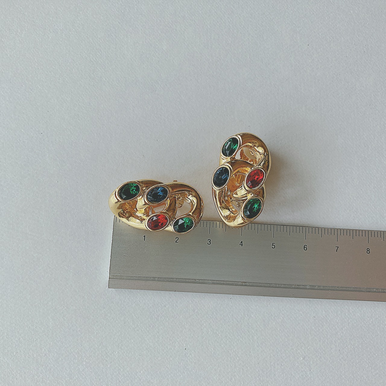 Vintage 80s gold chain green red blue rhinestone earrings ヴィンテージ 80年代 ゴールド チェーン グリーン レッド ブルー ラインストーン イヤリング b1564