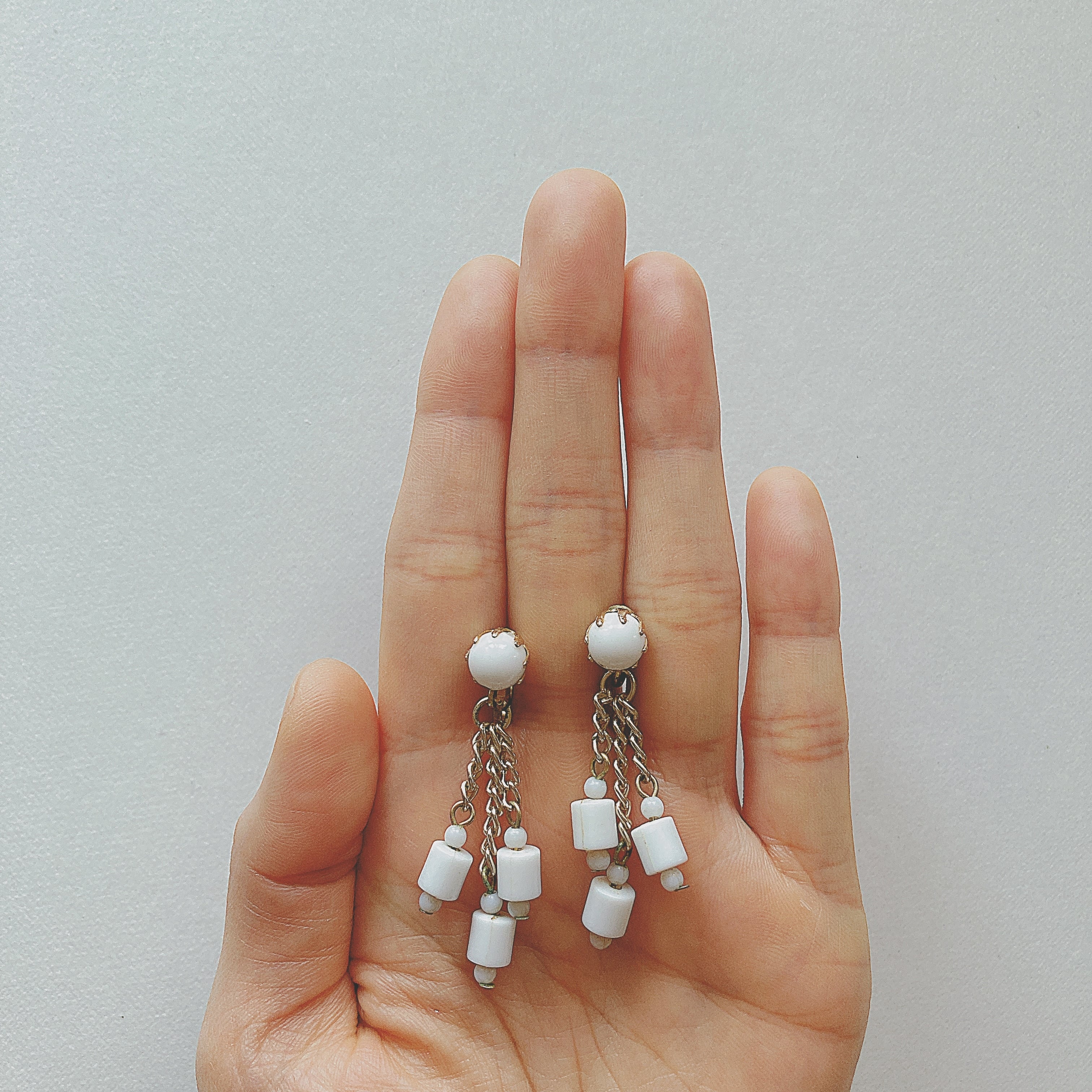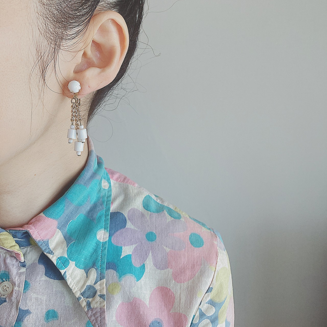 Vintage 50s - 60s HONG KONG gold chain white plastic beads dangle earrings ヴィンテージ 50年代 - 60年代 香港製 ゴールド チェーン ホワイト プラスチック ビーズ ダングル イヤリング b1556 | OBAKEPEACH