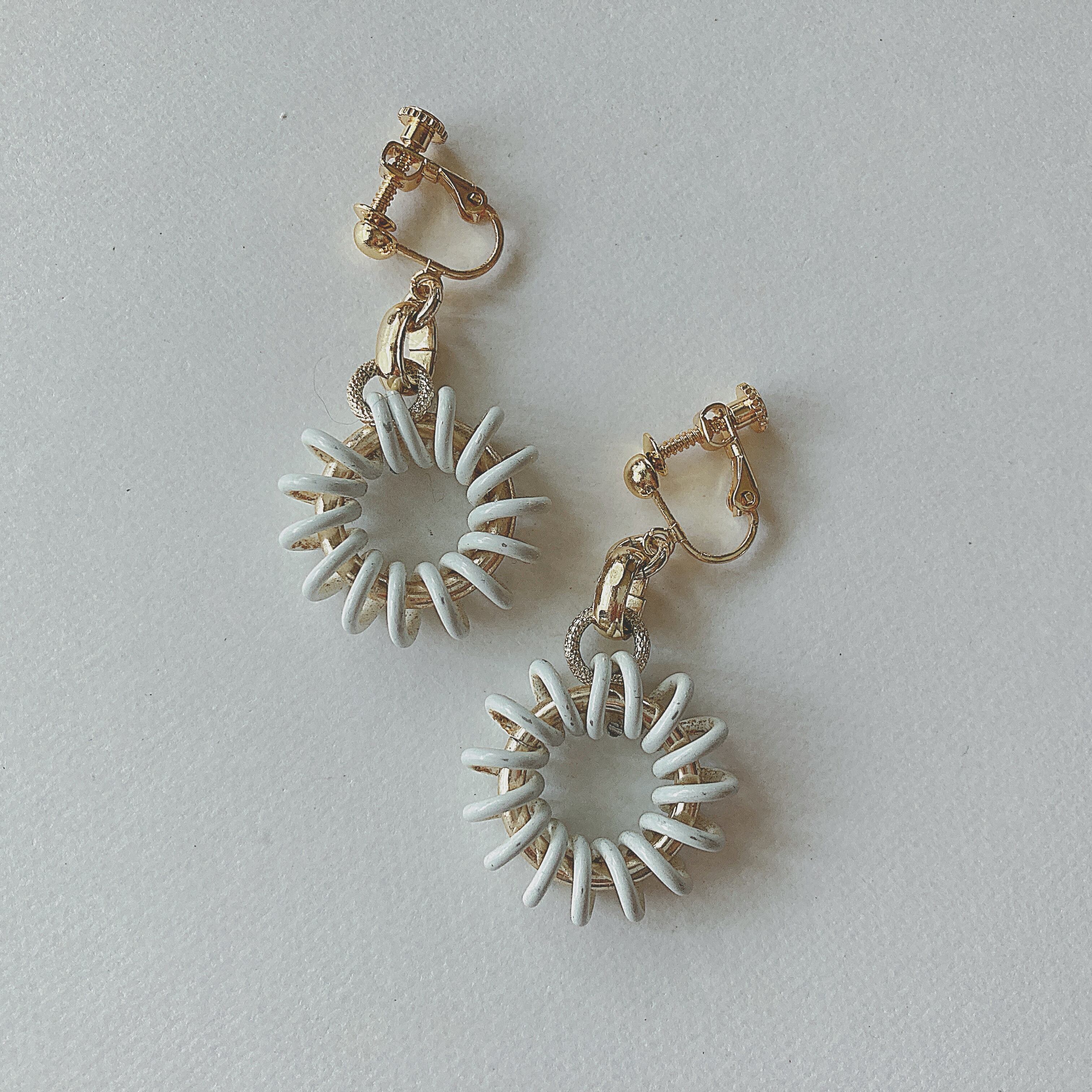 更にゴールドのフープの周りには、白のエナメルで色付けしたパーツがぐるぐると巻き付けてあり、昔の電話のコードのよう。