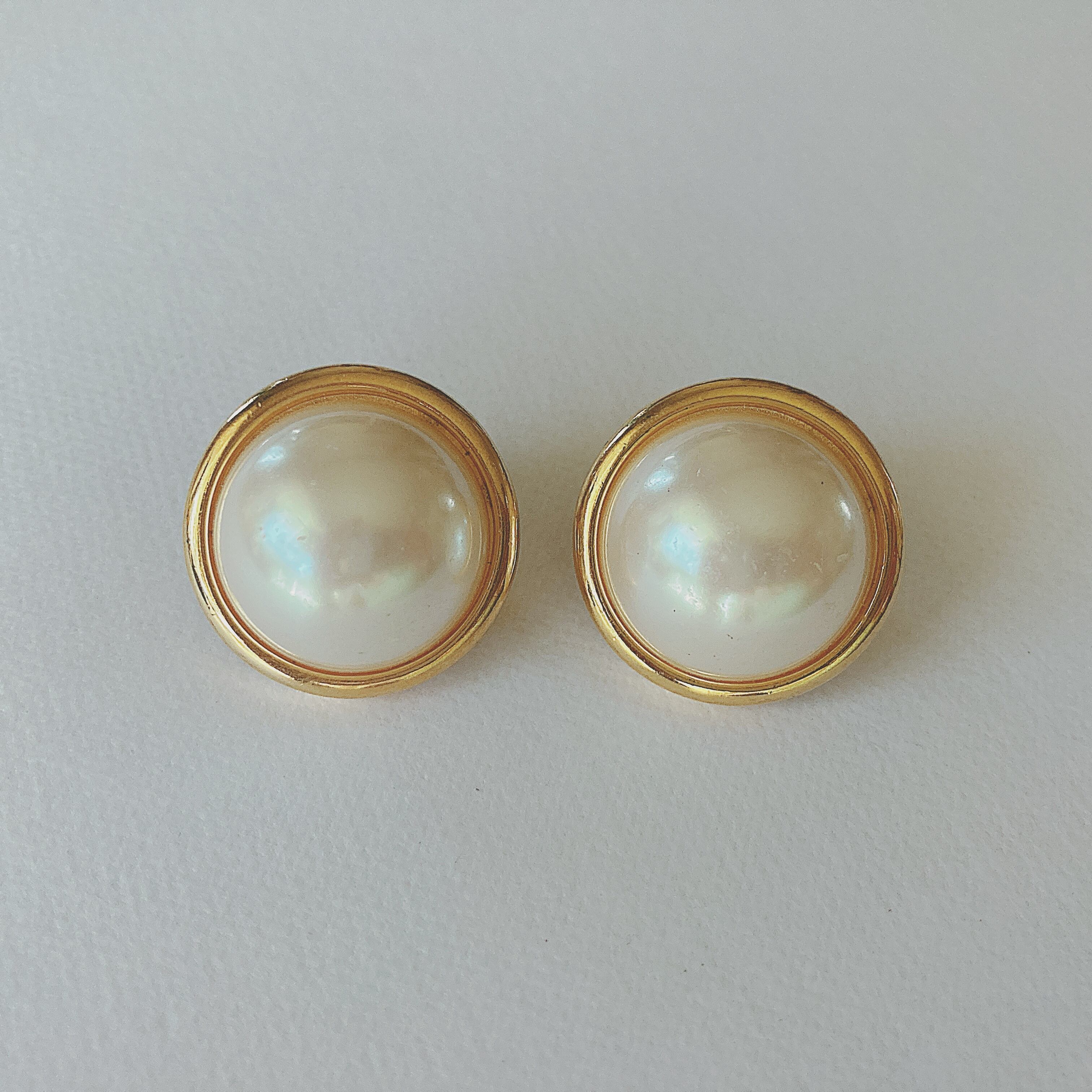 MARVELLA Vintage gold tone faux pearl cabochon earrings ヴィンテージ マーベラ ゴールドトーン フェイクパール カボション ピアス b1411 | OBAKEPEACH