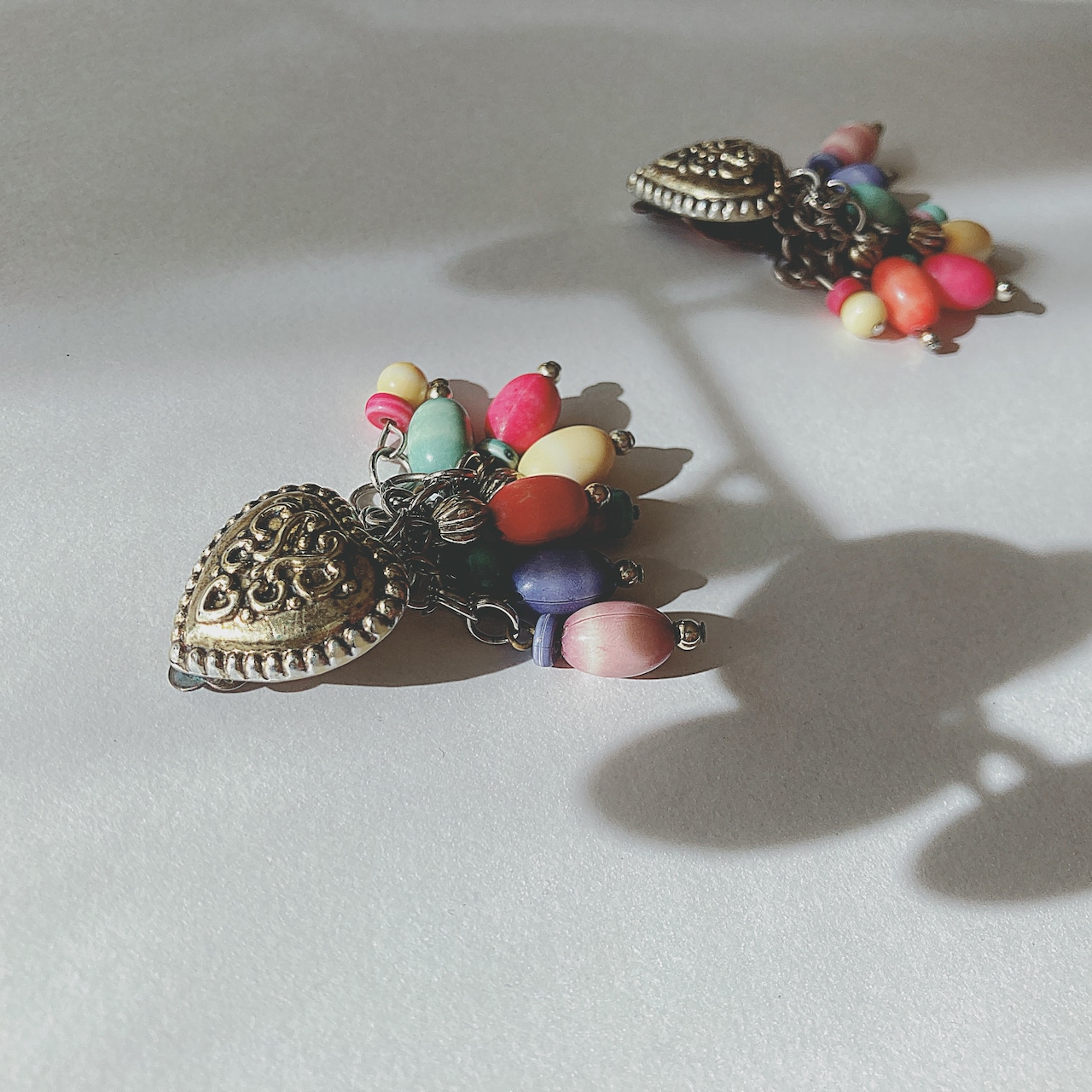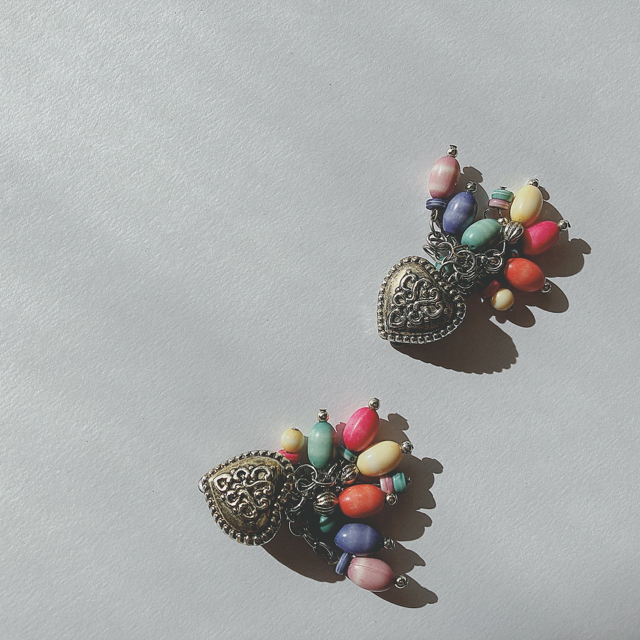 ハートを逆さにしたような土台に、カラフルなビーズがじゃらじゃらとぶら下がっています。