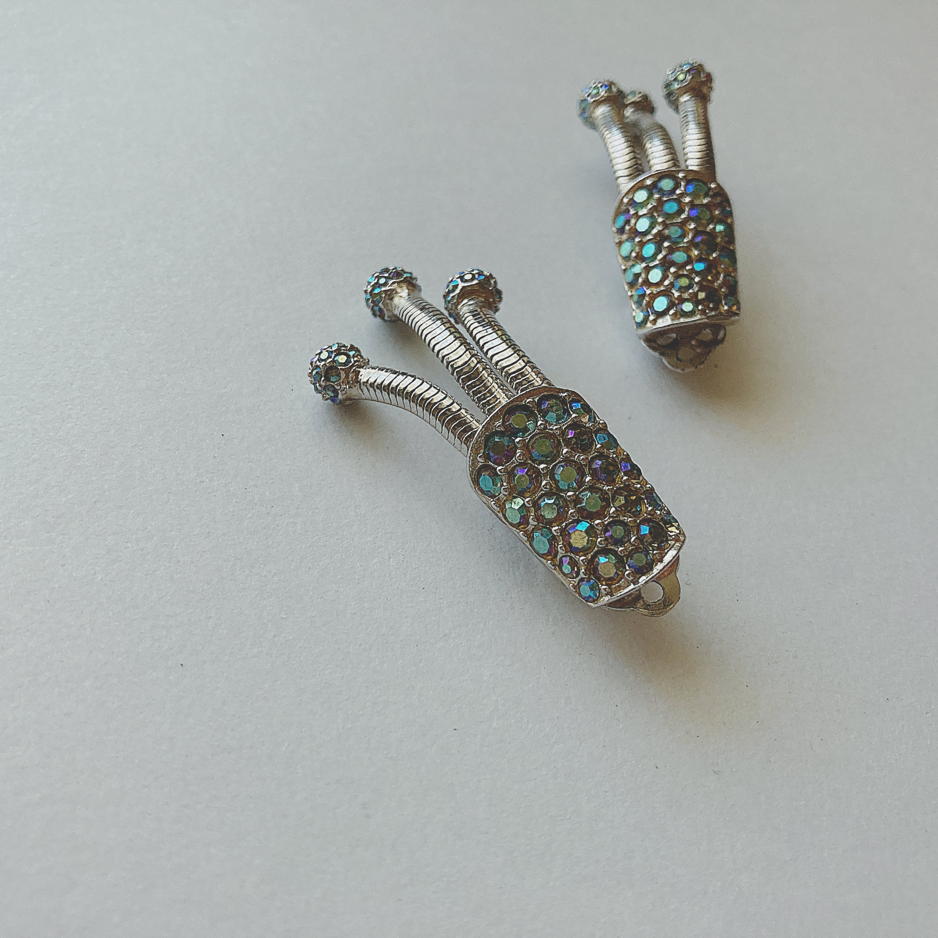シルバーメタルの土台にブルーのラインストーンを敷き詰めたダングルタイプ。