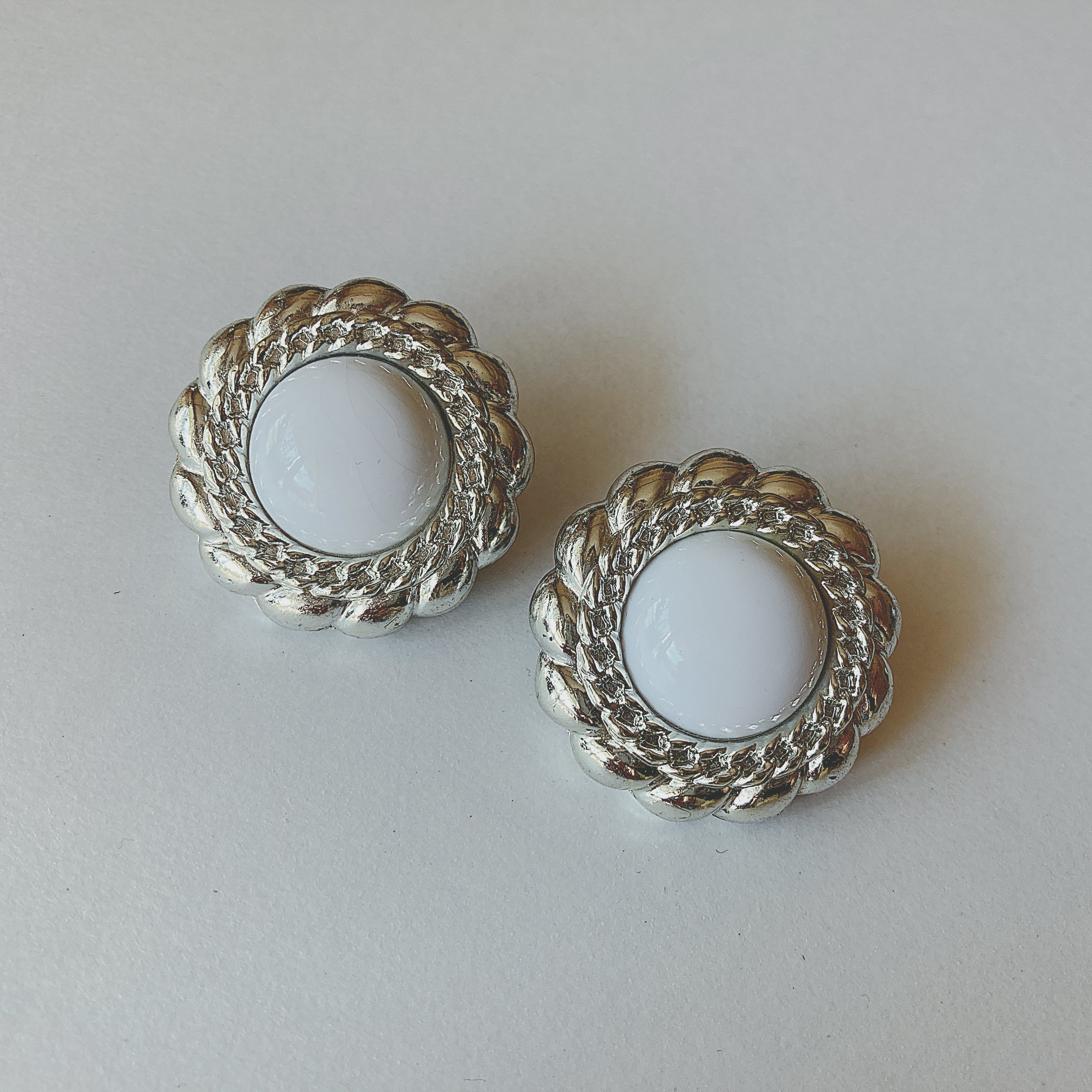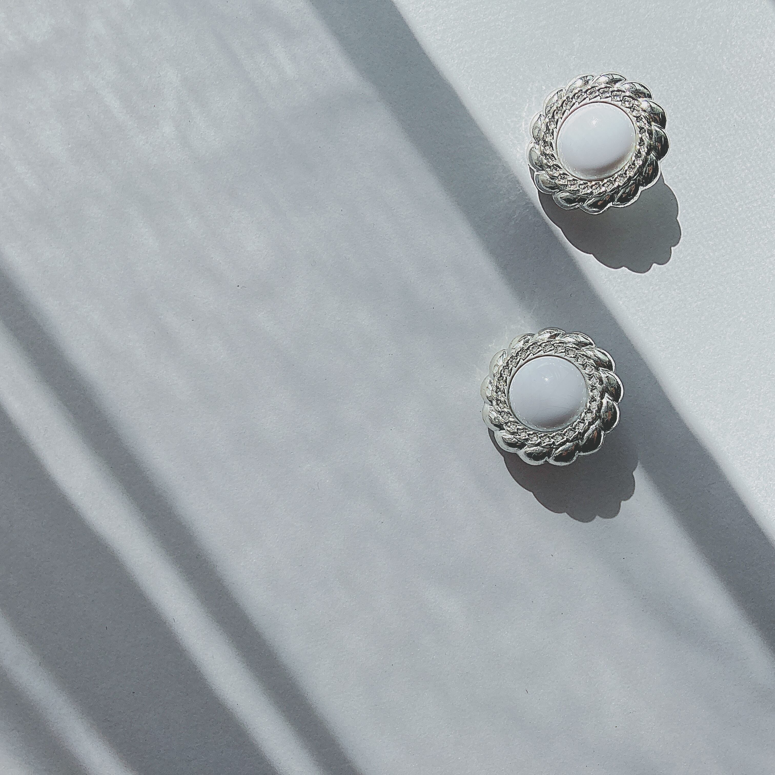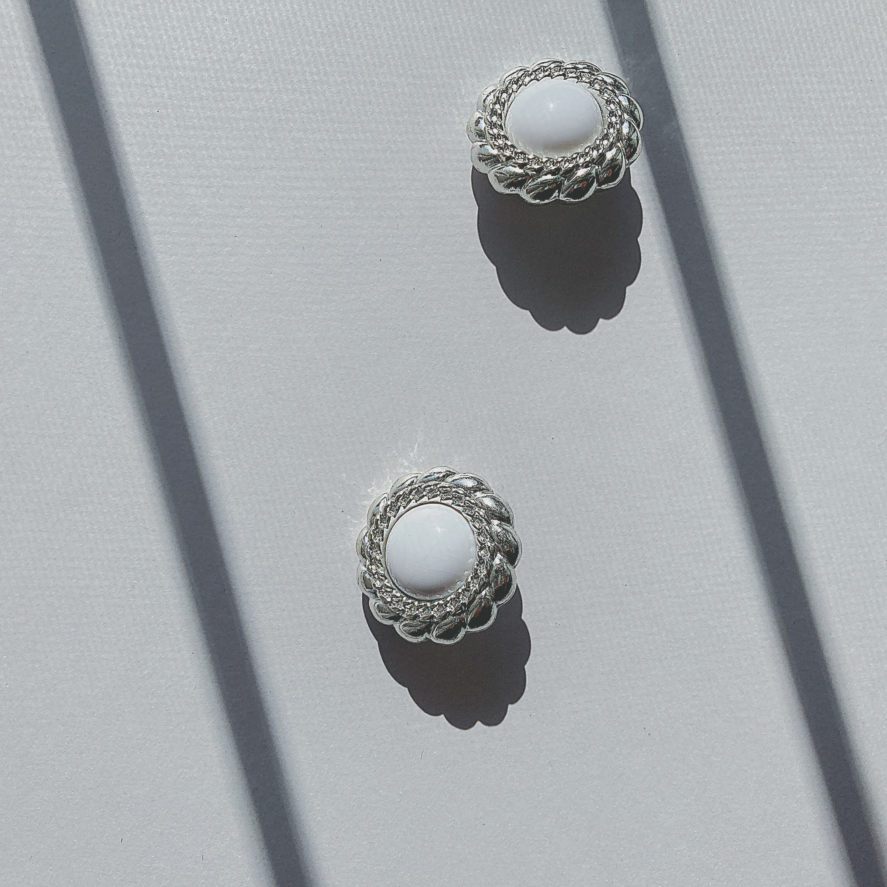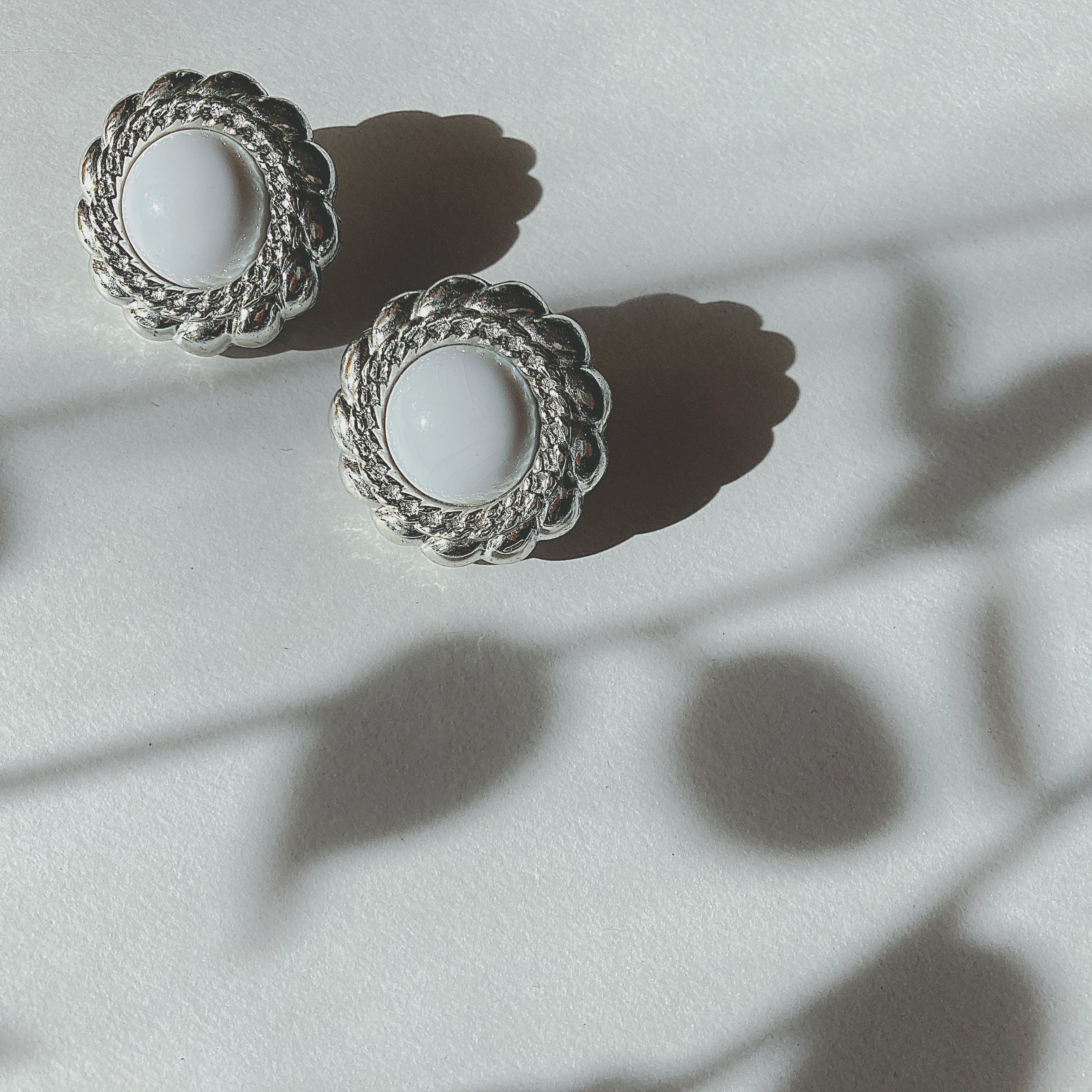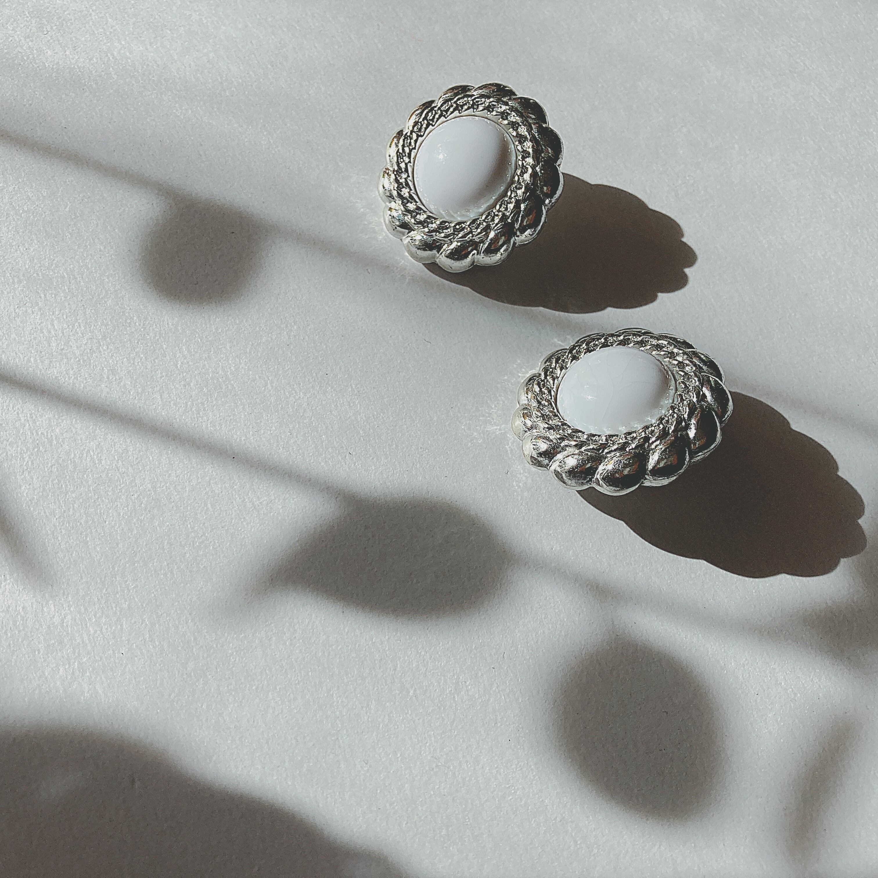 Vintage silver tone white plastic cabochon earrings ヴィンテージ シルバートーン ホワイト プラスチック カボション イヤリング b2565 | OBAKEPEACH