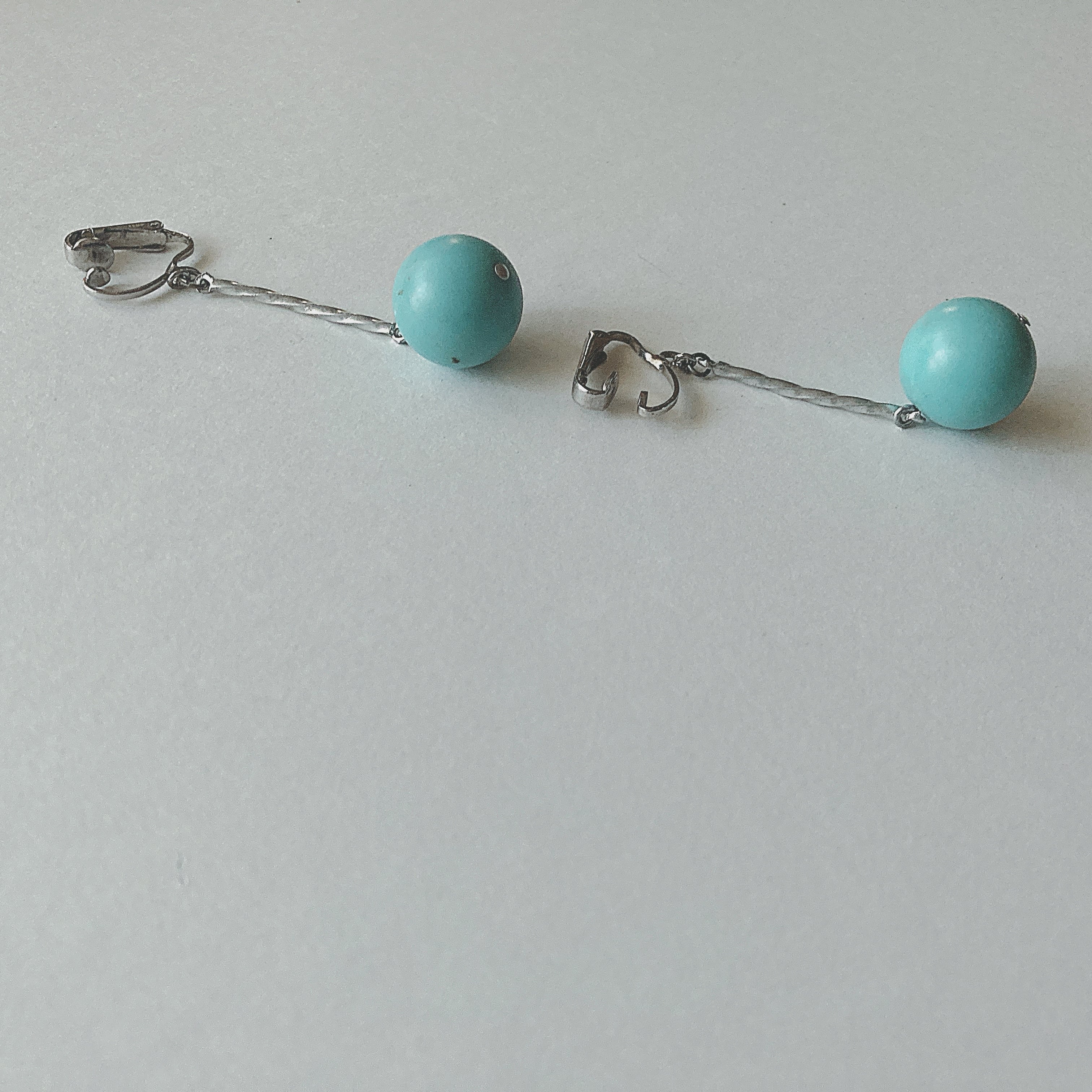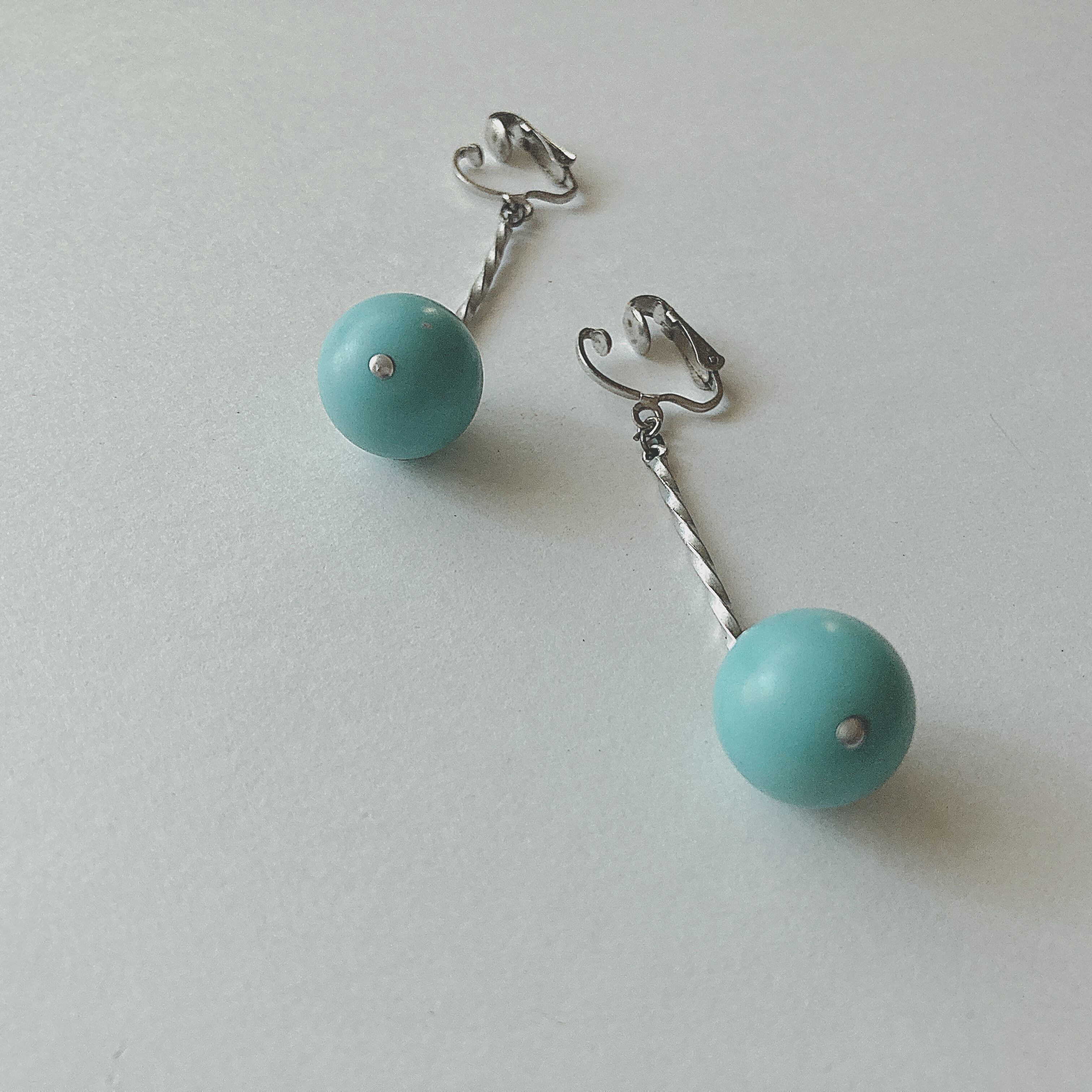 シルバーメタルの捻れた細長いパーツに、ブルーのプラスチックのビーズをぶら下げたデザイン。