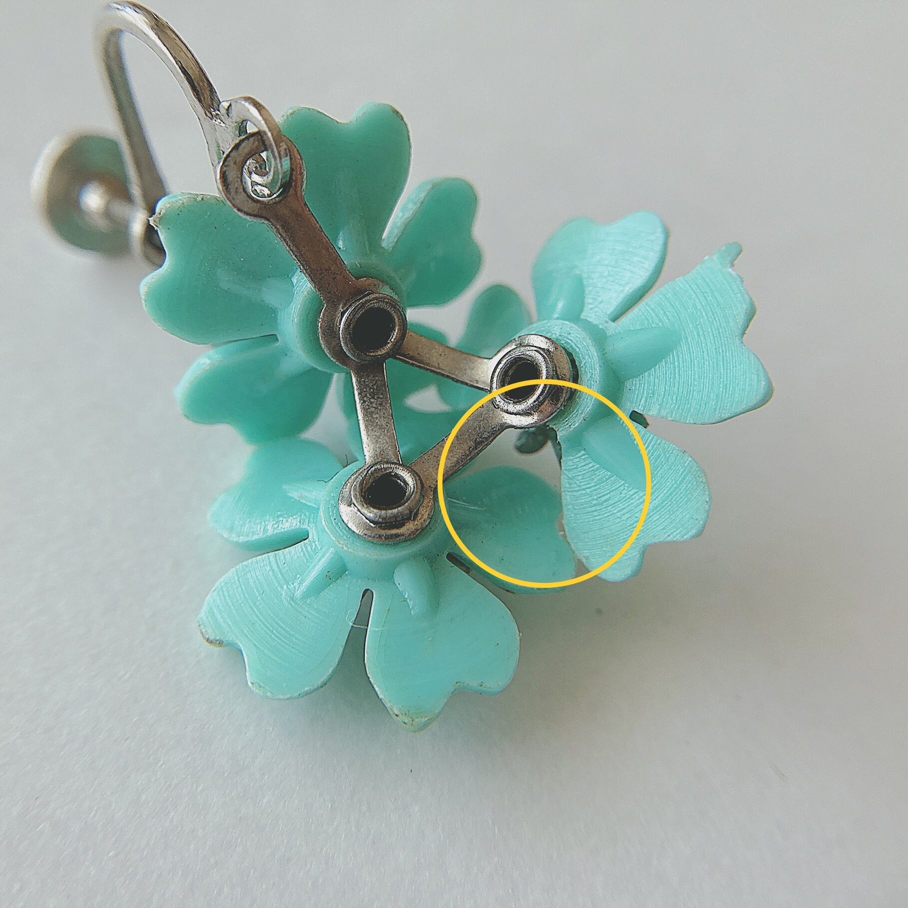 Vintage 50s - 60s emerald green plastic flower clear rhinestone dangle earrings ヴィンテージ 50年代 - 60年代 エメラルドグリーン プラスチック クリア ラインストーン フラワー 花 ダングル イヤリング b2469 | OBAKEPEACH