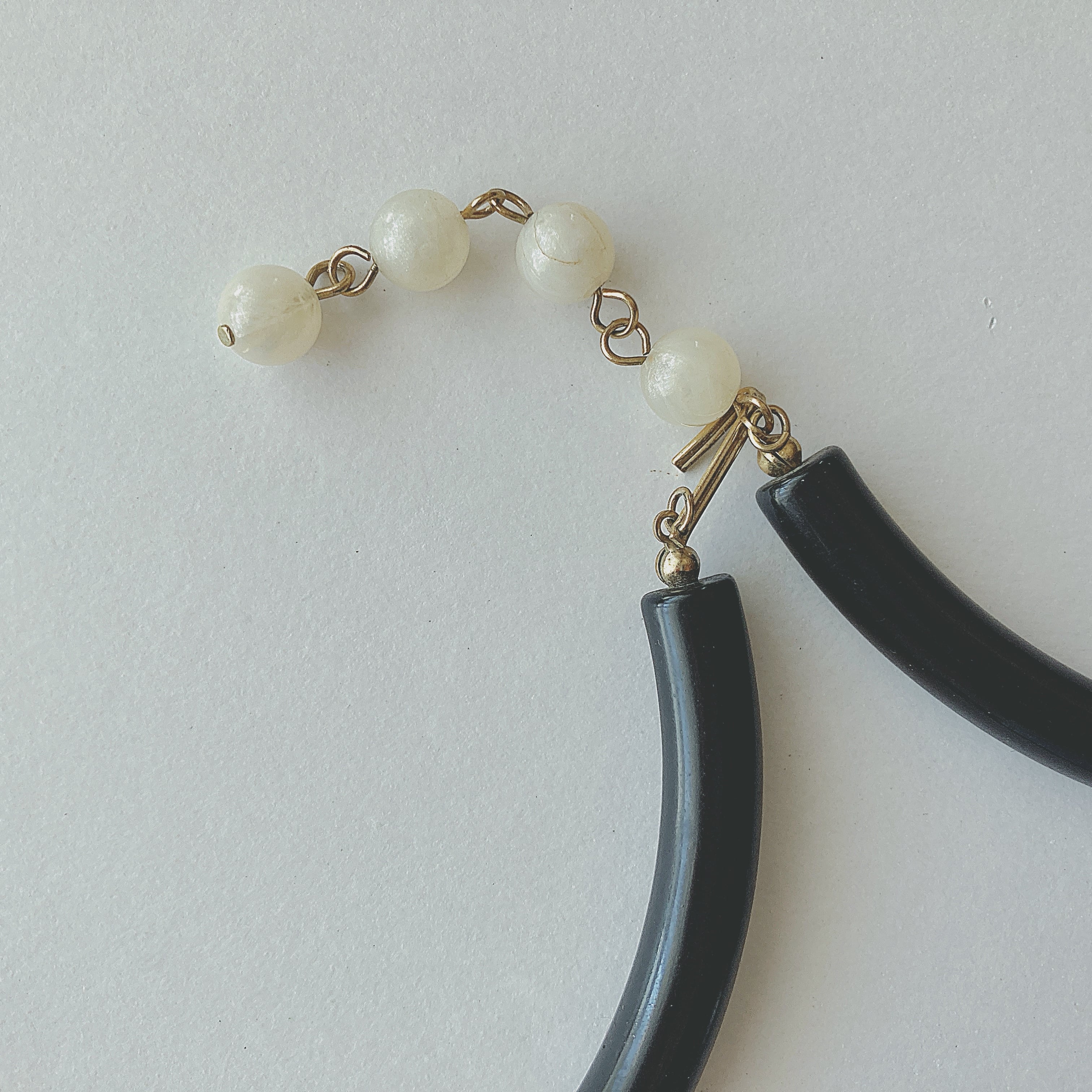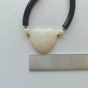 クリーミーなアイボリーのハートと、マカロニのような細長く湾曲した黒のビーズと組み合わせています。