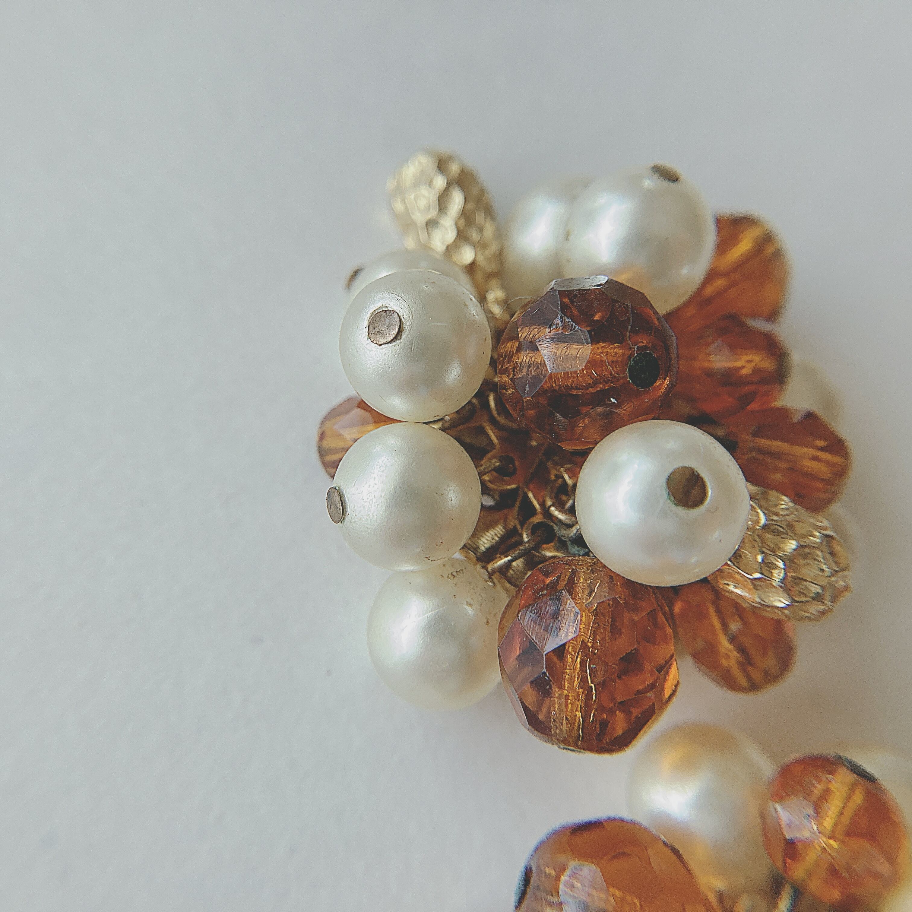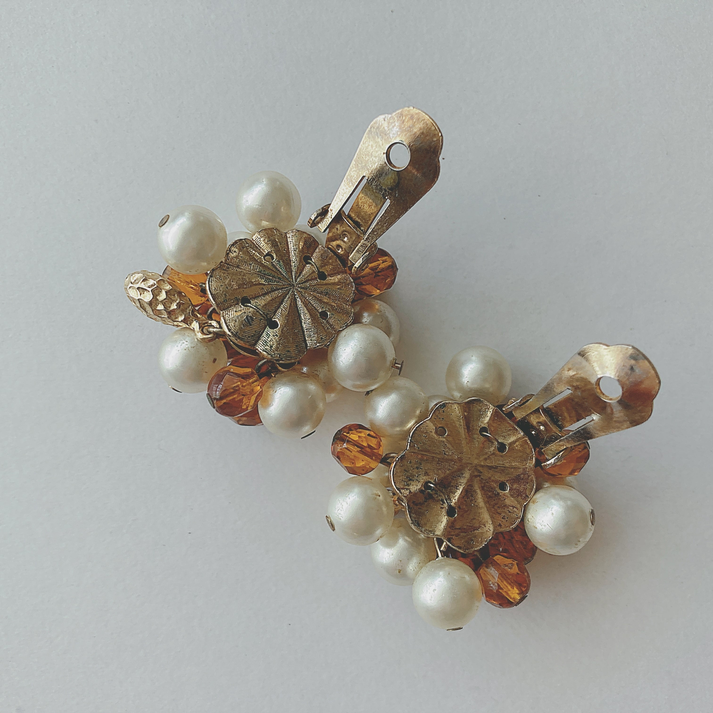 MARVELLA Vintage 50s - 60s faux pearl orange amber gold beads cluster cha cha earrings ヴィンテージ 50年代 - 60年代 フェイクパール オレンジ アンバー ゴールド ビーズ クラスター イヤリング b2399 | OBAKEPEACH