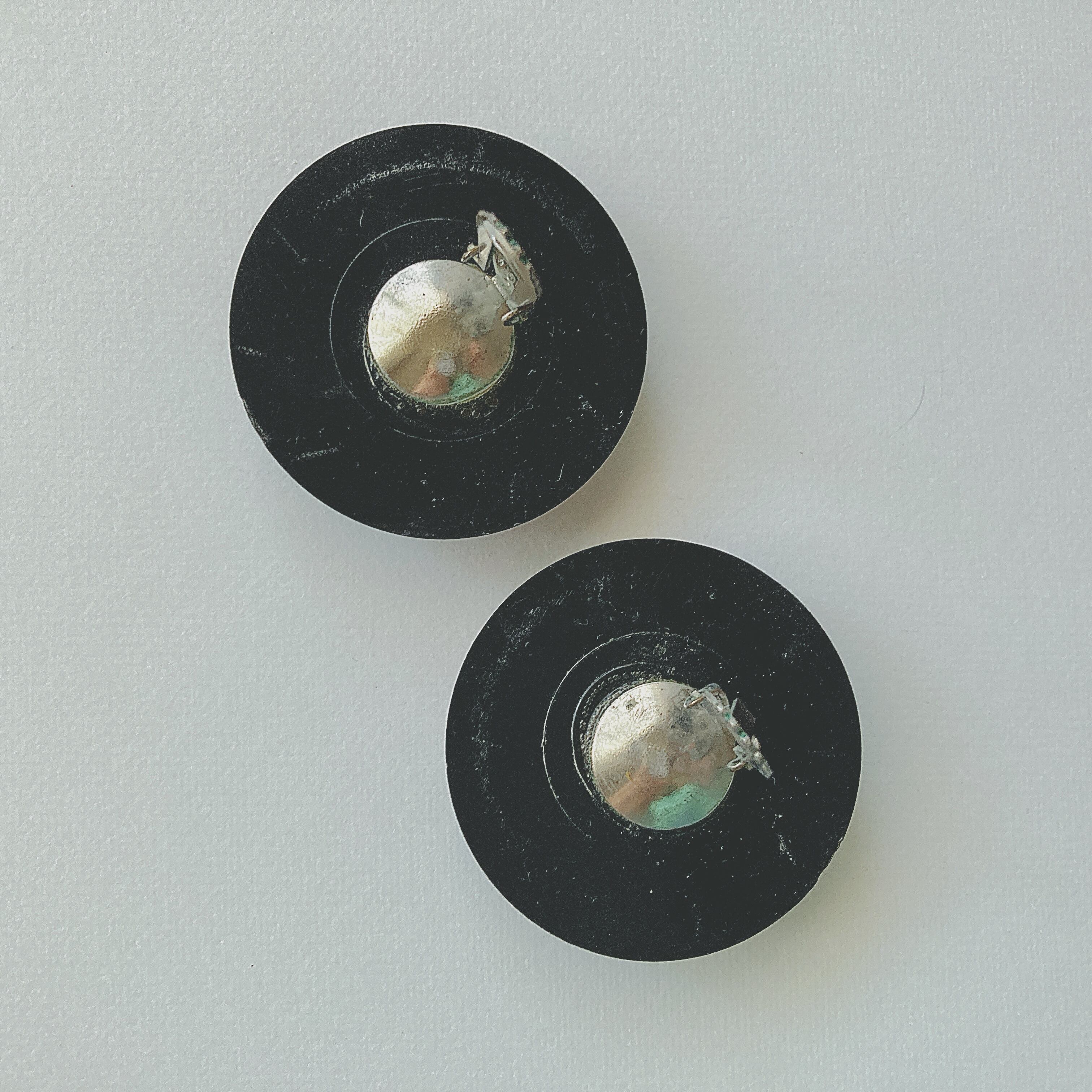 Vintage black plastic white flower clear rhinestone circle earrings ヴィンテージ ブラック ホワイト プラスチック フラワー 花 クリア ラインストーン 丸型 イヤリング b2442 | OBAKEPEACH